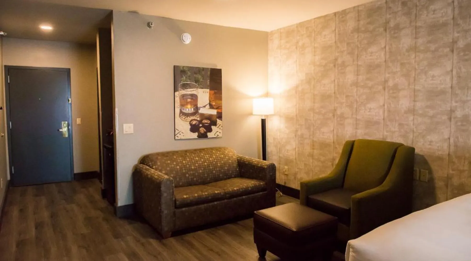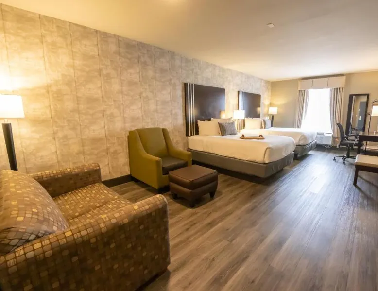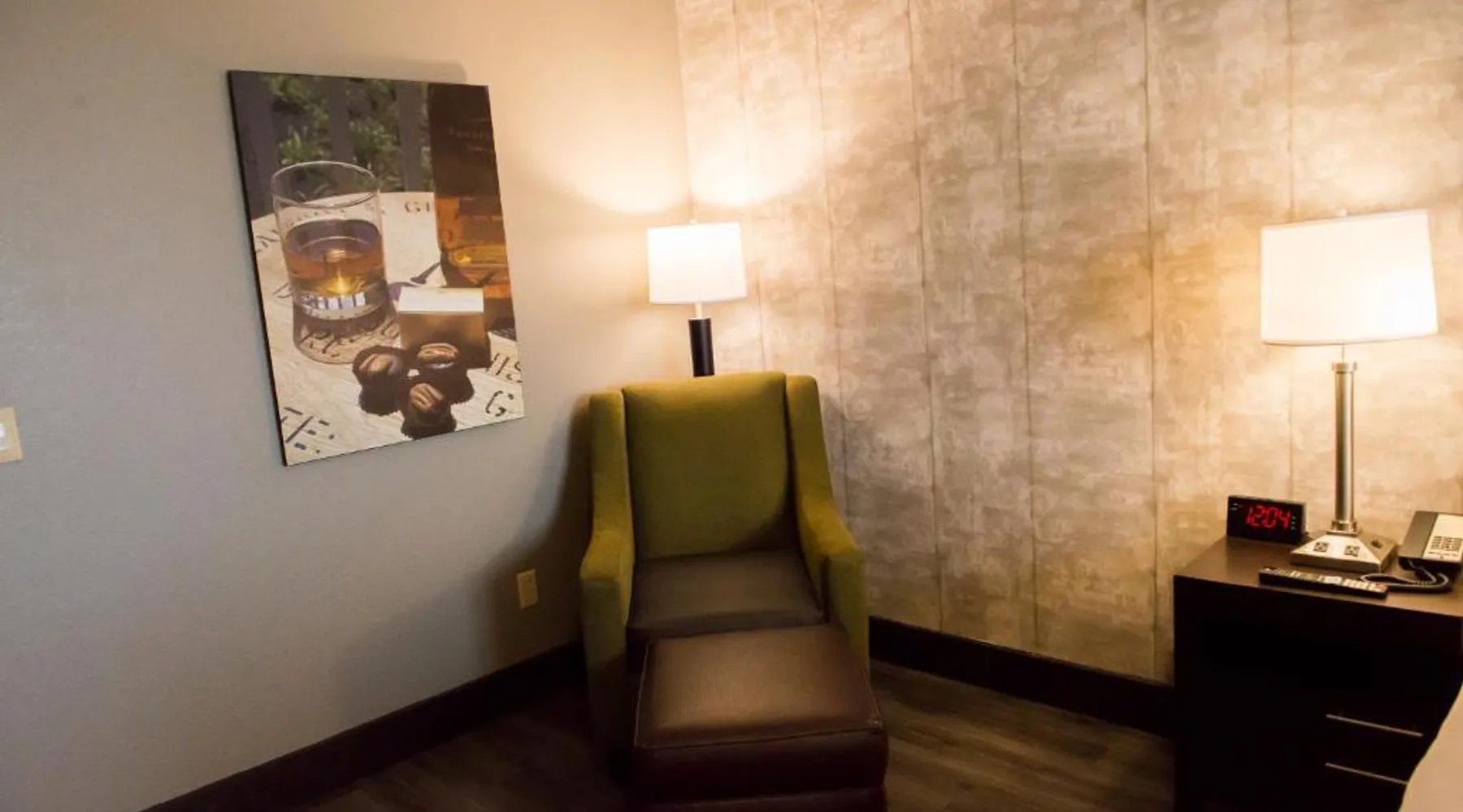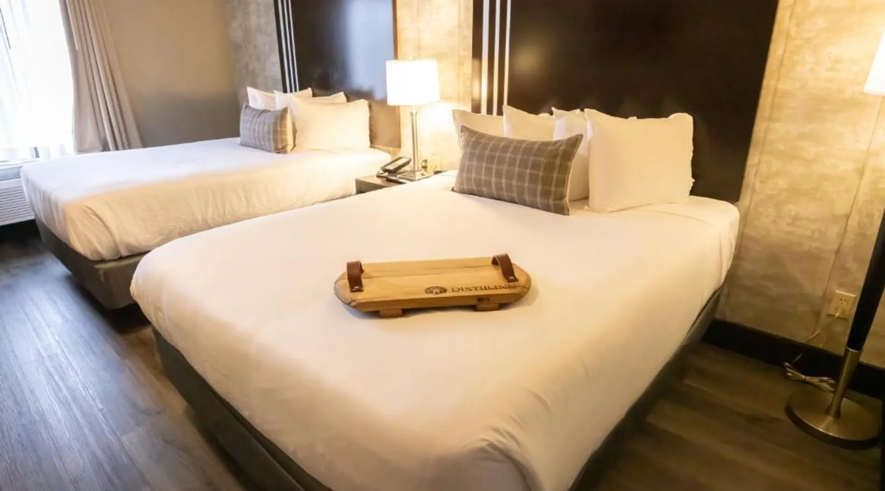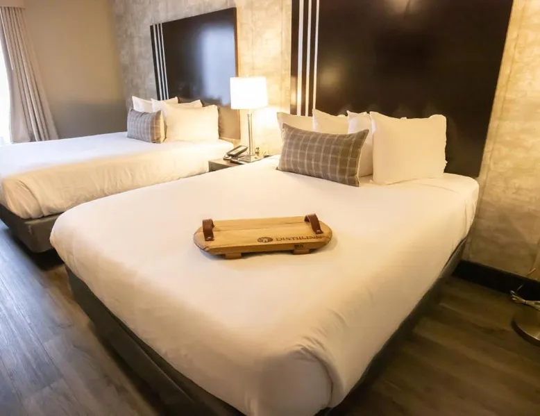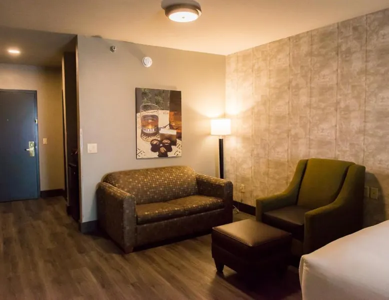 Comfortable Accommodations: Distill-Inn in Bardstown offers 3-star rooms with air-conditioning, private bathrooms, and free WiFi. Each room includes a tea and coffee maker, hairdryer, and work desk. Exceptional Facilities: Guests can enjoy a bar, coffee shop, and outdoor seating area. Additional amenities include a child-friendly buffet, express check-in and check-out, and free on-site private parking. Delicious Breakfast: A continental and American buffet breakfast is served daily, featuring warm dishes, fresh pastries, pancakes, cheese, fruits, and juice. Prime Location: Located 32 mi from Louisville International Airport, the hotel is near attractions such as My Old Kentucky Home State Park (3.1 mi) and Elizabethtown City Park (27 mi). Cycling activities are available. This suite features 1 living room, 1 separate bedroom and 1 bathroom with a bath and free toiletries. The air-conditioned suite features a flat-screen TV with cable channels, a tea and coffee maker, parquet floors and heating. The unit has 2 beds.