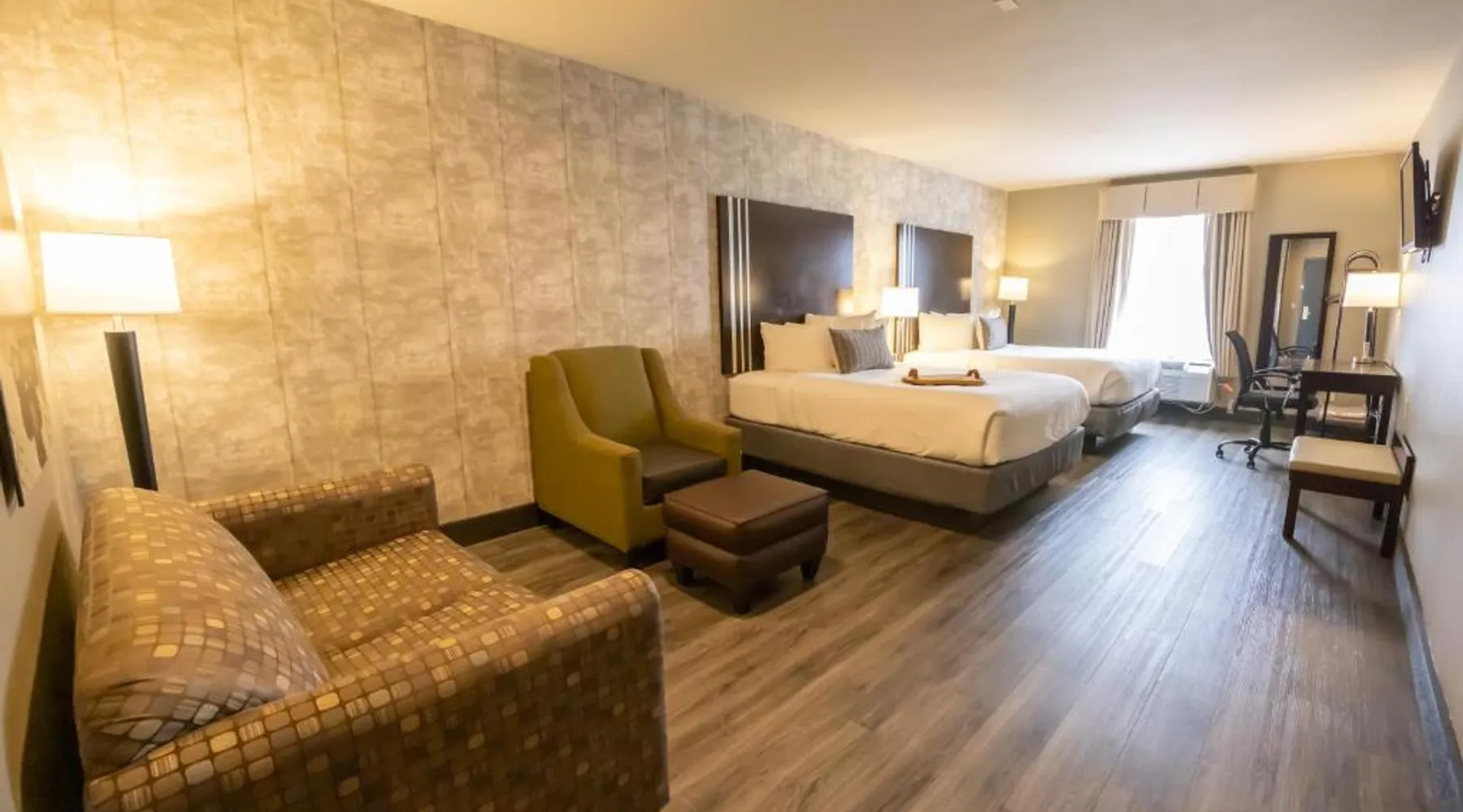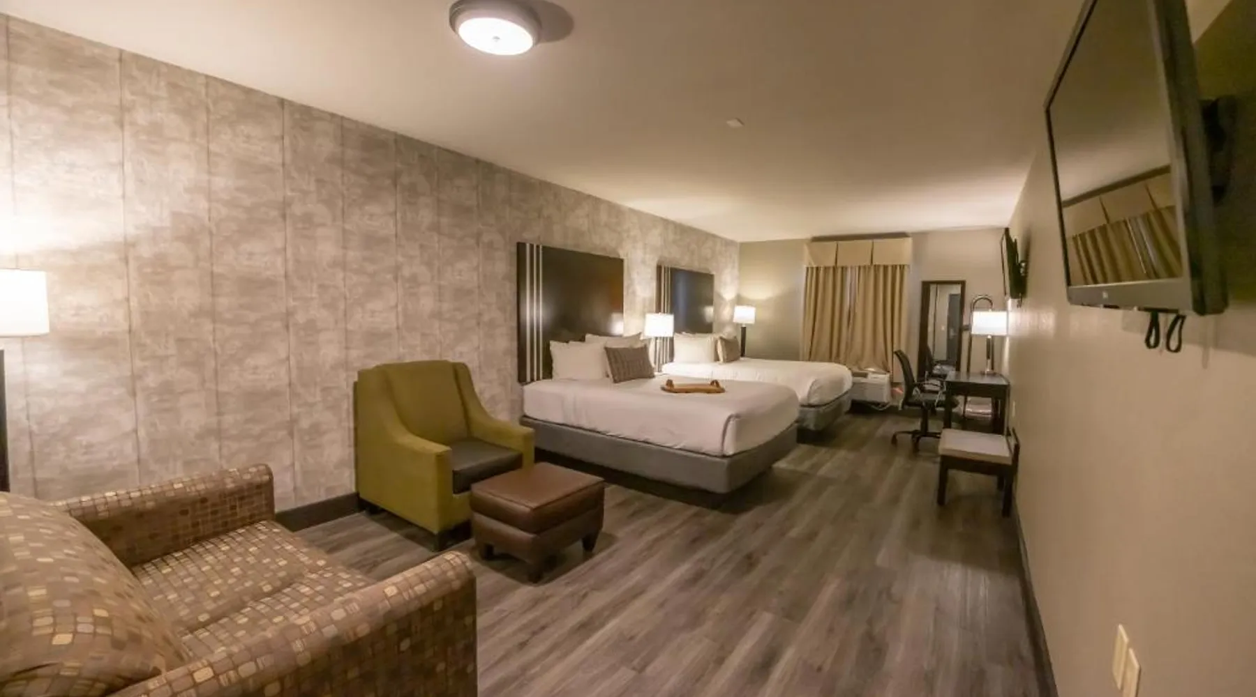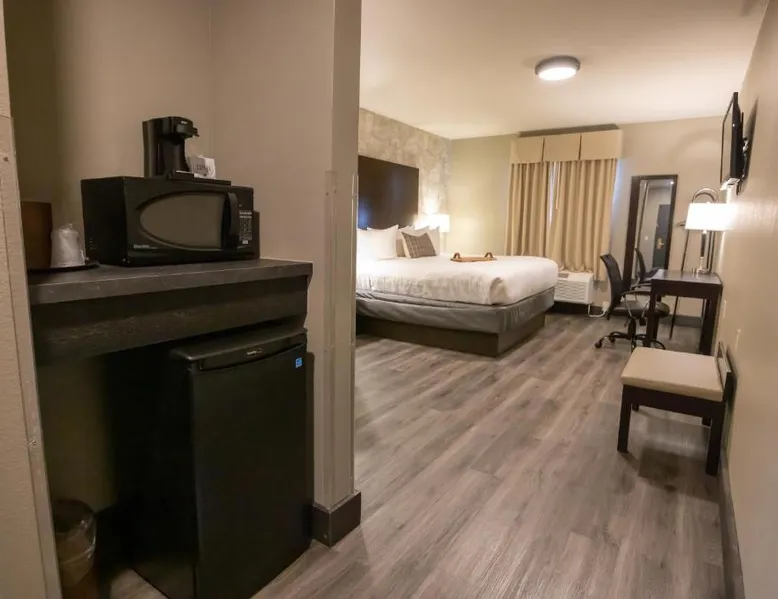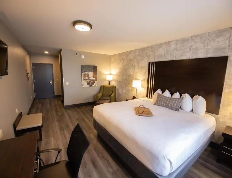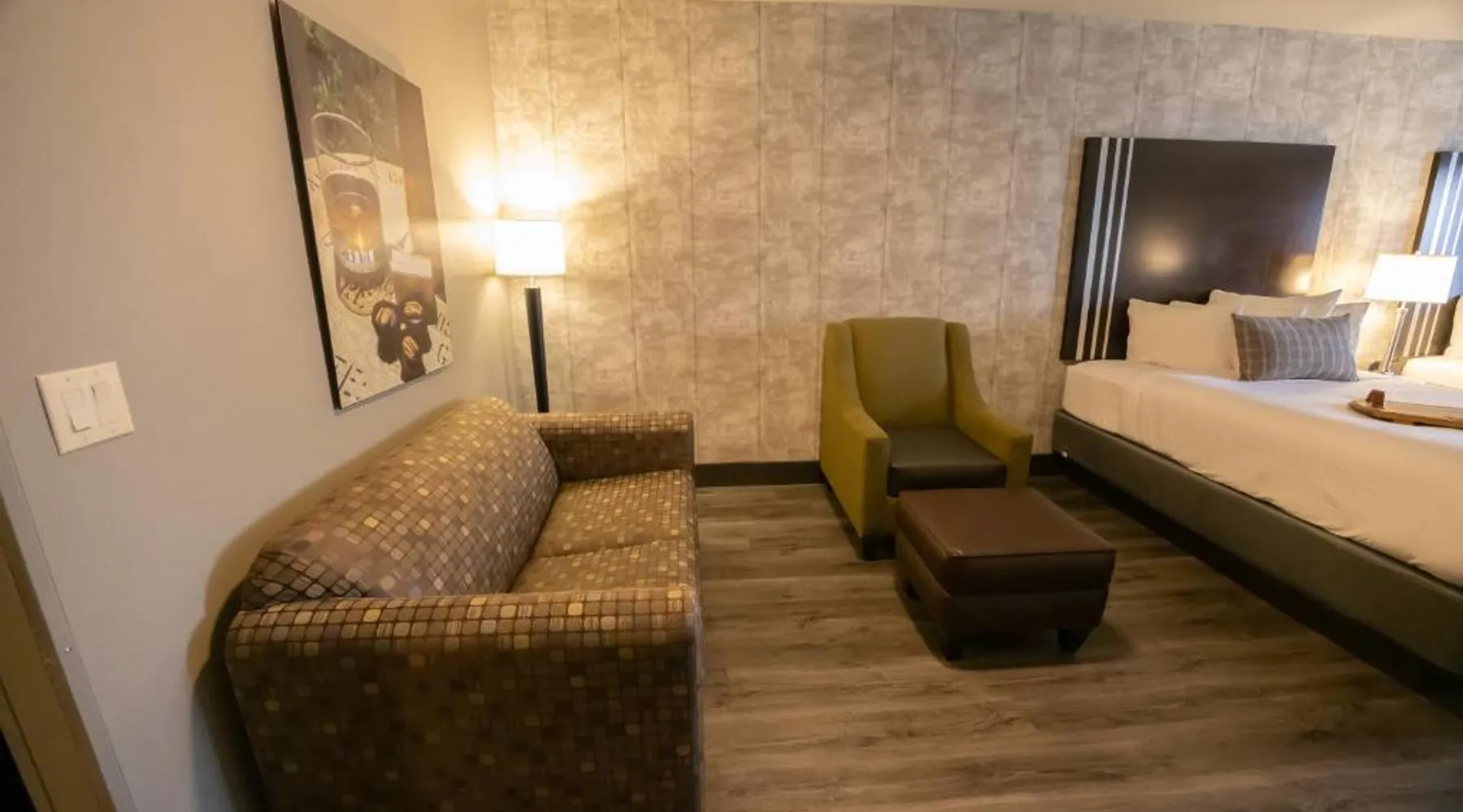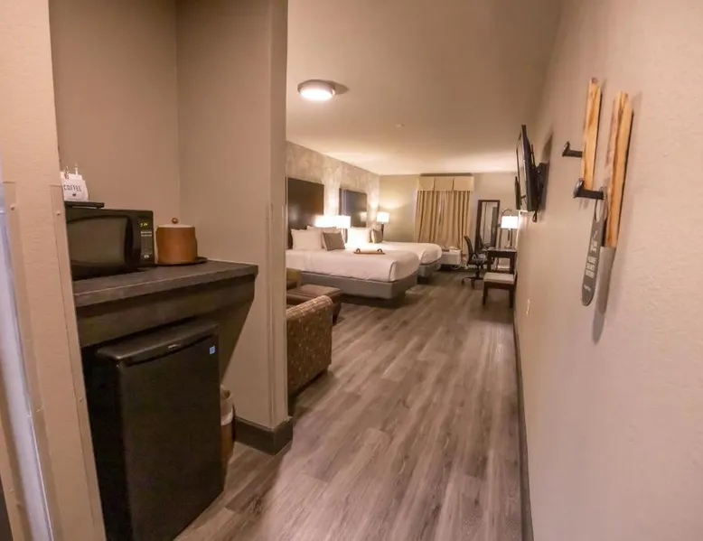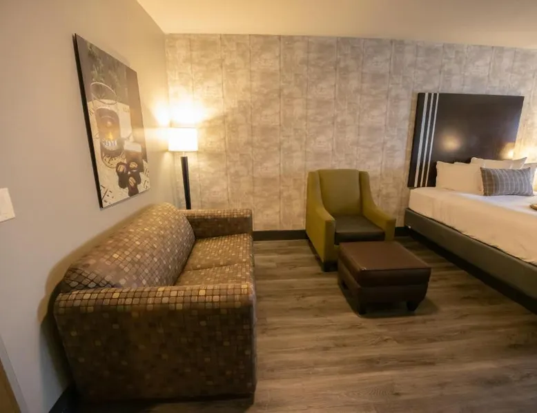 Comfortable Accommodations: Distill-Inn in Bardstown offers 3-star rooms with air-conditioning, private bathrooms, and free WiFi. Each room includes a tea and coffee maker, hairdryer, and work desk. Exceptional Facilities: Guests can enjoy a bar, coffee shop, and outdoor seating area. Additional amenities include a child-friendly buffet, express check-in and check-out, and free on-site private parking. Delicious Breakfast: A continental and American buffet breakfast is served daily, featuring warm dishes, fresh pastries, pancakes, cheese, fruits, and juice. Prime Location: Located 32 mi from Louisville International Airport, the hotel is near attractions such as My Old Kentucky Home State Park (3.1 mi) and Elizabethtown City Park (27 mi). Cycling activities are available. This suite features 1 living room, 1 separate bedroom and 1 bathroom with a bath and free toiletries. The air-conditioned suite features a flat-screen TV with cable channels, a tea and coffee maker, parquet floors and heating. The unit has 2 beds.