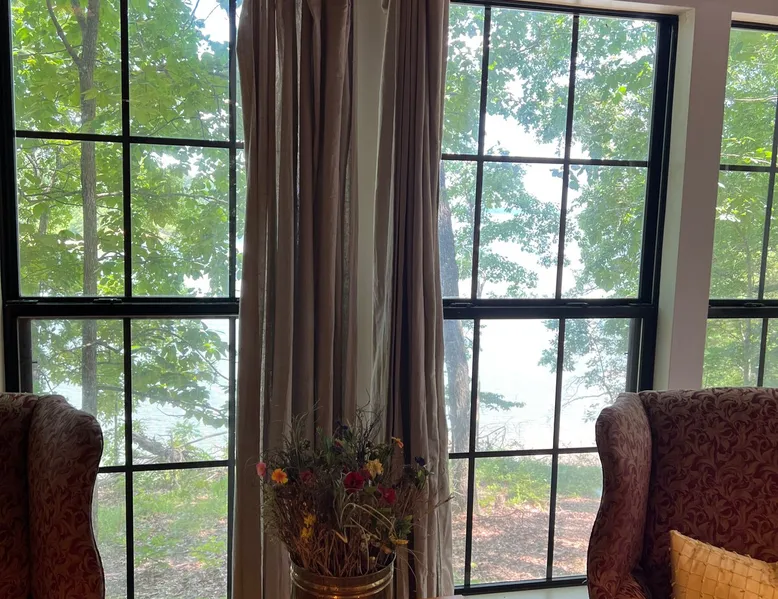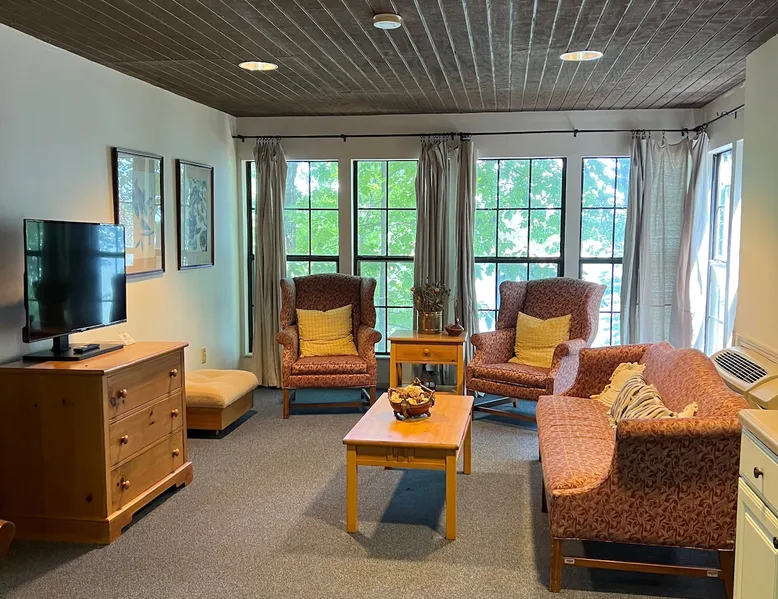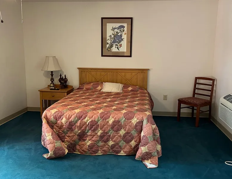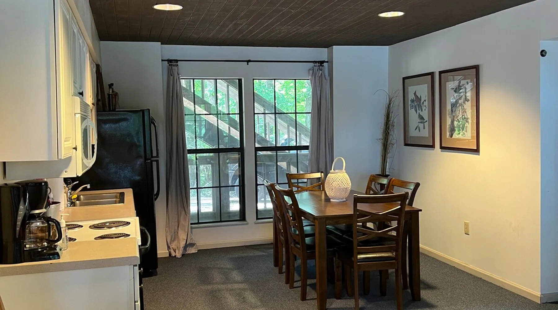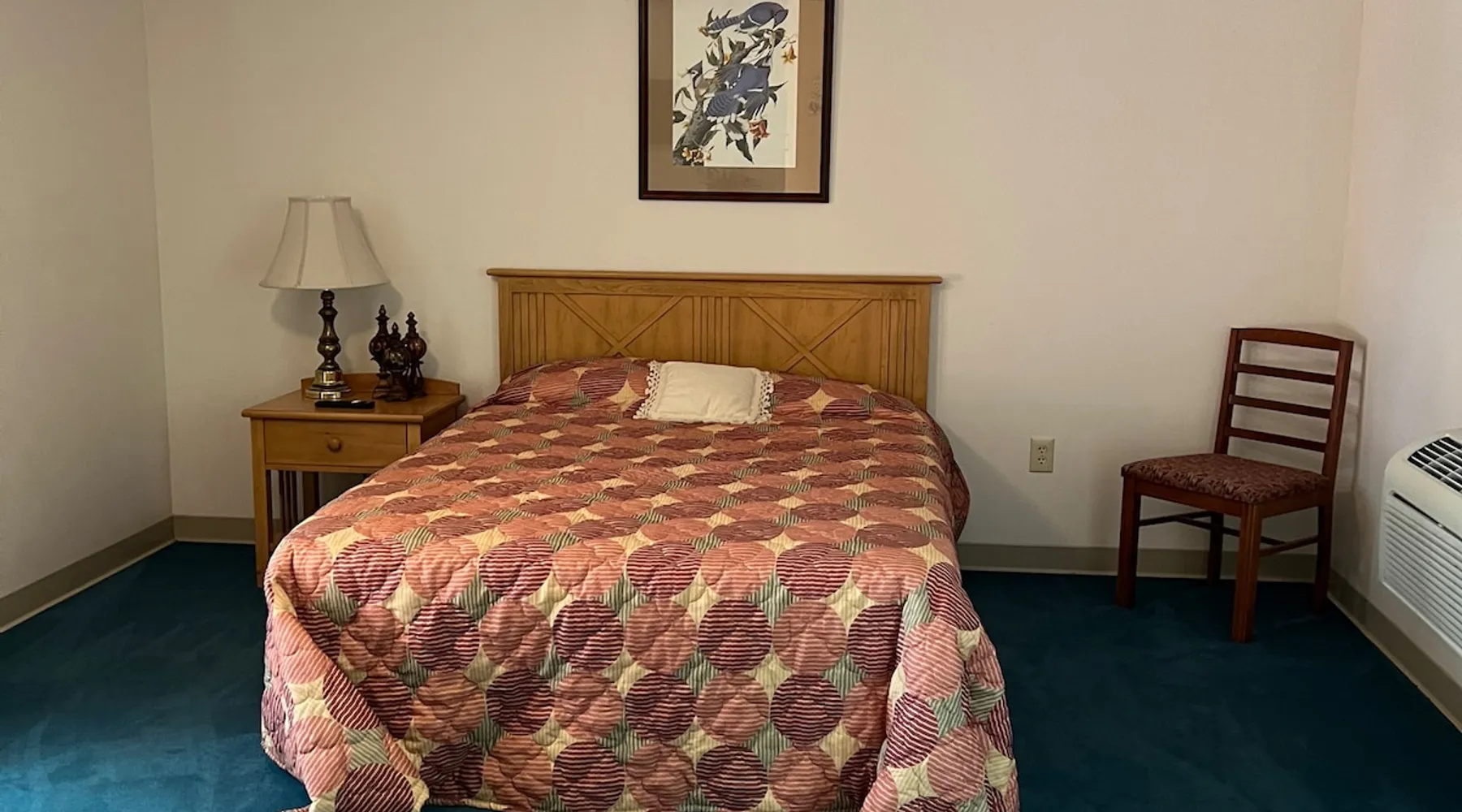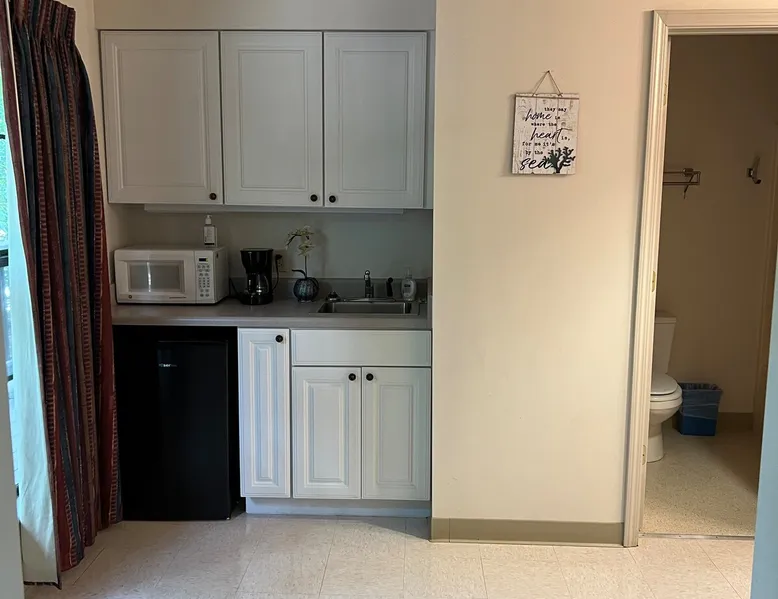 Relax with the whole family at this peaceful place to stay. 1 queen bed with a bathroom and small kitchen. Each room has a television Included in each room is a coffee maker, cups, plates, silverware, refrigerator, sink, and microwave. There is a fully stocked common area with a den with a television and full kitchen with table to seat 8 people. Each room and the common area you enter from the outside. There is a beach swimming area nearby and the marina is 5 mins away