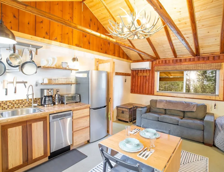 No matter what your sport - hiking, fishing, mountain climbing, skiing or snow boarding - Half-Pipe Hideaway is the perfect spot for your base of operations. The space ABOUT HALF-PIPE HIDEAWAY With this cabin being so close to the snowy mountains, we're calling all skiers and snowboarders to come stay so they have a place to escape to after a fun day on the slopes. This cozy spot will comfort a single skier or a small group of friends. Just a few minutes drive from downtown Packwood, Half-Pipe Hideway is surrounded by miles of trails in the Tatoosh Wilderness. It's only 35 minutes from the White Pass ski area and just a half and hour from the Stevens Canyon Entrance to Mount Rainier National Park. Should Mount St. Helens beckon, you'll find that's also an enjoyable day trip from this cabin. Whether you're looking to explore the wilderness, see elk around town (or, possibly, in the front yard), fish for trout, hike or ski at a world renowned ski resort, this is the place for you. Situated among beautiful trees, this cabin is a nature lover’s paradise. The interior emulates the same style of mountain-inspired beauty that you’ll find outside, but with a modern twist. The home opens up into the well-lit living room, with a cozy fireplace, an artistically crafted antler chandelier, a large, flat-screen TV and plenty of seating area. The wood accents illuminate the space with a warm light. You'll also find a dining area and the kitchen, giving it the cozy quaintness that's perfect for two to four guests. The cottage has a comfy, queen-sized bed with a full bath and washer and dryer. The living room sofa opens to a queen-sized sleeper to accommodate two more. WHAT GUESTS HAVE TO SAY “The cabin is cute, cozy and just five minutes from town, so going for for groceries and supplies is no big deal. The firepit in the back yard is a fun way to relax with friends or family.” – Debbie "This cabin is a great little base camp for outdoor activities all year round. This area is like a road trip to heaven." – Trina MORE ABOUT HALF-PIPE HIDEAWAY The kitchen space contrasts perfectly with the rustic style of the rest of the cabin by having innovative appliances, black vine maple cabinets and laminate counters. You’ll find all the pots, pans and dinnerware you will need for a hearty breakfast or relaxing evening meal. The location of this home is perfect for the outdoor enthusiast, who'll find access to myriad outdoor sports -- including skiing, snowboarding, snowshoeing, fishing, boating, plus going rock-hounding in nearby mineral deposits or panning for gold. Up to two dogs are welcome with our standard, per dog, per night fee. ABOUT PACKWOOD & THE MOUNT RAINIER AREA When booking any of our Packwood properties, you'll have access to some of the most exciting adventures in the state of Washington. From Half Pipe Hideaway, you're just 30 minutes away from White Pass Ski Resort. Mount Rainier National Park beckons, where you can enjoy scenic drives, hiking and wildlife. There are 100's of lakes and streams in the area. You'll also have access to Mount St. Helen, Mount Adams, Goat Rocks Wilderness, Tatoosh Wilderness, William O'Douglas Wilderness and the Gifford Pinchot National Forest. Not only is it close to a great many outdoor areas, but nearby Packwood also features homey restaurants, fun taverns and pubs. And, twice a year, the Packwood Flea Market, a popular event for treasure hunters, packs the town. THE PACKWOOD PROPERTIES PROMISE Packwood Properties Vacation Rentals is the only full-stack vacation rental management company in the area. We vow to make booking with us simple and exciting. We know that booking a rental property home for your vacation can be unfamiliar territory for some, while others know their way around it. Because we know this, we ensure that each of our properties is up to high-quality standards. We do our absolute best to provide support to our guests when booking. We are available to assist you every day of the year if you have any questions or concerns before, during or after your visit to our home. We have on-site property management available 24/7 for anything concerning that may arise. MANAGED: Property requires good behavior and adherence to instructions, house rules, terms, conditions, onsite instructions, and may require online registration, accidental damage protection, and electronic signature before final booking confirmation, or you may cancel before proceeding at that time. Instruction including access will be sent by email. Phones open 9am to 7pm every day. Unless otherwise arranged, check-in is between 5 and 7pm and check-out is before 11am. If dogs are allowed, they must be approved in advance, with a quantity, weight limit, and a per-dog, per-day fee. Due to government and owner requirements, occupancy may never exceed the number of registered guests, dogs and vehicles. Drop-in guests are not allowed. For security, there may be outwardly facing security cameras, capable of constant recording, and interior decibel meters to monitor noise. Bookings over 30 days or longer are with Prospera VIP.