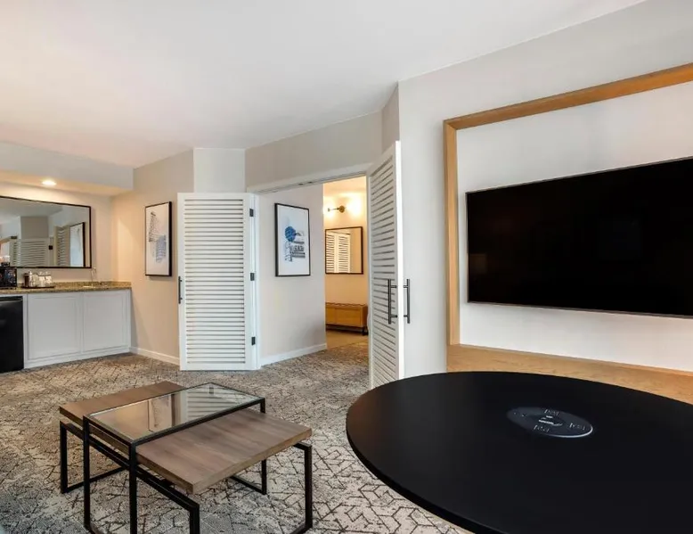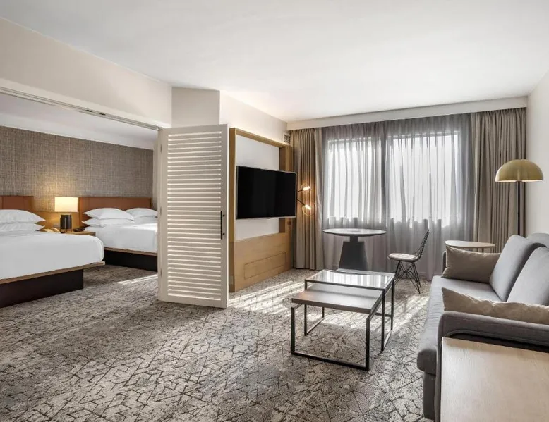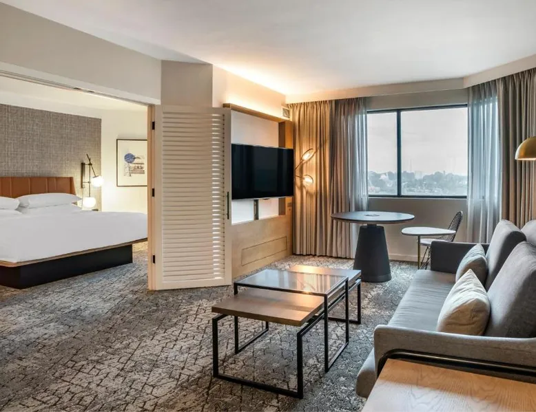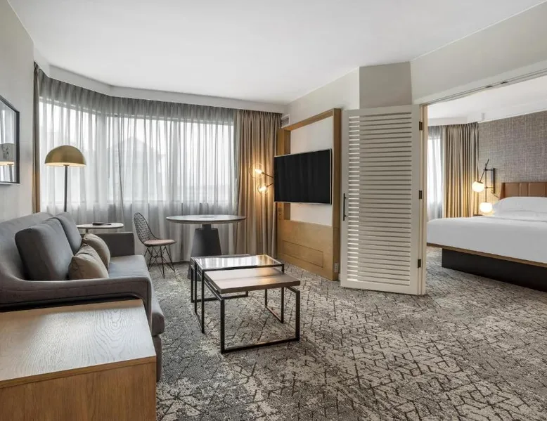Comfortable Accommodations: Sheraton Suites Wilmington Downtown in Wilmington offers family rooms with private bathrooms, air-conditioning, and kitchenettes. Each room includes a sofa, shower, and hairdryer. Dining and Leisure: The family-friendly restaurant serves American cuisine for dinner. Guests can also enjoy a bar and free WiFi. Additional facilities include a fitness center, coffee shop, and business area. Convenient Location: Located 6.8 mi from New Castle Airport, the hotel is near attractions such as Delaware Center for the Contemporary Arts (17-minute walk) and Brandywine Zoo (0.9 mi). Guests appreciate the room cleanliness and comfort. The spacious suite features 1 separate bedroom and 1 bathroom with a hairdryer. The unit offers 2 beds.