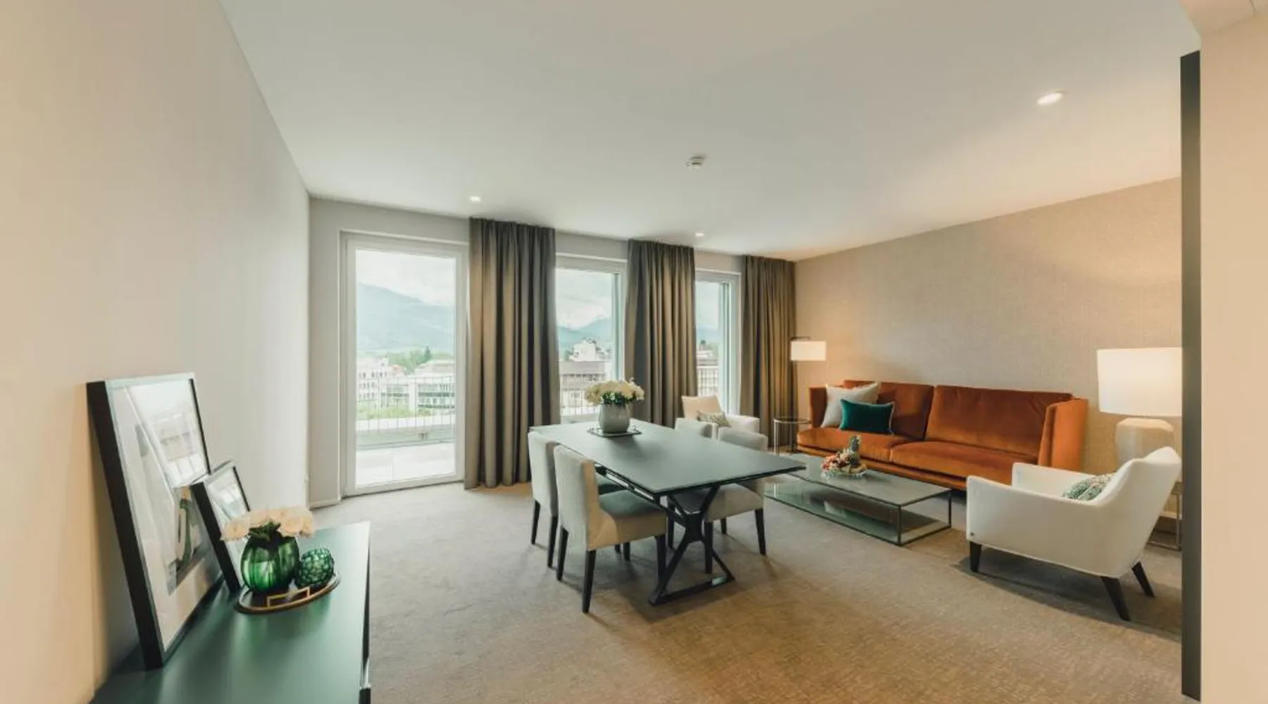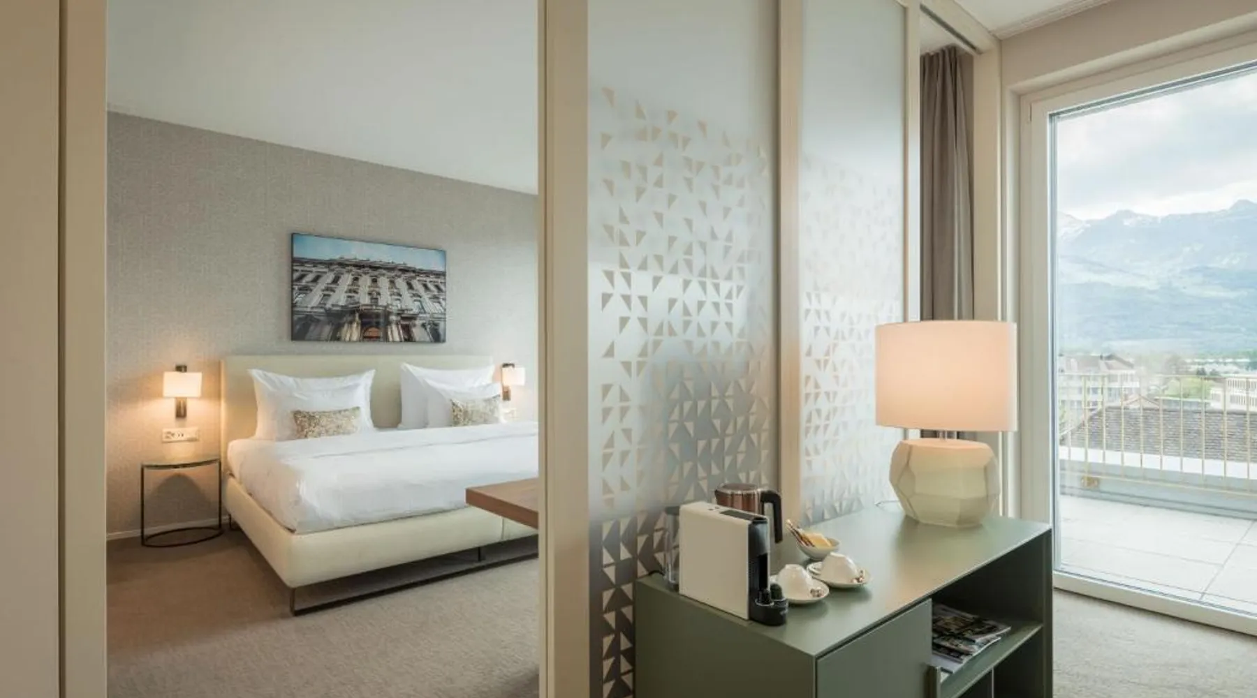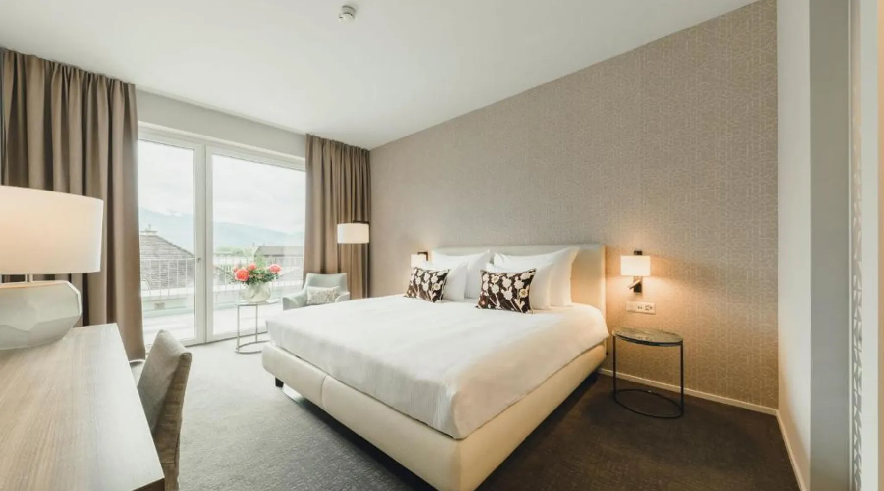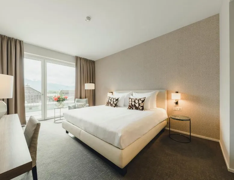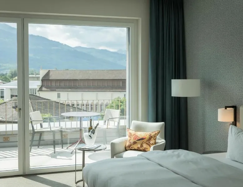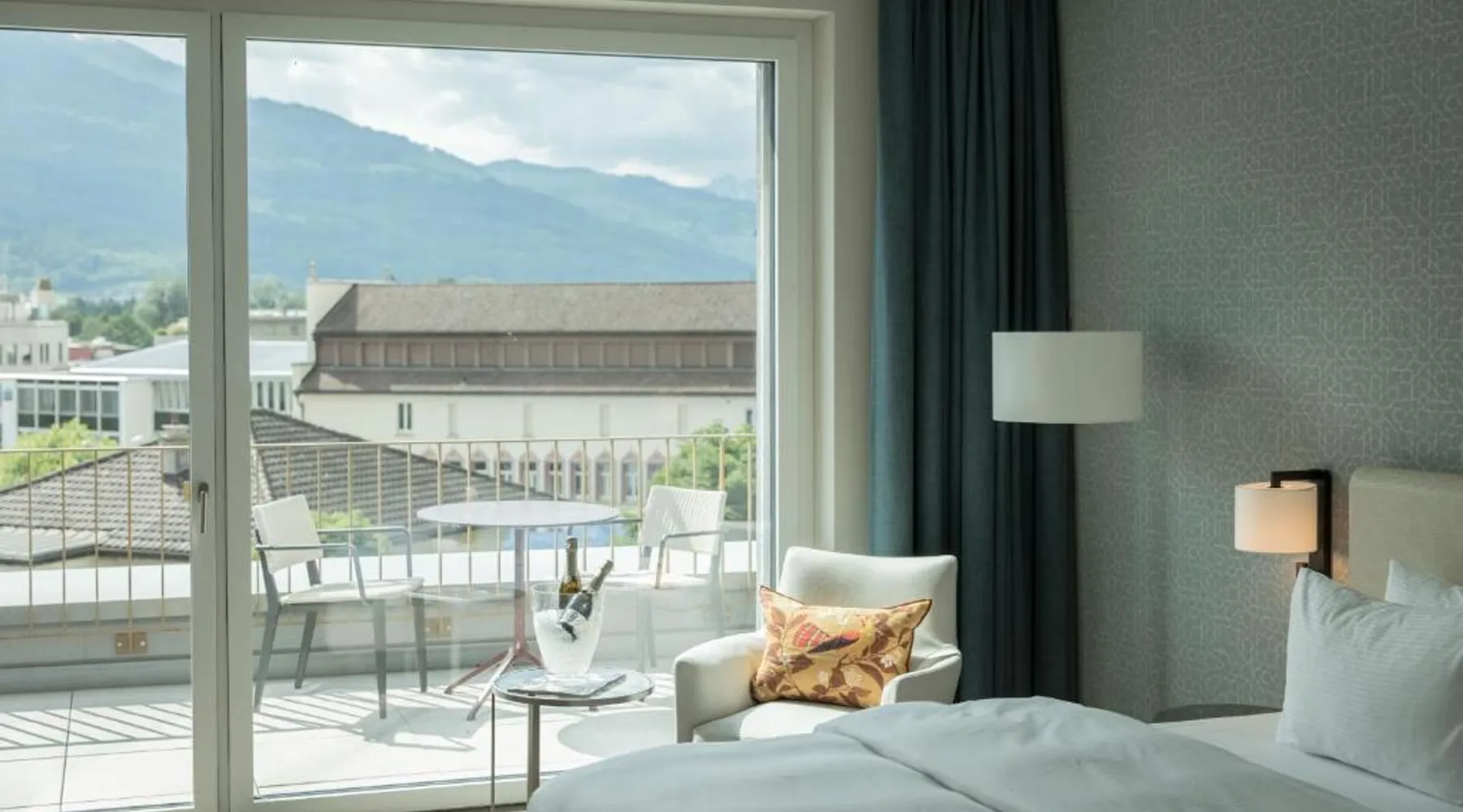Comfortable Accommodations: Central by Residence Hotel in Vaduz offers 4-star comfort with private check-in and check-out, a fitness center, sun terrace, and free WiFi. Guests enjoy amenities such as bathrobes, private bathrooms, and balconies with garden or mountain views. Dining Experience: The family-friendly restaurant serves international cuisine with vegetarian, vegan, and gluten-free options. Breakfast includes continental, buffet, and high tea, while dinner features brunch, lunch, and cocktails in a traditional or modern setting. Leisure Activities: Guests can participate in yoga classes, skiing, hiking, and cycling. The hotel provides free bicycles, a fitness room, and an electric vehicle charging station. Nearby attractions include the Liechtenstein Museum of Fine Arts and Salginatobel Bridge. The spacious double room provides air conditioning, soundproof walls, a terrace with mountain views as well as a private bathroom featuring a walk-in shower. The unit offers 1 bed.