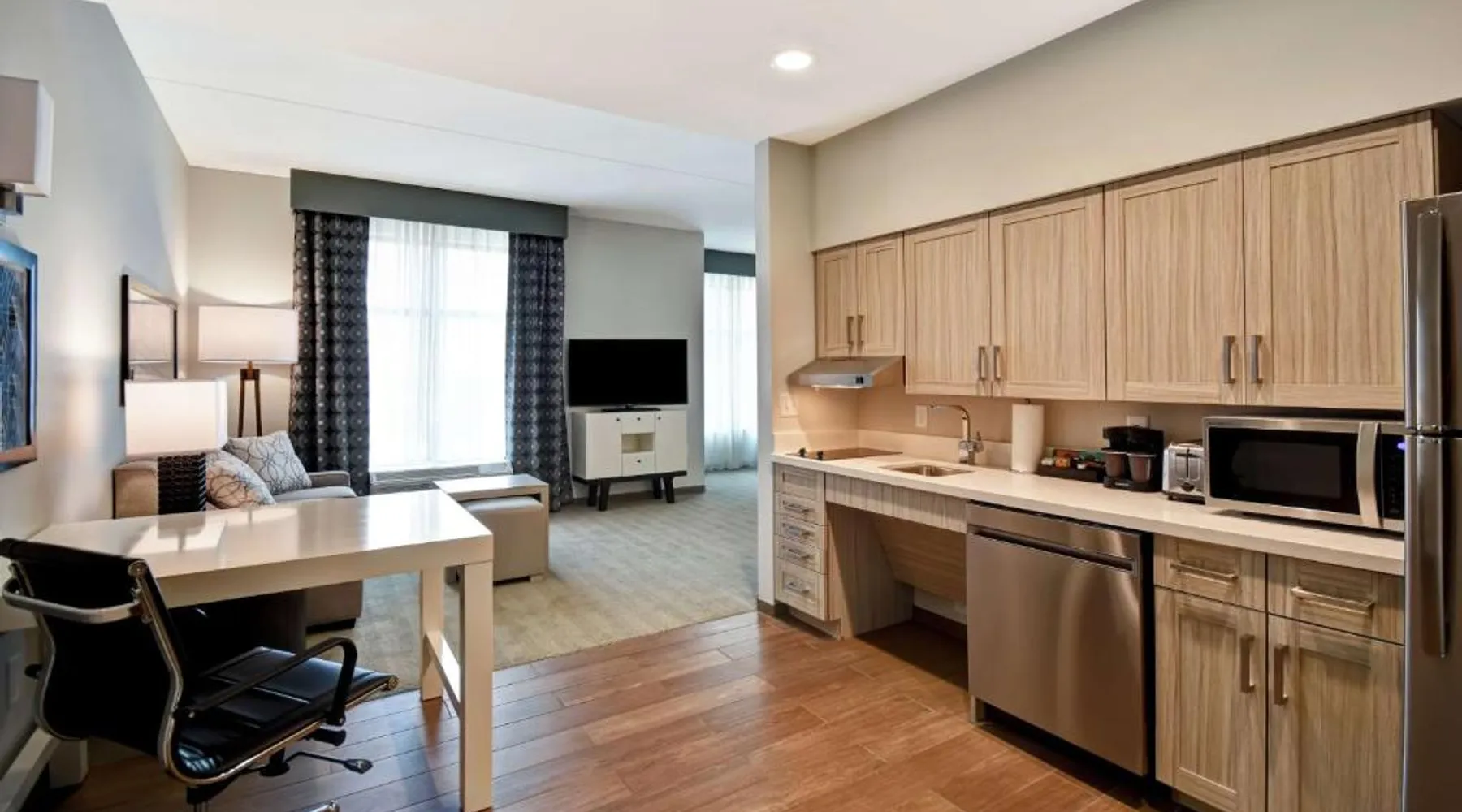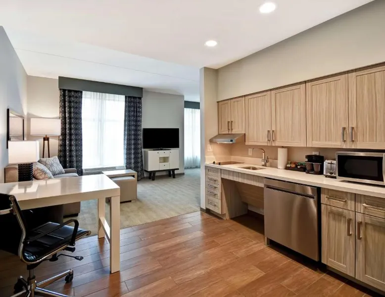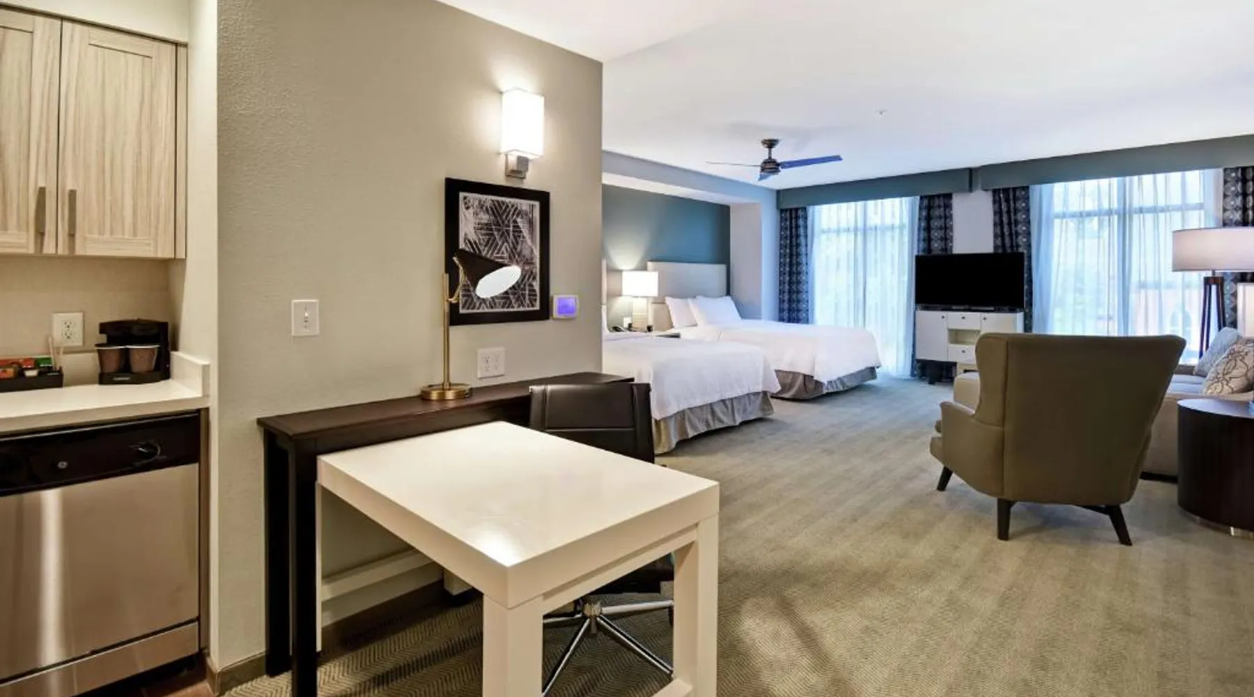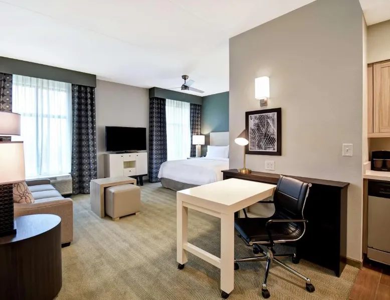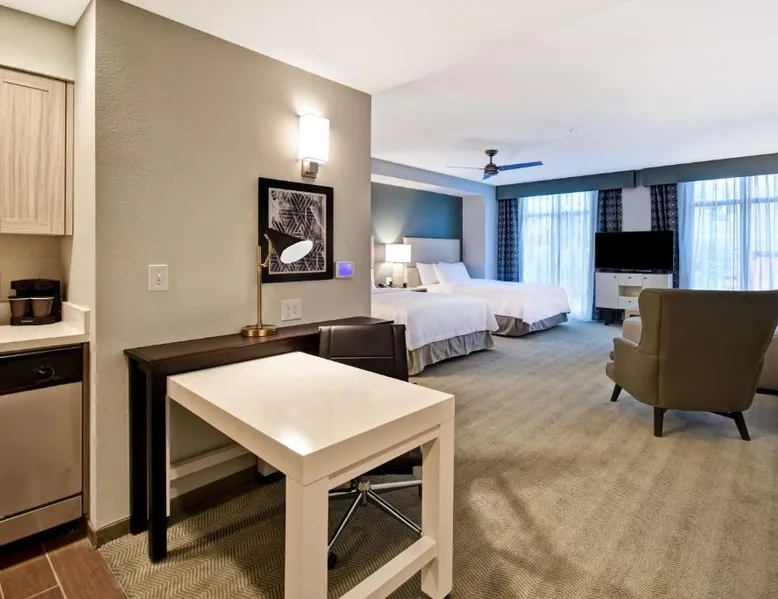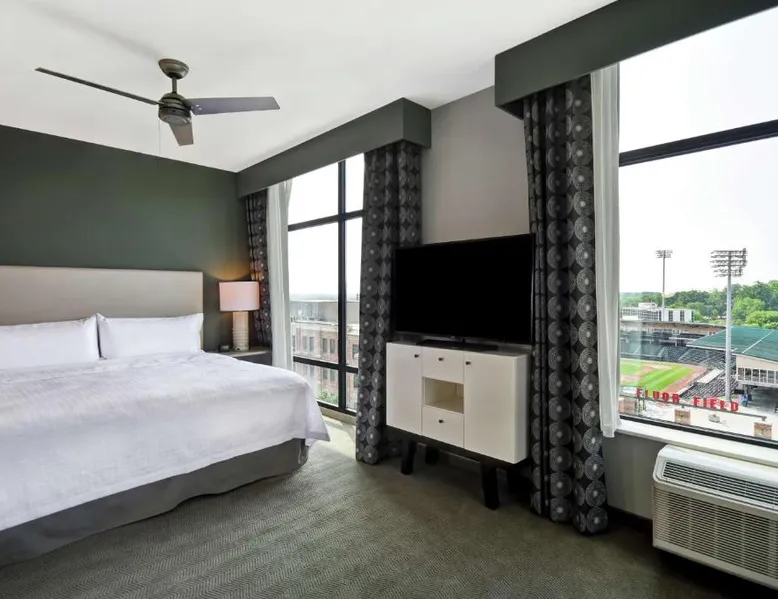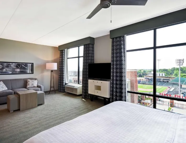 Comfortable Accommodations: Homewood Suites By Hilton Greenville Downtown in Greenville offers air-conditioned rooms with kitchen facilities, free WiFi, and amenities such as a fitness center, terrace, and seasonal outdoor swimming pool. Convenient Facilities: Guests can enjoy a lounge, outdoor fireplace, fitness room, and a 24-hour front desk. Additional services include a minimarket, daily housekeeping, child-friendly buffet, and bicycle parking. Prime Location: Located in the city center, the hotel is a 2-minute walk from Fluor Field and less than 0.6 mi from Peace Center and The Children's Museum Of The Upstate. Greenville-Spartanburg International Airport is 14 mi away. Guest Satisfaction: Highly rated for its convenient location, attentive staff, and immaculate rooms. In the fully equipped kitchen, guests will find a stovetop, a refrigerator, a dishwasher and kitchenware. This studio is air-conditioned and has a seating area with a flat-screen TV, a tea and coffee maker, a wardrobe, a safe deposit box, as well as a sofa. The unit has 2 beds.