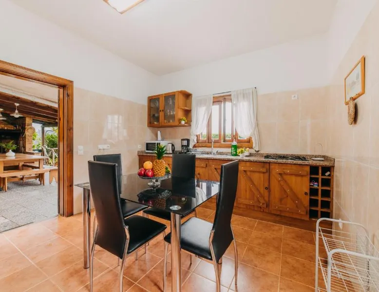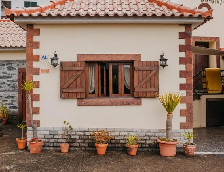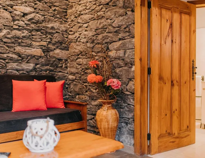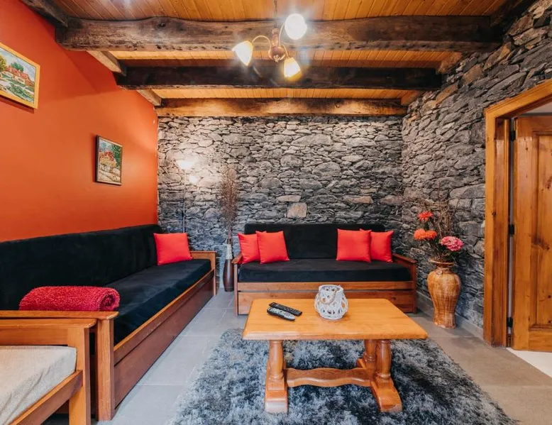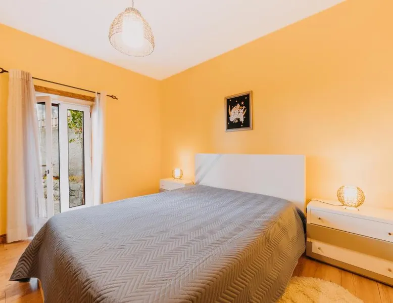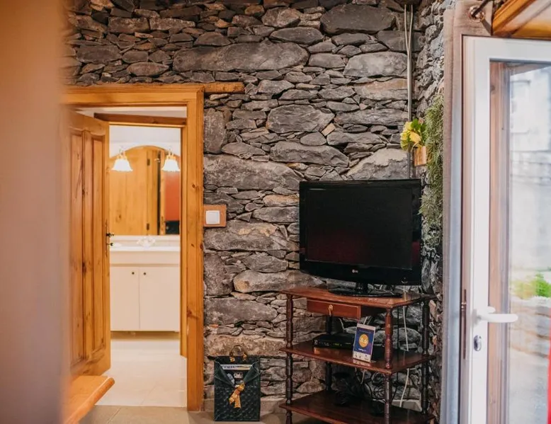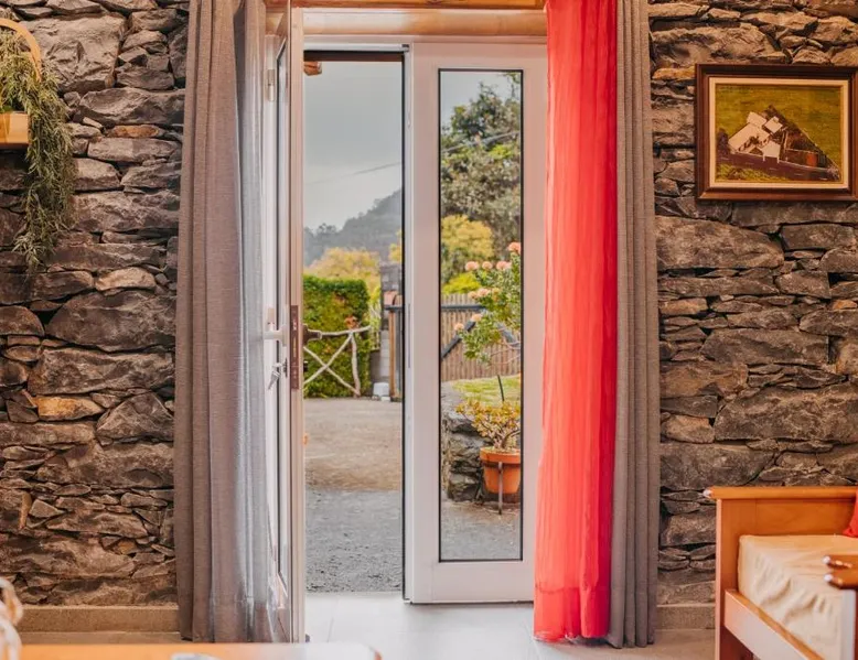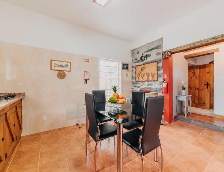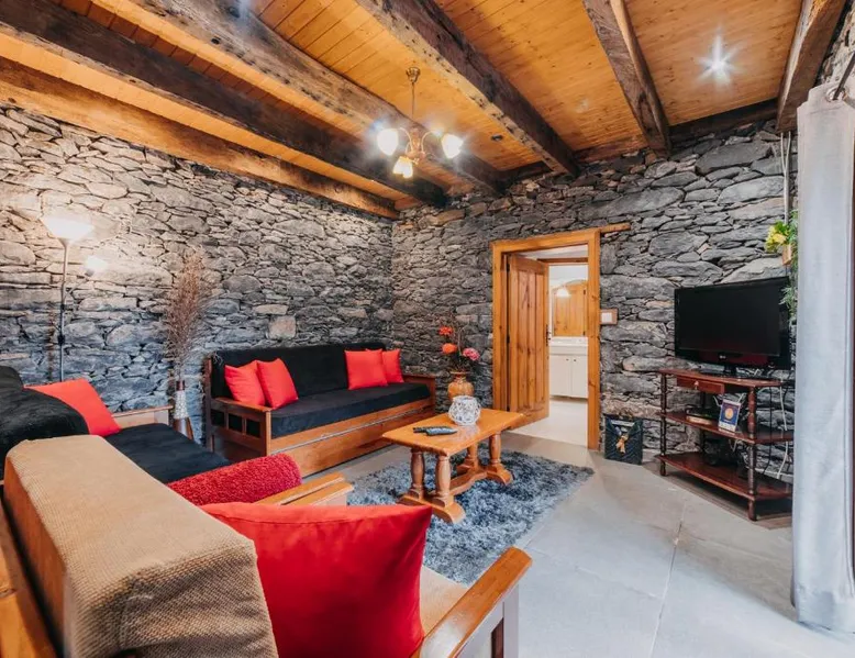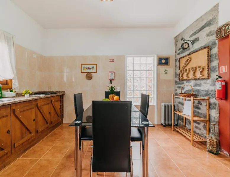 Essential Facilities: Casa do Faial in Santana offers a sun terrace, garden, and free WiFi. Guests can relax in the outdoor seating area or enjoy the picnic and barbecue facilities. Comfortable Living: The holiday home features two bedrooms, a bathroom, and a living room. Amenities include a washing machine, patio, kitchen, and dining area. Free on-site private parking is available. Local Attractions: Santana's Traditional Houses are 5 mi away, while Cristiano Ronaldo Madeira International Airport is 12 mi distant. Nearby points of interest include Pico Ruivo peak (11 mi) and Porto Moniz Natural Swimming Pools (30 mi). Guest Favorites: Guests appreciate the convenient location and the variety of activities available, including hiking. The living room features dark stone walls, sofas and a TV. The bathroom comes with a shower. The kitchen has wooden cabinets, and a porch area houses the barbecue facilities and a dining area.
