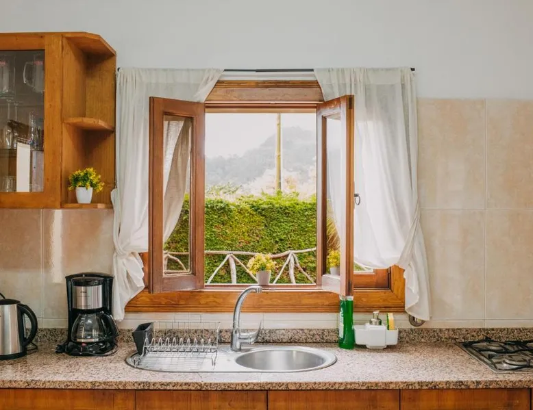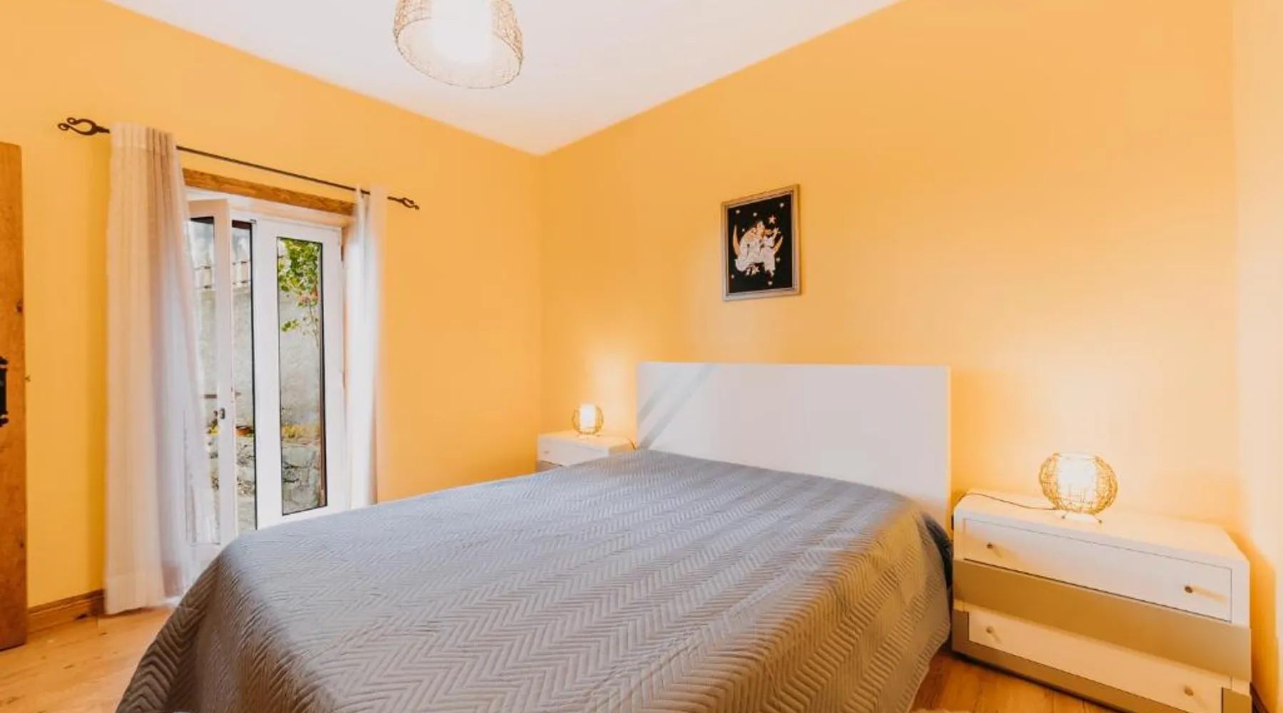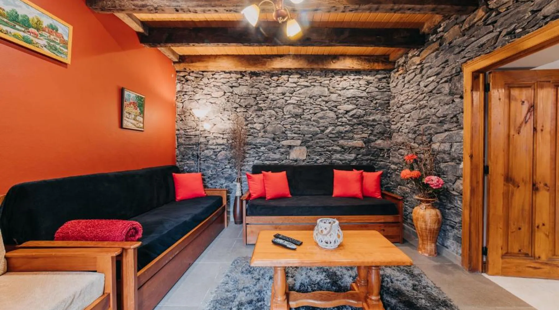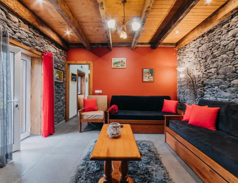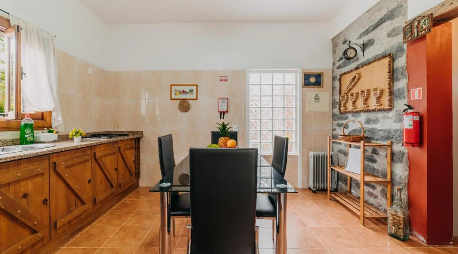 Essential Facilities: Casa do Faial in Santana offers a sun terrace, garden, and free WiFi. Guests can relax in the outdoor seating area or enjoy the picnic and barbecue facilities. Comfortable Living: The holiday home features two bedrooms, a bathroom, and a living room. Amenities include a washing machine, patio, kitchen, and dining area. Free on-site private parking is available. Local Attractions: Santana's Traditional Houses are 5 mi away, while Cristiano Ronaldo Madeira International Airport is 12 mi distant. Nearby points of interest include Pico Ruivo peak (11 mi) and Porto Moniz Natural Swimming Pools (30 mi). Guest Favorites: Guests appreciate the convenient location and the variety of activities available, including hiking. The living room features dark stone walls, sofas and a TV. The bathroom comes with a shower. The kitchen has wooden cabinets, and a porch area houses the barbecue facilities and a dining area.