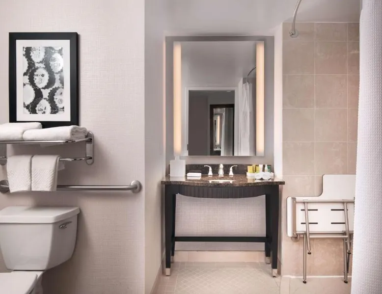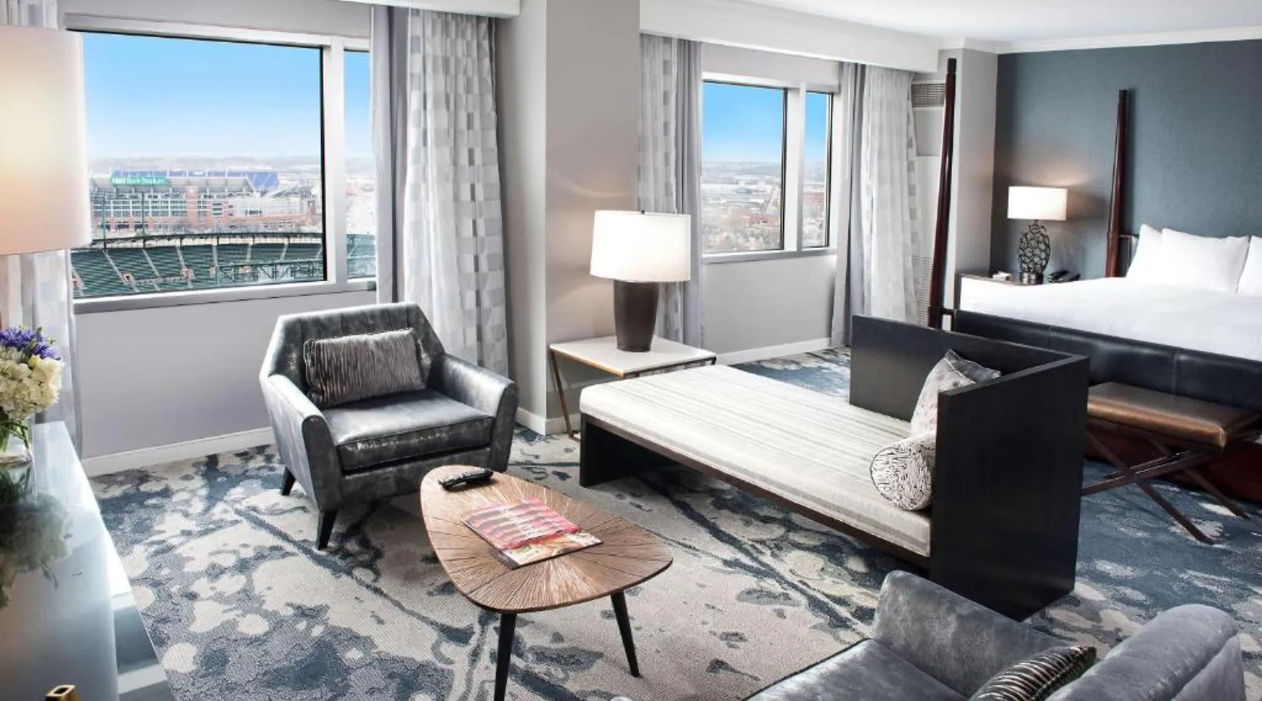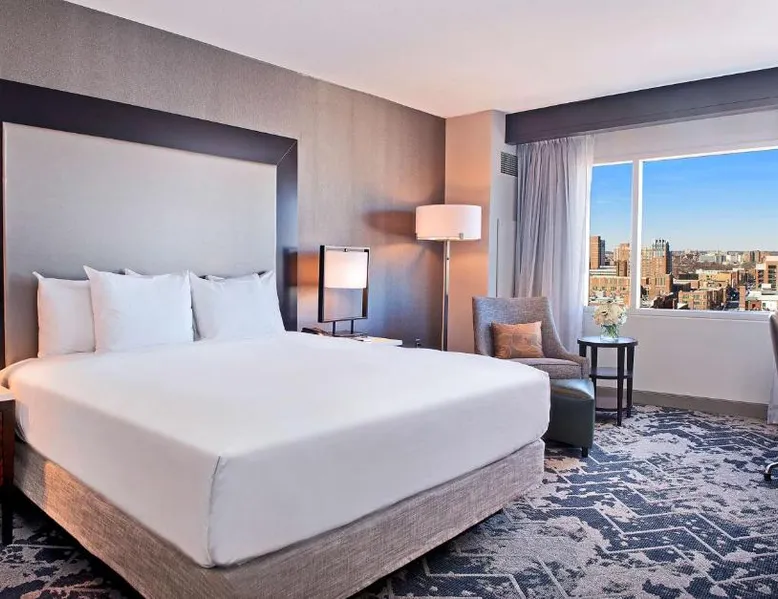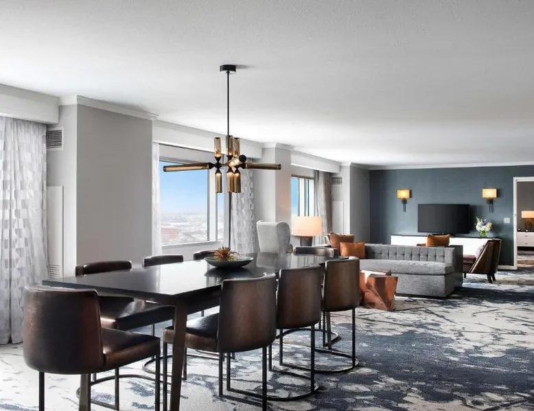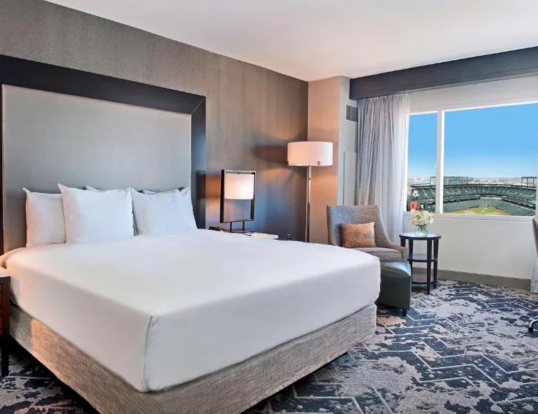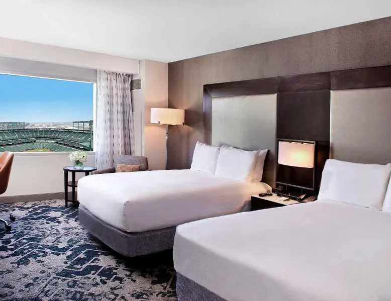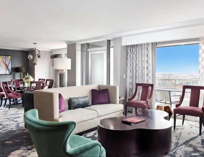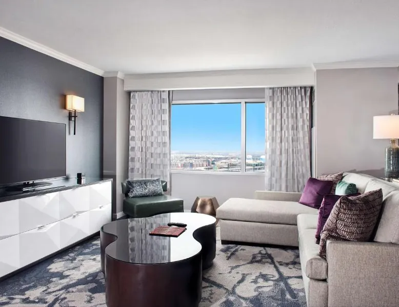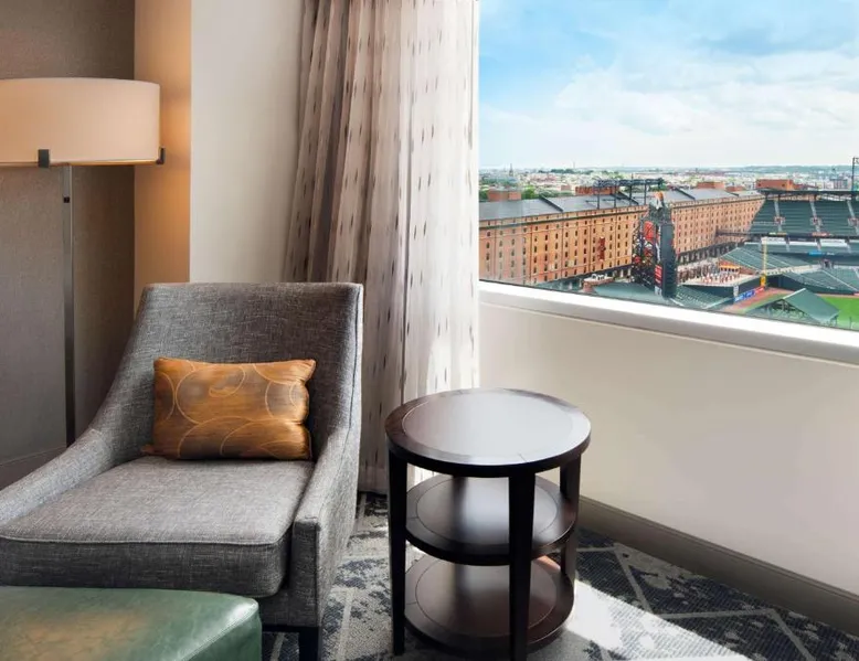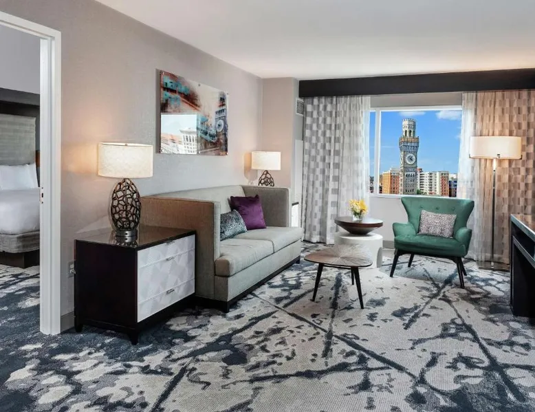 Offering direct access to the Baltimore Convention Center via a covered sky bridge and within walking distance of the Inner Harbor, this hotel offers spacious guestrooms filled with sophisticated amenities. Hilton Baltimore Inner Harbor features guestrooms and suites with plush-top mattresses, down duvets and pillows. Guests will also enjoy in-room plasma screen TVs with on-demand entertainment and spacious work areas. Relaxing amenities such as an indoor pool and well-equipped fitness center are also offered. Breakfast, lunch and dinner are available daily at the hotel's full-service on-site restaurant. The room features a seating area with a sofa and a cable TV.