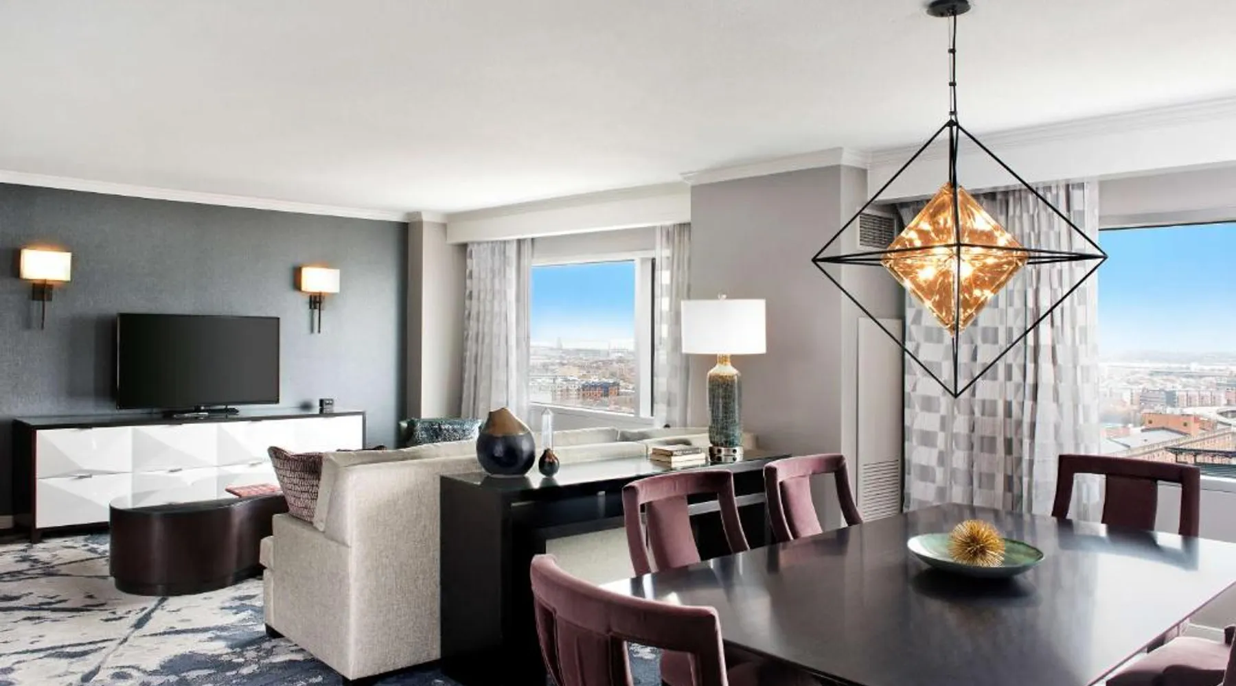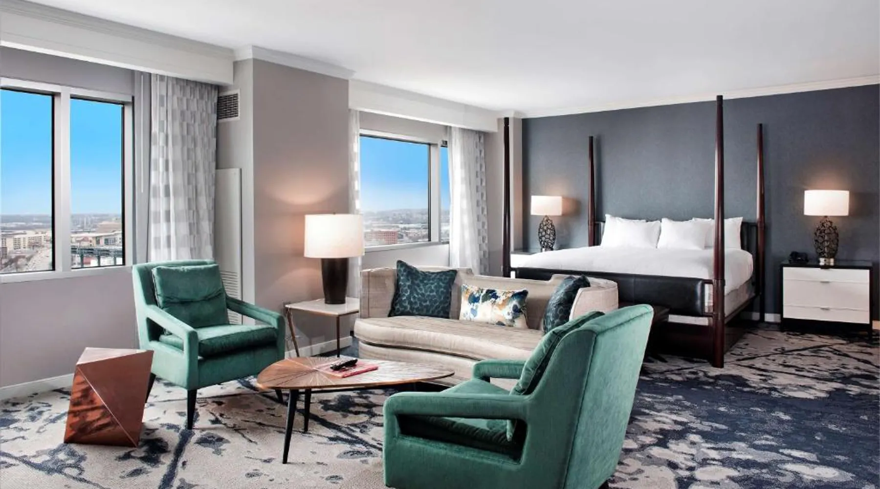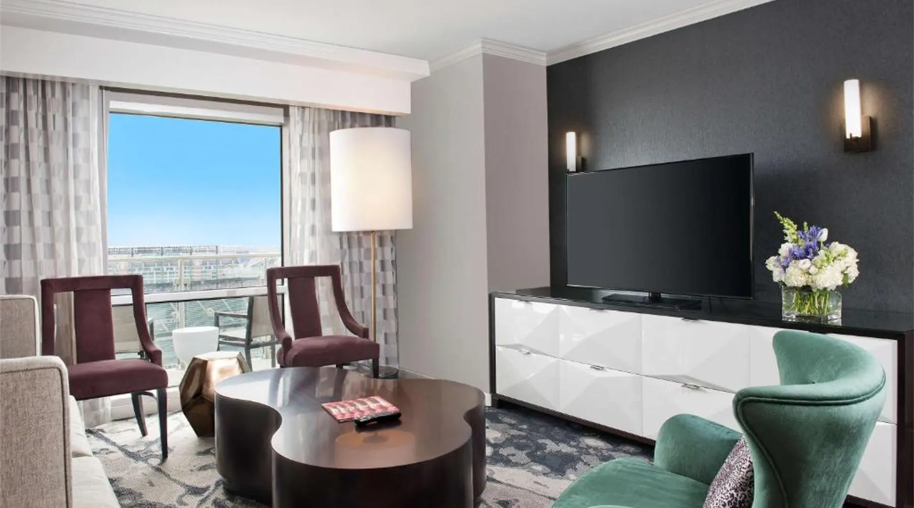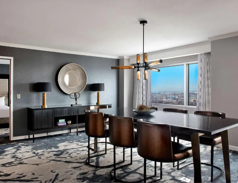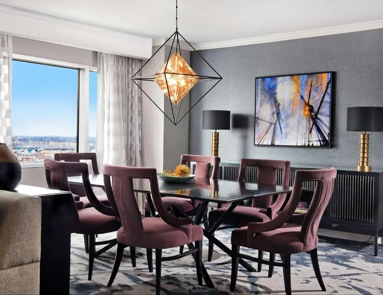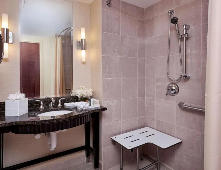 Offering direct access to the Baltimore Convention Center via a covered sky bridge and within walking distance of the Inner Harbor, this hotel offers spacious guestrooms filled with sophisticated amenities. Hilton Baltimore Inner Harbor features guestrooms and suites with plush-top mattresses, down duvets and pillows. Guests will also enjoy in-room plasma screen TVs with on-demand entertainment and spacious work areas. Relaxing amenities such as an indoor pool and well-equipped fitness center are also offered. Breakfast, lunch and dinner are available daily at the hotel's full-service on-site restaurant. The room features a seating area with a sofa and a cable TV.
