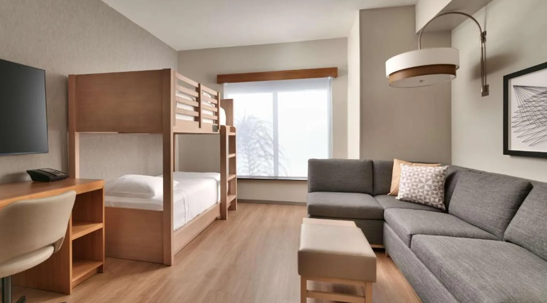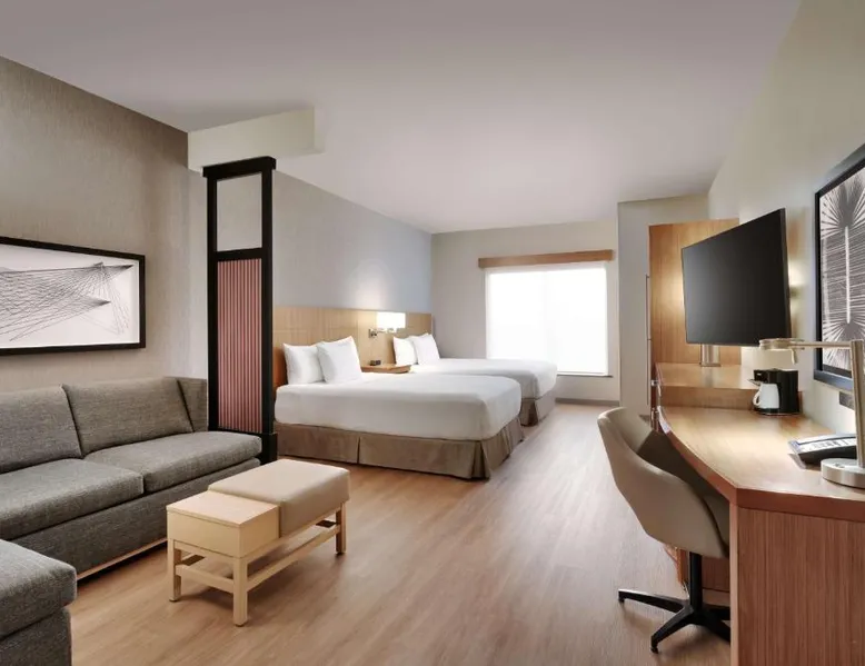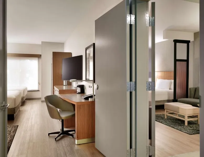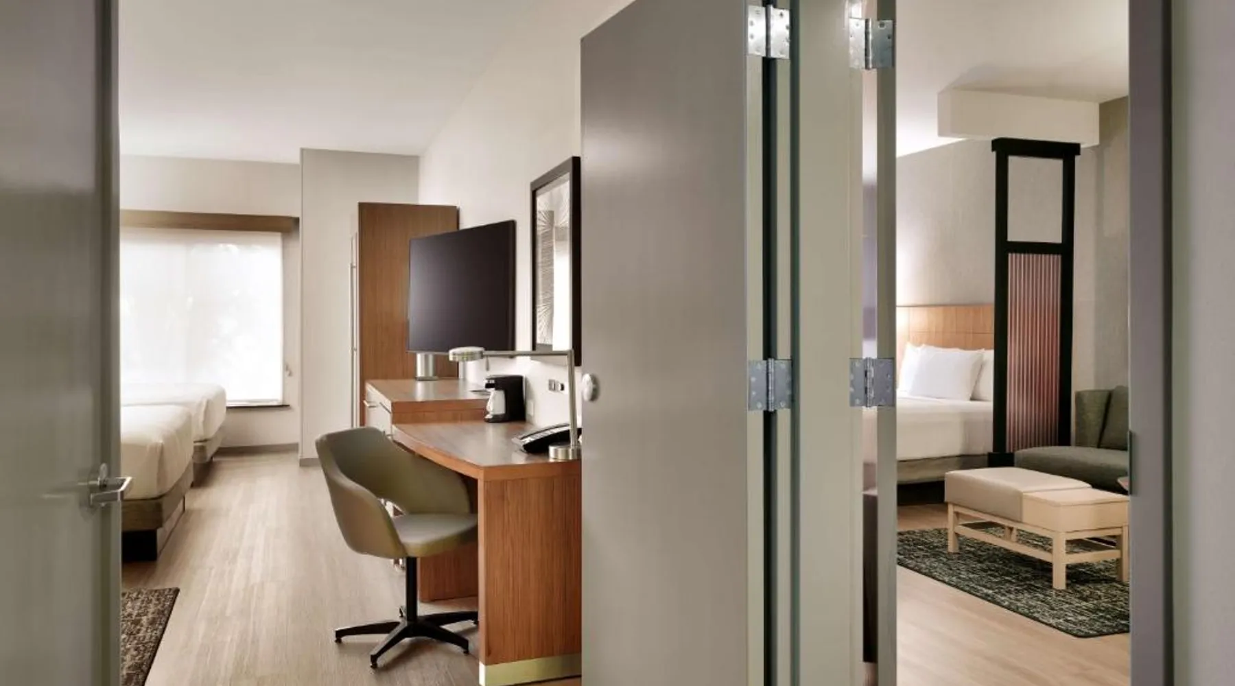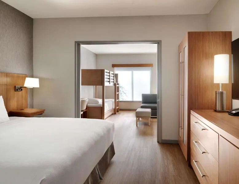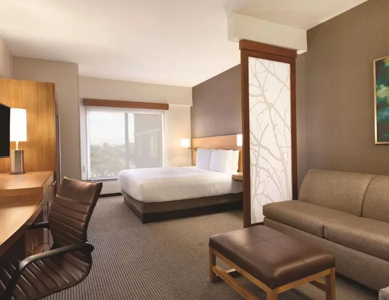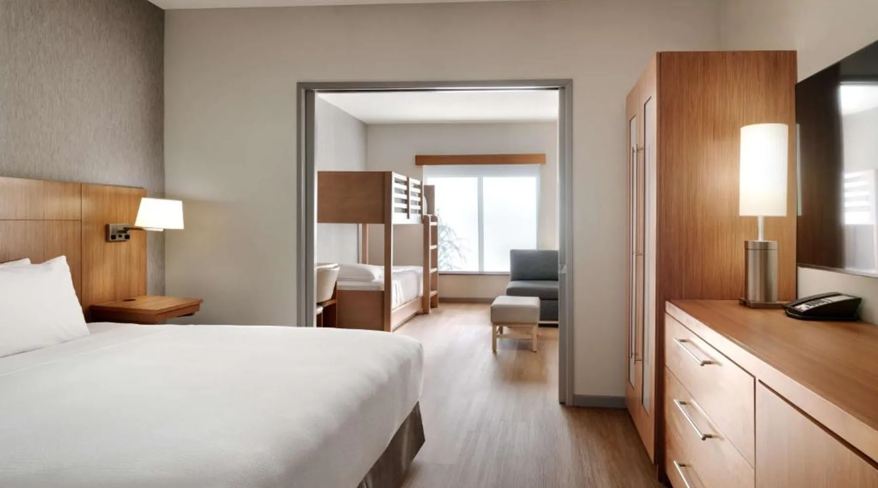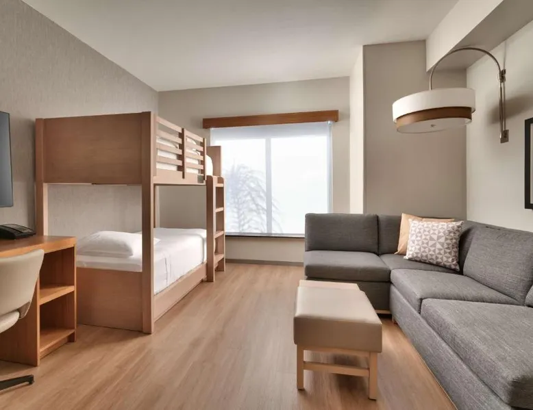 Offering an outdoor pool and an on-site restaurant, Hyatt Place at Anaheim Resort/Convention Center offers guest rooms with free WiFi. Disneyland is 1 mi away. A flat-screen TV with cable is featured in each air-conditioned room. A refrigerator and coffee machine are included as well. Free toiletries and a hairdryer are provided in all bathrooms. Select rooms offer a dining area. A coffee and cocktail bar is located on site at the property. At Hyatt Place at Anaheim Resort/Convention Center you will find a fitness center. Other facilities offered at the property include meeting facilities and ticket services. The hotel is 1969 feet from Anaheim Convention Center and 0.7 mi from Disney California Adventure. Los Angeles International Airport is 30 mi away. Separated by two French doors, this room includes a sleeping area with one king bed and twin-bed bunk bed.