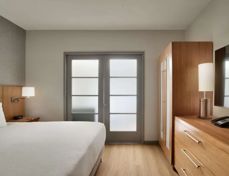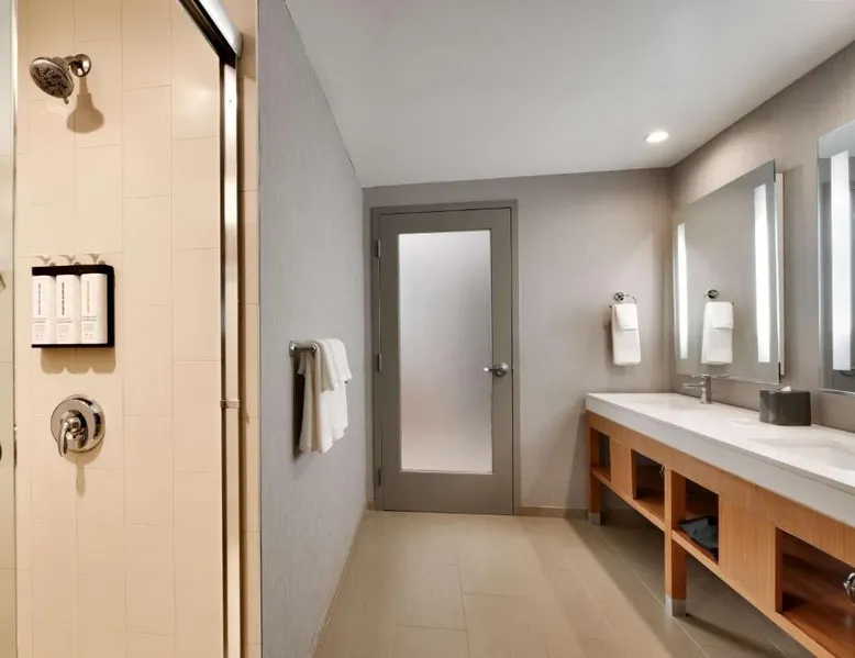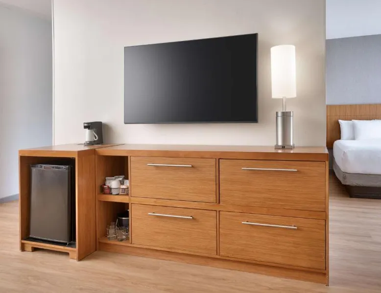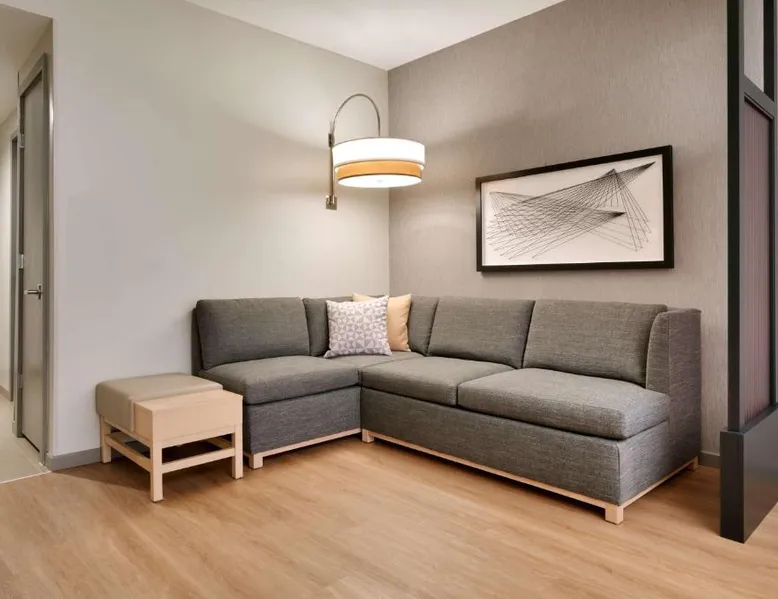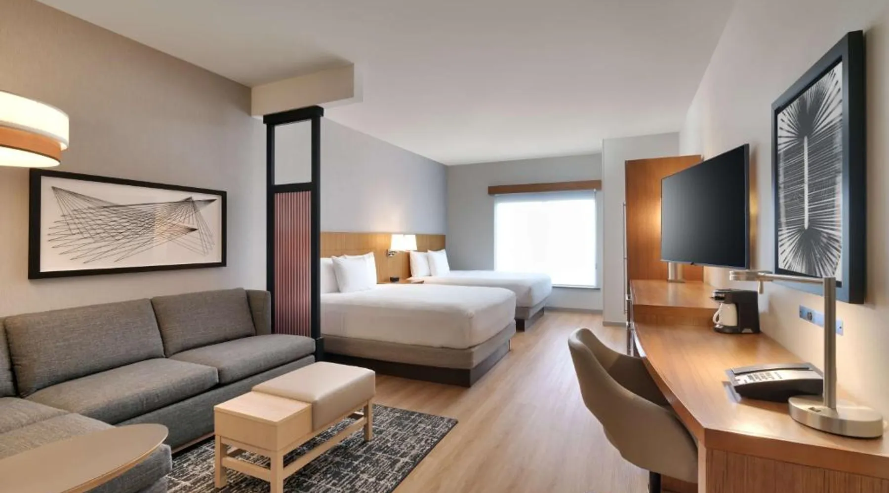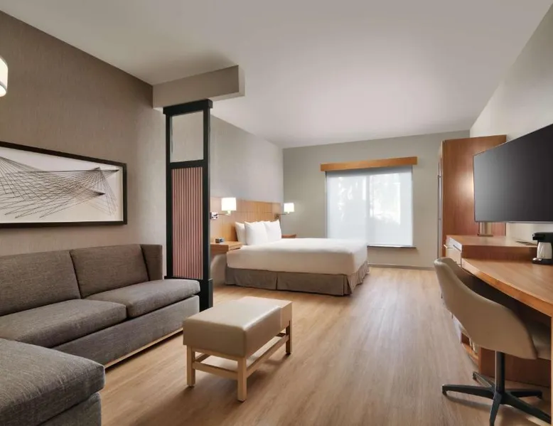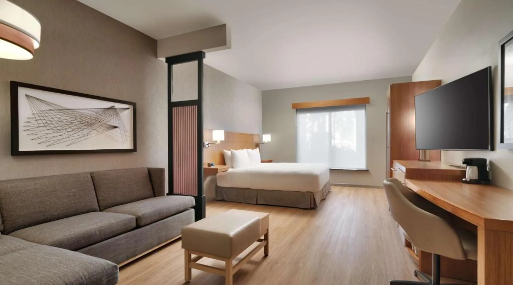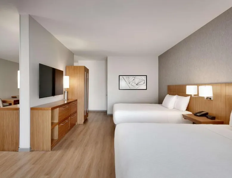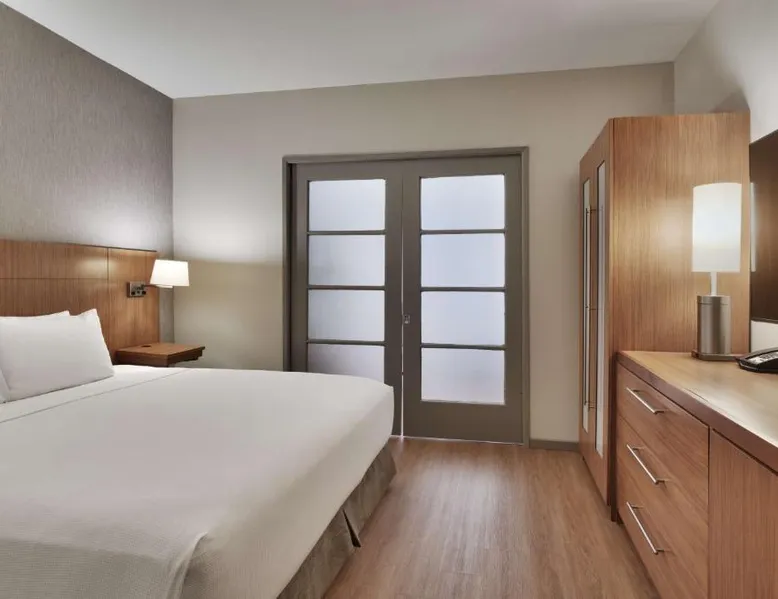 Offering an outdoor pool and an on-site restaurant, Hyatt Place at Anaheim Resort/Convention Center offers guest rooms with free WiFi. Disneyland is 1 mi away. A flat-screen TV with cable is featured in each air-conditioned room. A refrigerator and coffee machine are included as well. Free toiletries and a hairdryer are provided in all bathrooms. Select rooms offer a dining area. A coffee and cocktail bar is located on site at the property. At Hyatt Place at Anaheim Resort/Convention Center you will find a fitness center. Other facilities offered at the property include meeting facilities and ticket services. The hotel is 1969 feet from Anaheim Convention Center and 0.7 mi from Disney California Adventure. Los Angeles International Airport is 30 mi away. Separated by two French doors, this room includes a sleeping area with one king bed and twin-bed bunk bed.