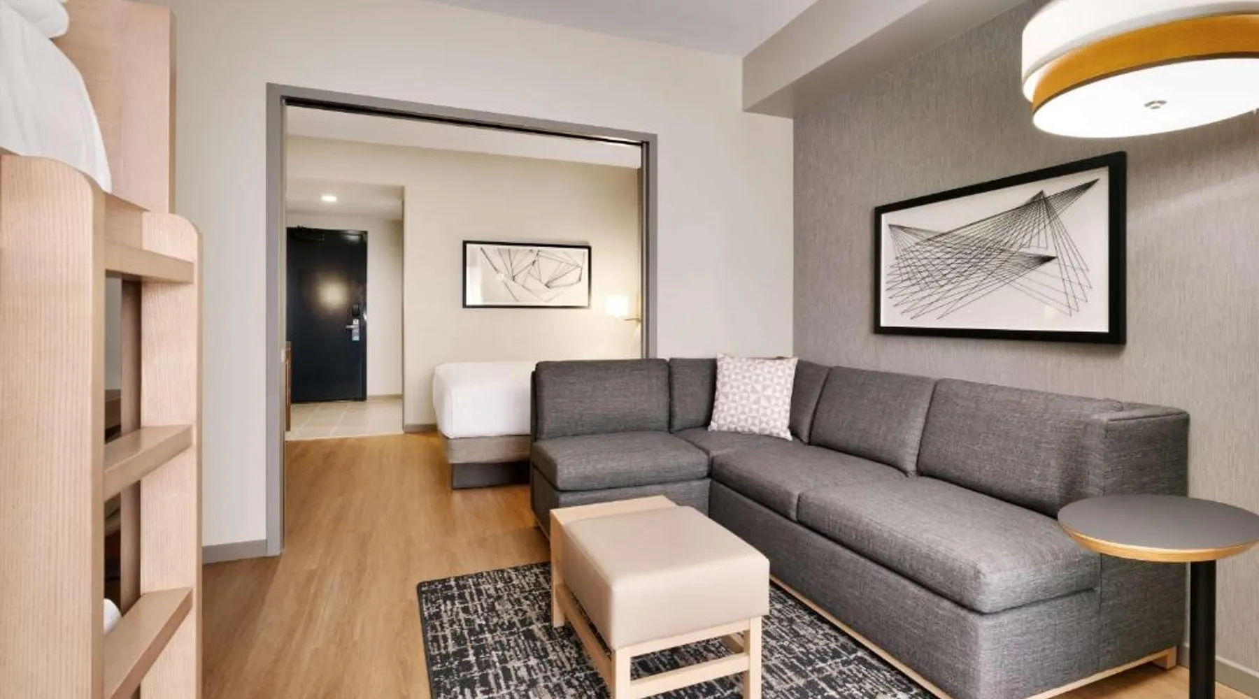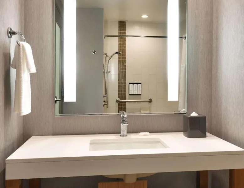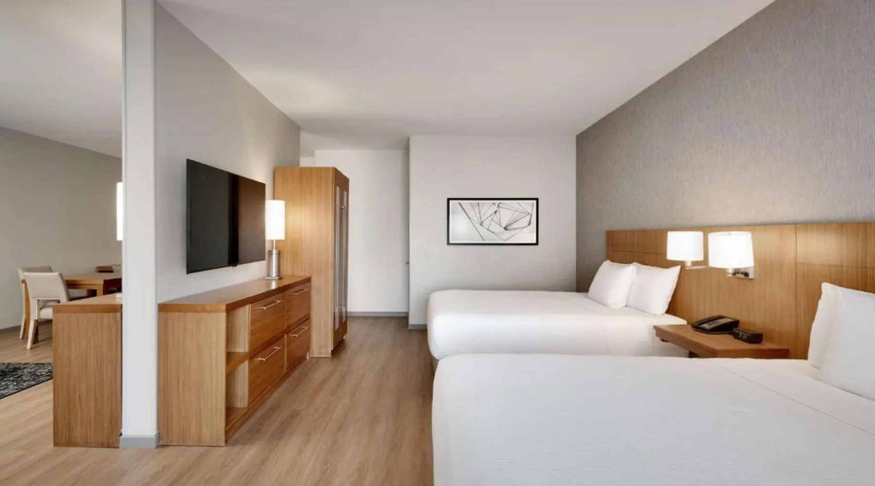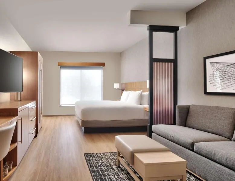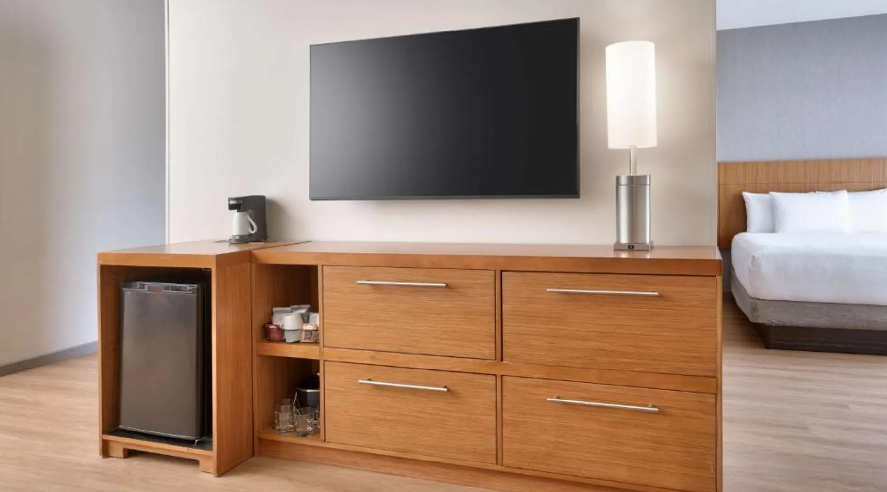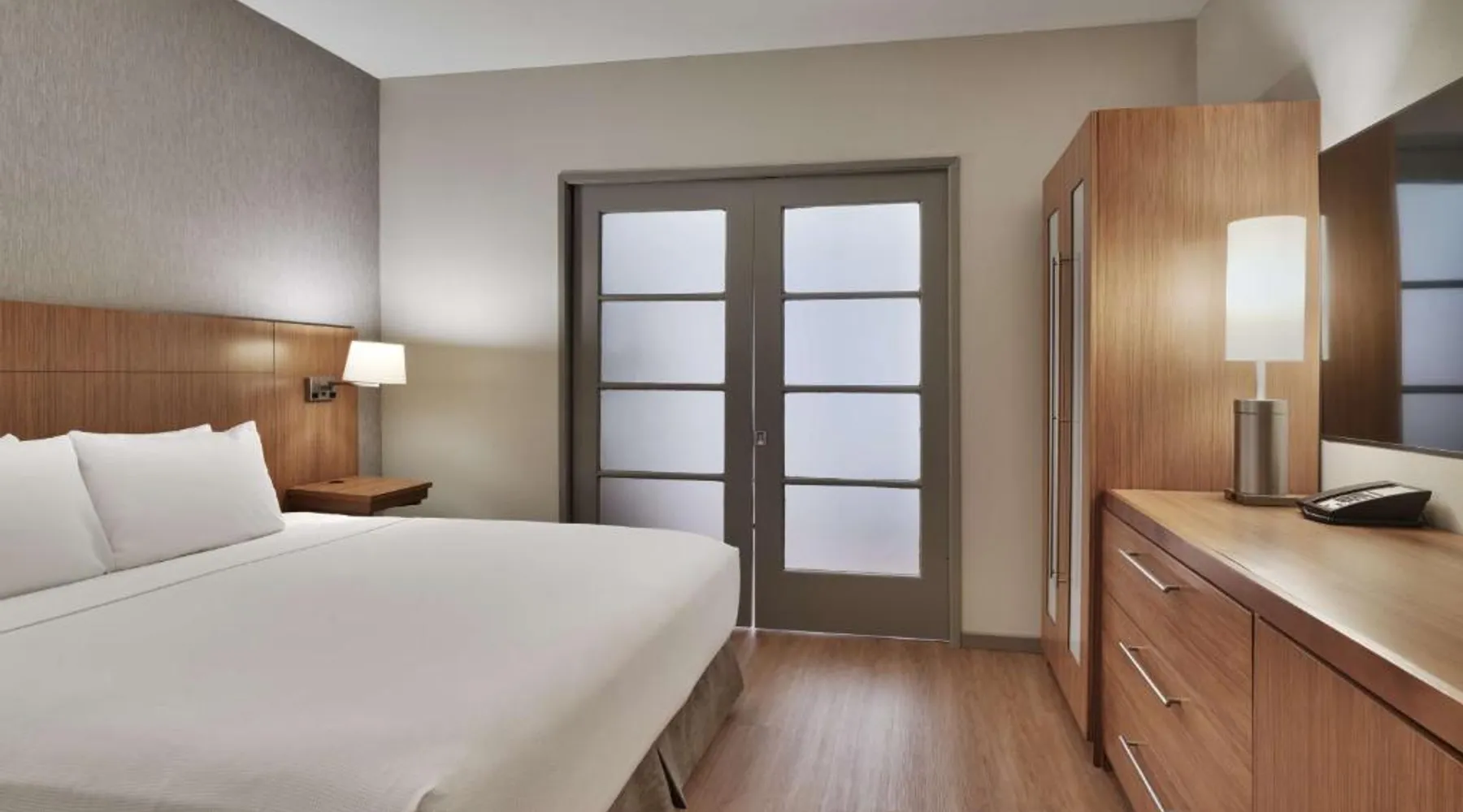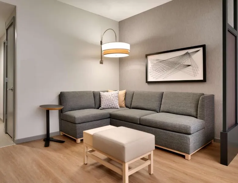 Offering an outdoor pool and an on-site restaurant, Hyatt Place at Anaheim Resort/Convention Center offers guest rooms with free WiFi. Disneyland is 1 mi away. A flat-screen TV with cable is featured in each air-conditioned room. A refrigerator and coffee machine are included as well. Free toiletries and a hairdryer are provided in all bathrooms. Select rooms offer a dining area. A coffee and cocktail bar is located on site at the property. At Hyatt Place at Anaheim Resort/Convention Center you will find a fitness center. Other facilities offered at the property include meeting facilities and ticket services. The hotel is 1969 feet from Anaheim Convention Center and 0.7 mi from Disney California Adventure. Los Angeles International Airport is 30 mi away. Separated by two French doors, this room includes a sleeping area with one king bed and twin-bed bunk bed.