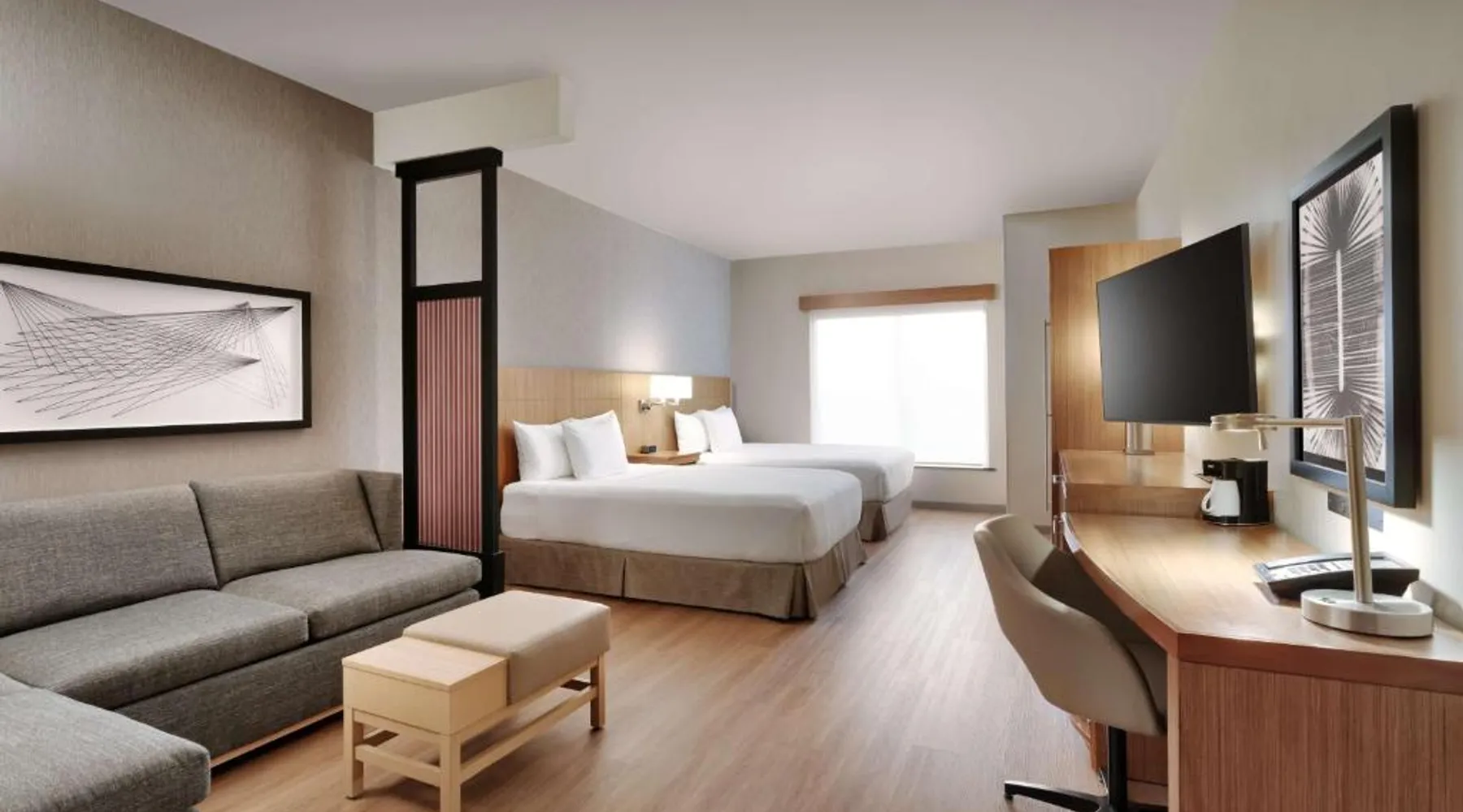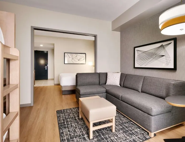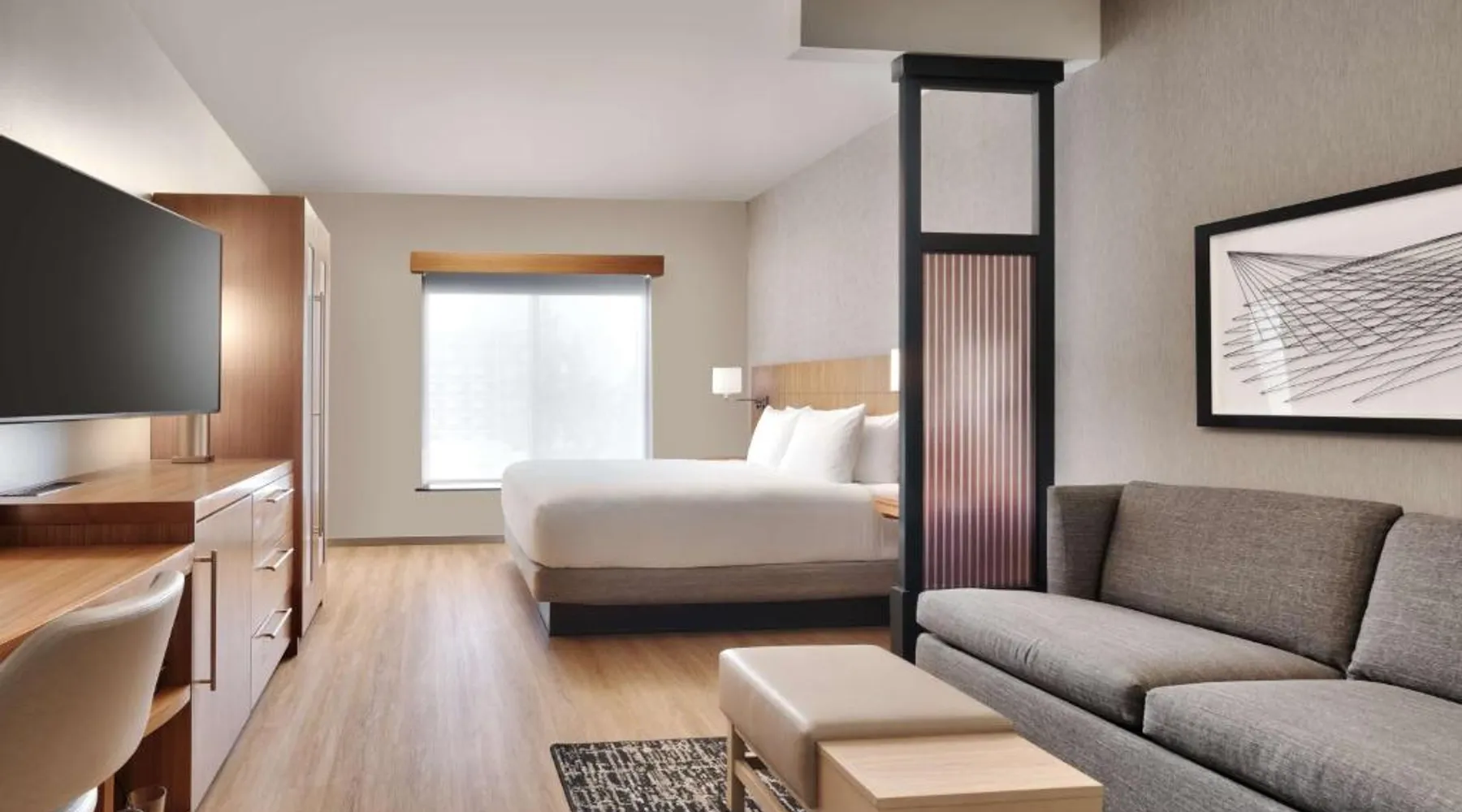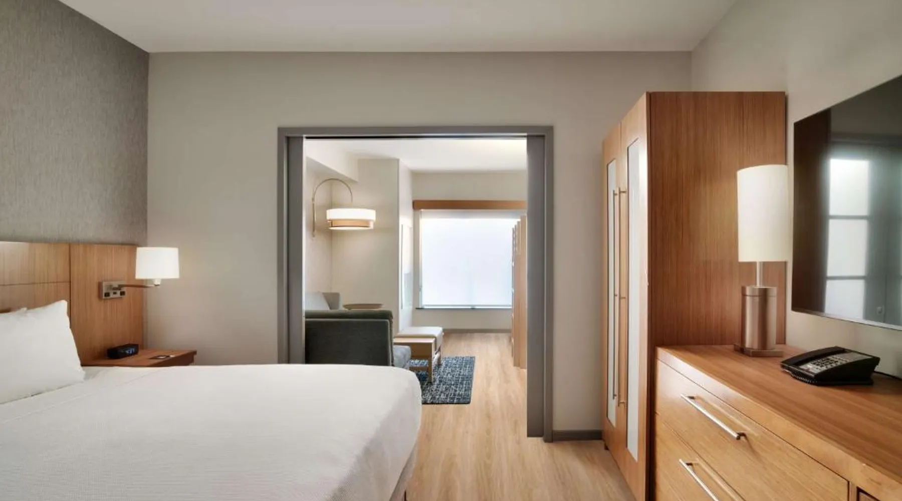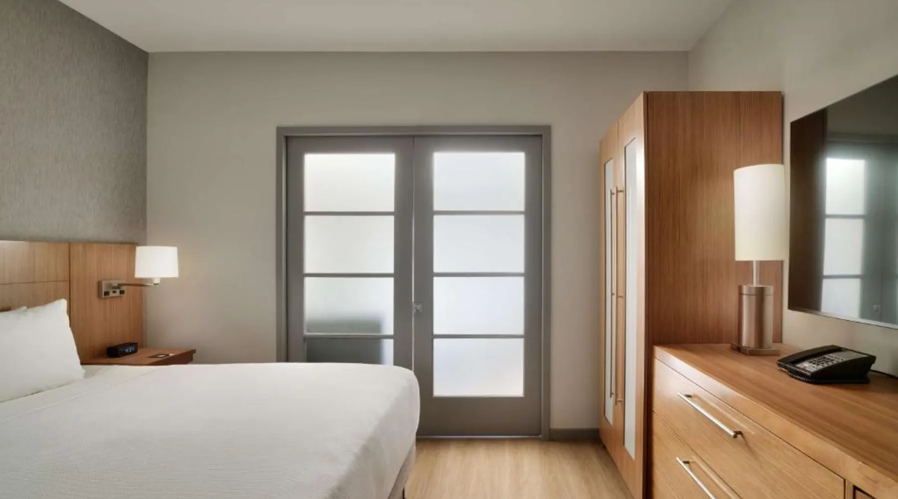 Offering an outdoor pool and an on-site restaurant, Hyatt Place at Anaheim Resort/Convention Center offers guest rooms with free WiFi. Disneyland is 1 mi away. A flat-screen TV with cable is featured in each air-conditioned room. A refrigerator and coffee machine are included as well. Free toiletries and a hairdryer are provided in all bathrooms. Select rooms offer a dining area. A coffee and cocktail bar is located on site at the property. At Hyatt Place at Anaheim Resort/Convention Center you will find a fitness center. Other facilities offered at the property include meeting facilities and ticket services. The hotel is 1969 feet from Anaheim Convention Center and 0.7 mi from Disney California Adventure. Los Angeles International Airport is 30 mi away. Separated by two French doors, this room includes a sleeping area with one king bed and twin-bed bunk bed.