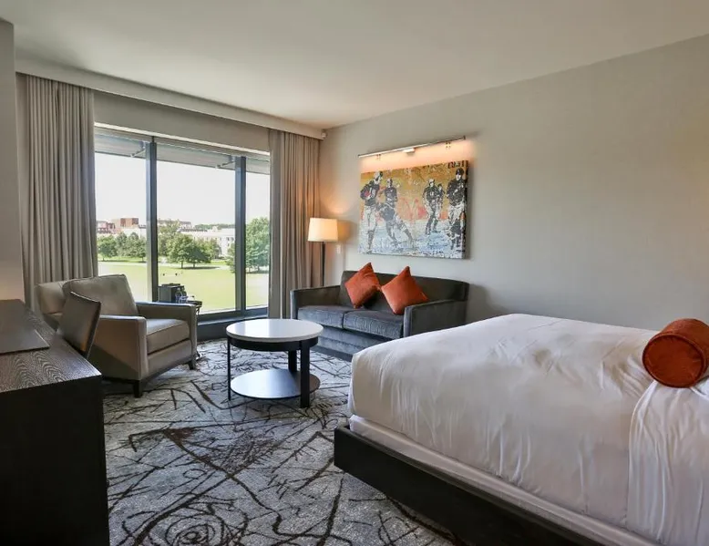 The Hotel at the University of Maryland is located directly across the street from the main entrance to the University campus, and 8.6 mi from Washington DC. Free WiFi is offered. Featuring free WiFi throughout the property, The Hotel at the University of Maryland offers accommodations in College Park, Maryland. There is an indoor pool and fully equipped fitness center. Featuring floor-to-ceiling windows, guest rooms have a flat-screen TV and coffeemakers. The hotel offers a 24-hour business center, an on-site restaurant and bar, and concierge services. Paint Branch Stream Valley Park is 1.4 mi from the property. The National Mall is 12 mi from The Hotel at the University of Maryland. The nearest airport is Ronald Reagan Washington National Airport, 11 mi from the property. The air-conditioned suite has 1 bedroom and 1 bathroom with a walk-in shower and a hairdryer. The suite features carpeted floors, a seating area with a flat-screen TV with cable channels, a tea and coffee maker, executive lounge access, as well as a wardrobe. The unit has 1 bed.