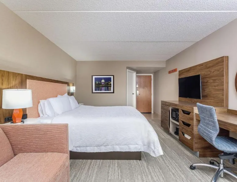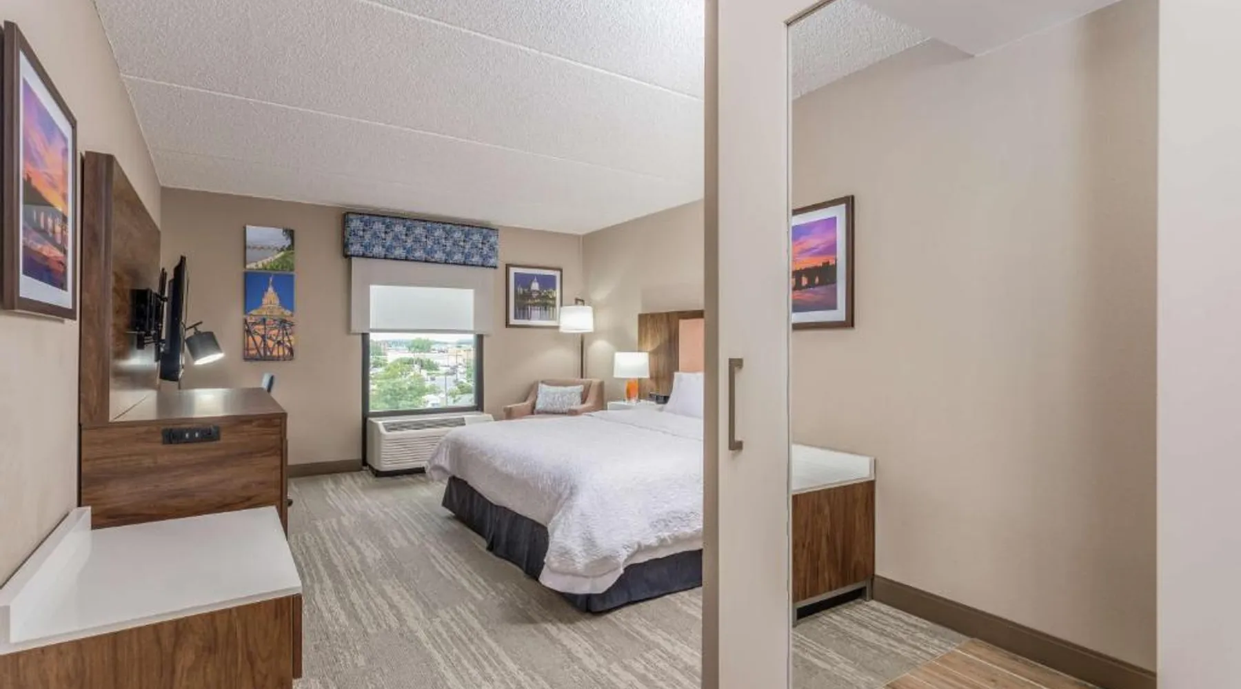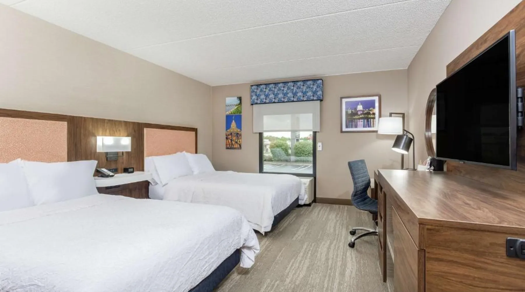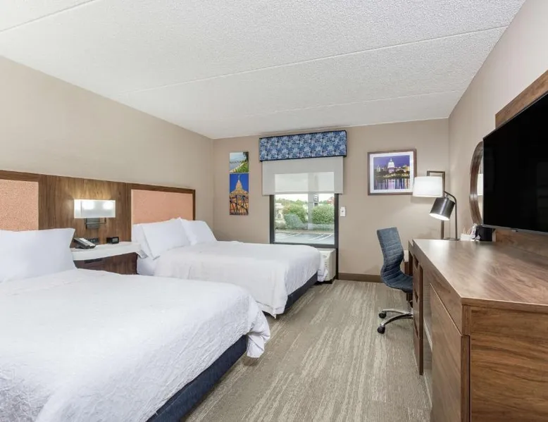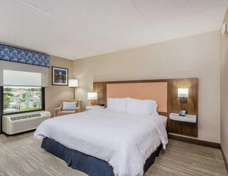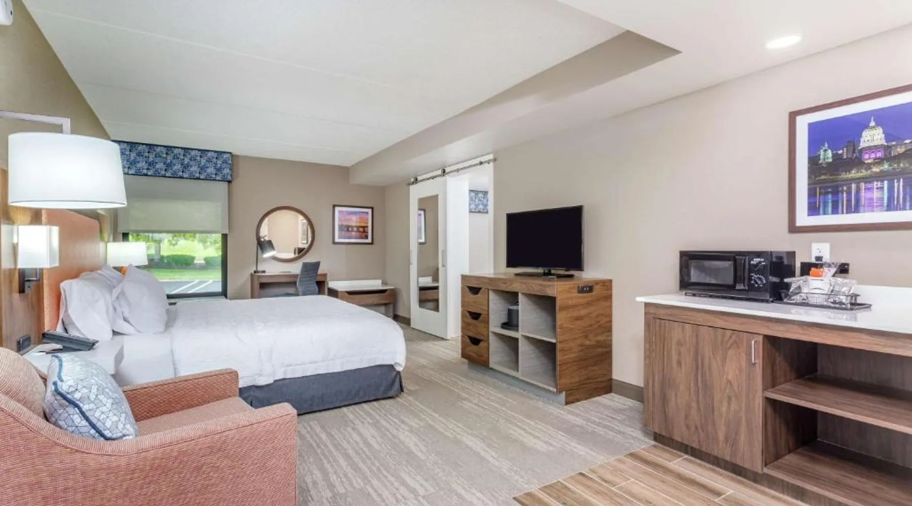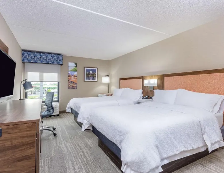 Comfortable Accommodations: Rooms feature air-conditioning, private bathrooms, and modern amenities such as free WiFi, flat-screen TVs, and work desks. Guests enjoy amenities like tea and coffee makers, refrigerators, and free toiletries. Leisure Facilities: The hotel offers a fitness center, tennis court, and a seasonal outdoor swimming pool. Additional facilities include a lounge, outdoor fireplace, and a child-friendly buffet. Free on-site private parking is available for guests. Dining Options: A continental and American buffet breakfast is served daily, including warm dishes, juice, and fruits. The property also provides a business area and outdoor seating for guests to relax. Prime Location: Located in Harrisburg, the hotel is 6.2 mi from Harrisburg International Airport. Nearby attractions include the National Civil War Museum (2.6 mi) and Hersheypark (11 mi). Guests appreciate the room cleanliness, breakfast provided by the property, and attentive staff. This quadruple room features a microwave, tile/marble floor and air conditioning. Please note that this is a nonsmoking room.