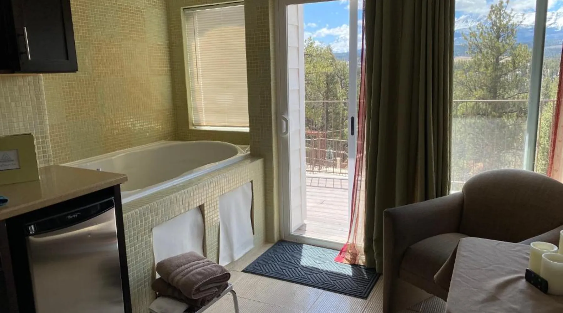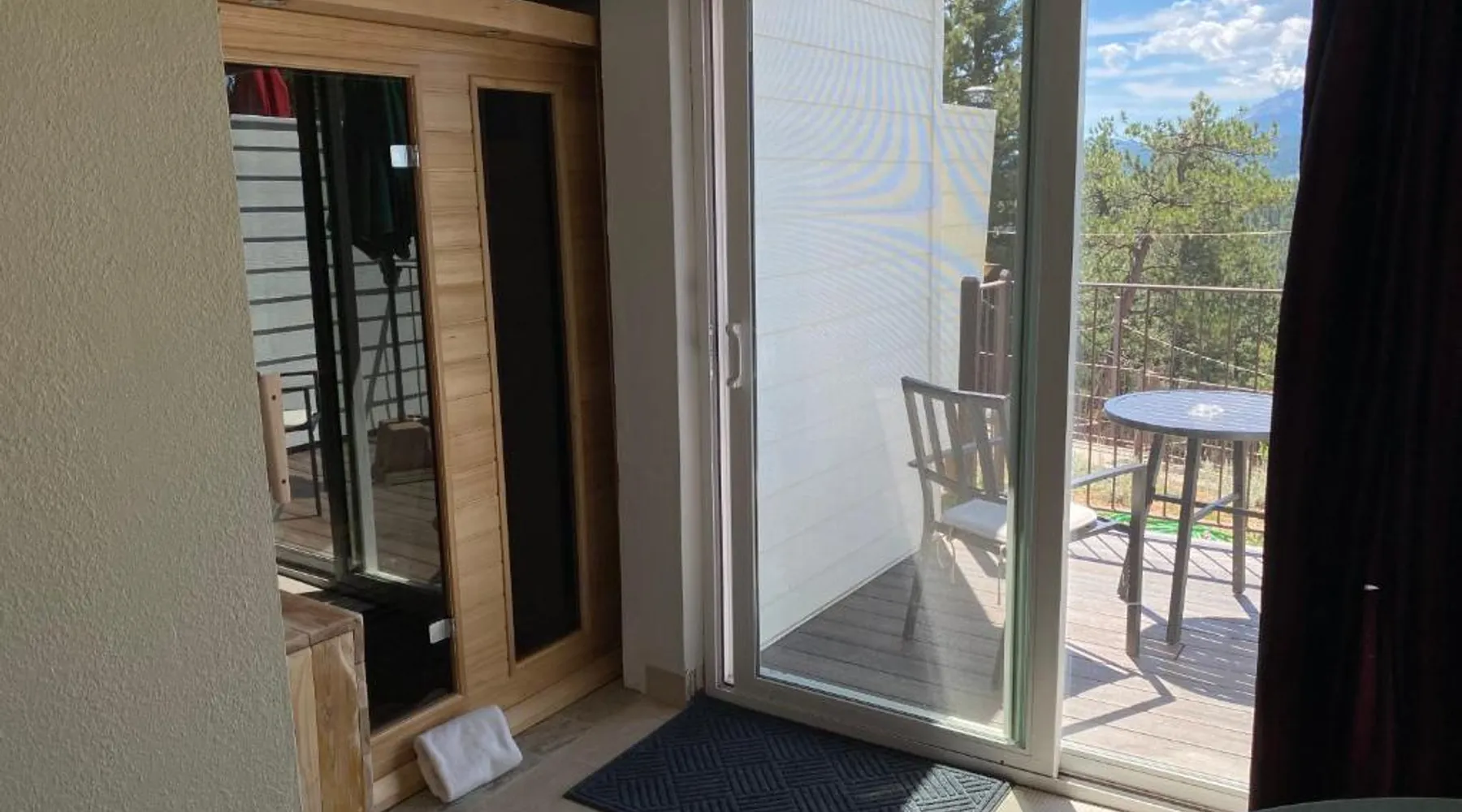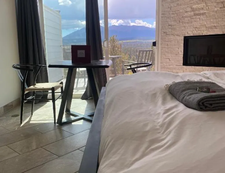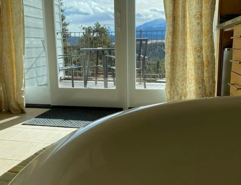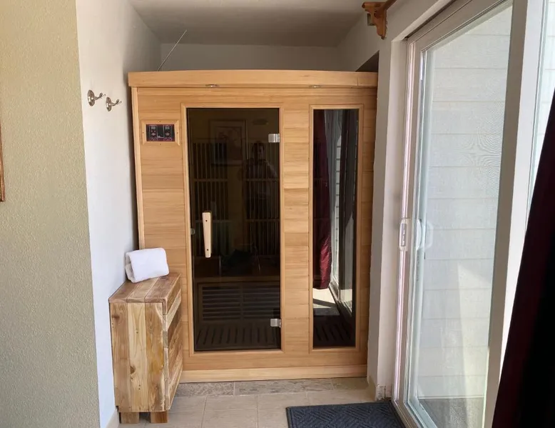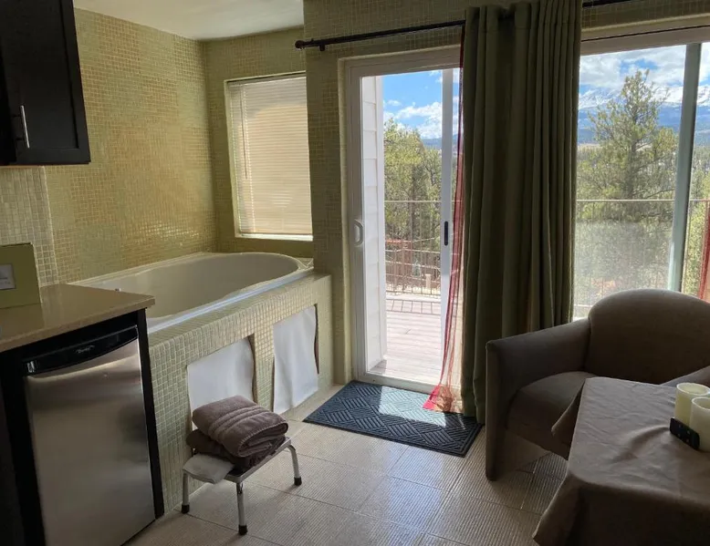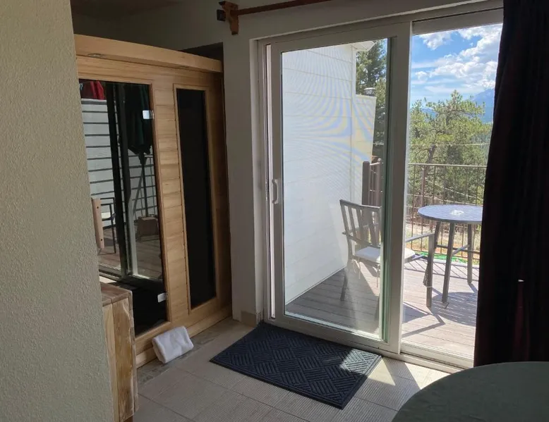 Comfortable Accommodations: Pikes Peak Paradise Bed and Breakfast in Woodland Park offers comfortable rooms with private bathrooms, balconies, and mountain views. Each room includes a tea and coffee maker, refrigerator, and free toiletries. Exceptional Facilities: Guests can relax on the sun terrace or stay connected with free WiFi. The property features a lounge, outdoor fireplace, and outdoor seating area. Additional amenities include a kitchenette, sauna, and spa bath. Delicious Breakfast: A variety of breakfast options are available, including American, vegetarian, vegan, and gluten-free. Breakfast includes warm dishes, juice, pancakes, and fruits. Room service and breakfast in the room enhance the stay. Local Attractions: Located 31 mi from Colorado Springs Airport, the bed and breakfast is near Garden of the Gods (22 mi) and Rock Ledge Ranch Historic Site (22 mi). Activities such as yoga, fitness, hiking, and cycling are available. This suite features a private balcony, a 2-person sauna and heated porcelain tile floors. A flat-screen TV with a DVD player is also included.