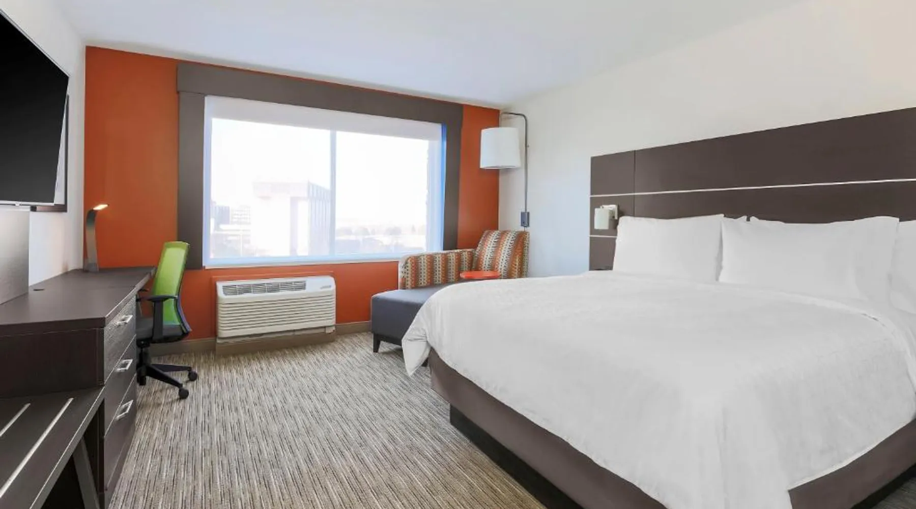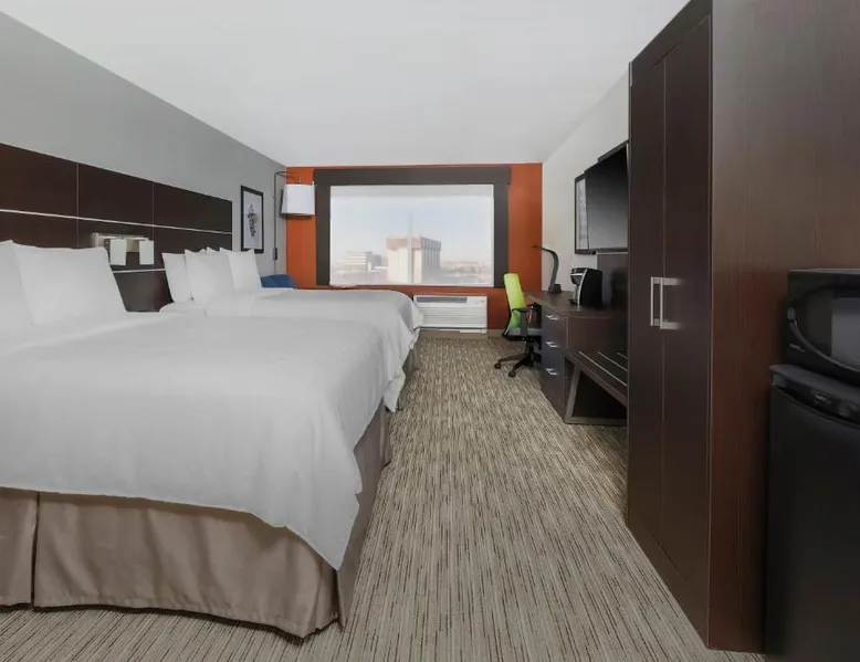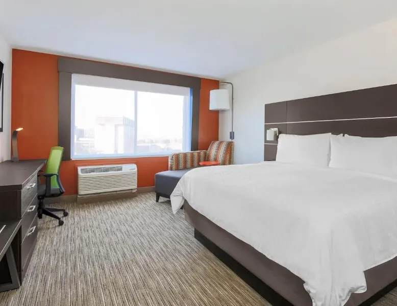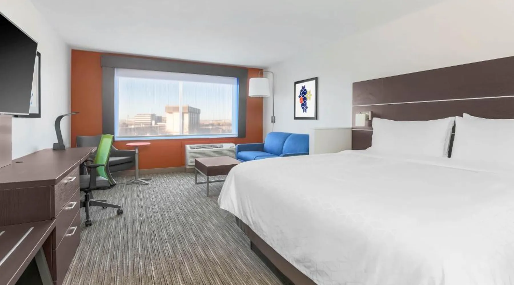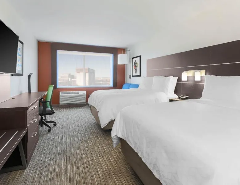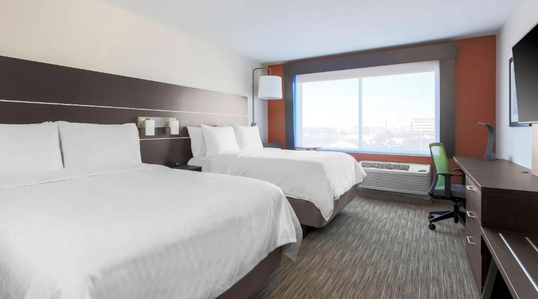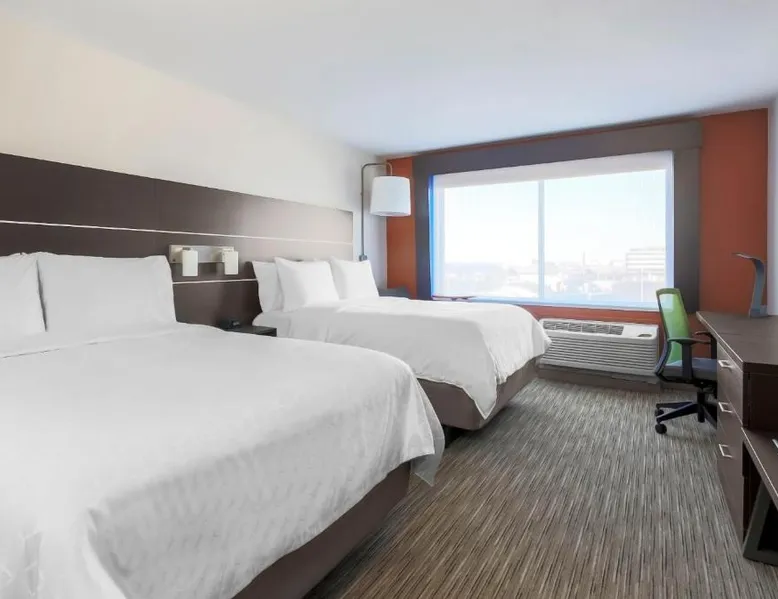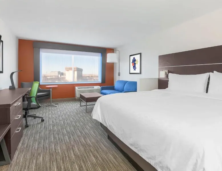 Comfortable Accommodations: Holiday Inn Express & Suites Chicago O'Hare Airport by IHG in Des Plaines offers air-conditioned rooms with private bathrooms, free WiFi, and modern amenities. Each room includes a work desk, TV, and complimentary toiletries. Leisure Facilities: Guests can enjoy a fitness center, indoor swimming pool, and a lounge. Additional facilities include a minimarket, business area, and 24-hour front desk. Dining Options: A continental buffet breakfast is served daily, featuring fresh pastries, cheese, fruits, and juice. Convenient Location: Located a few steps from Chicago O'Hare International Airport, the hotel is near attractions such as Loyola University Chicago (12 mi) and Wrigley Field (14 mi). Guests appreciate the connectivity and room cleanliness. The spacious double room provides air conditioning, a wardrobe, as well as a private bathroom featuring a shower and a hairdryer. The double room offers a safe deposit box, a tiled floor, a carpeted floor, heating and a flat-screen TV with cable channels. The unit offers 1 bed.