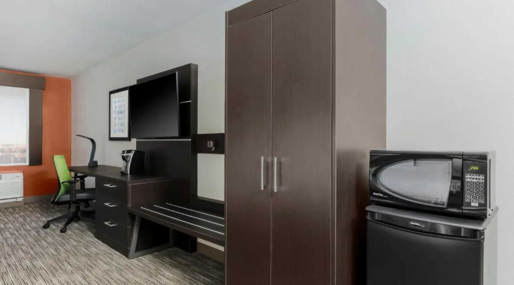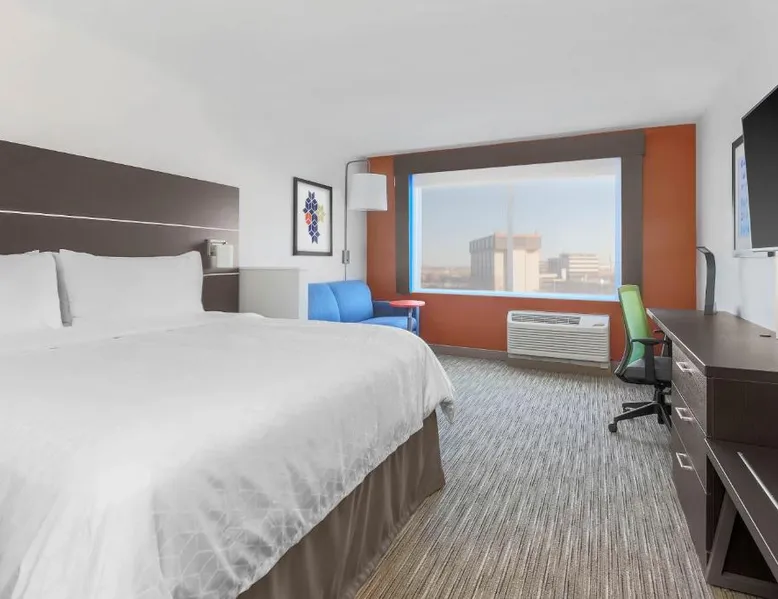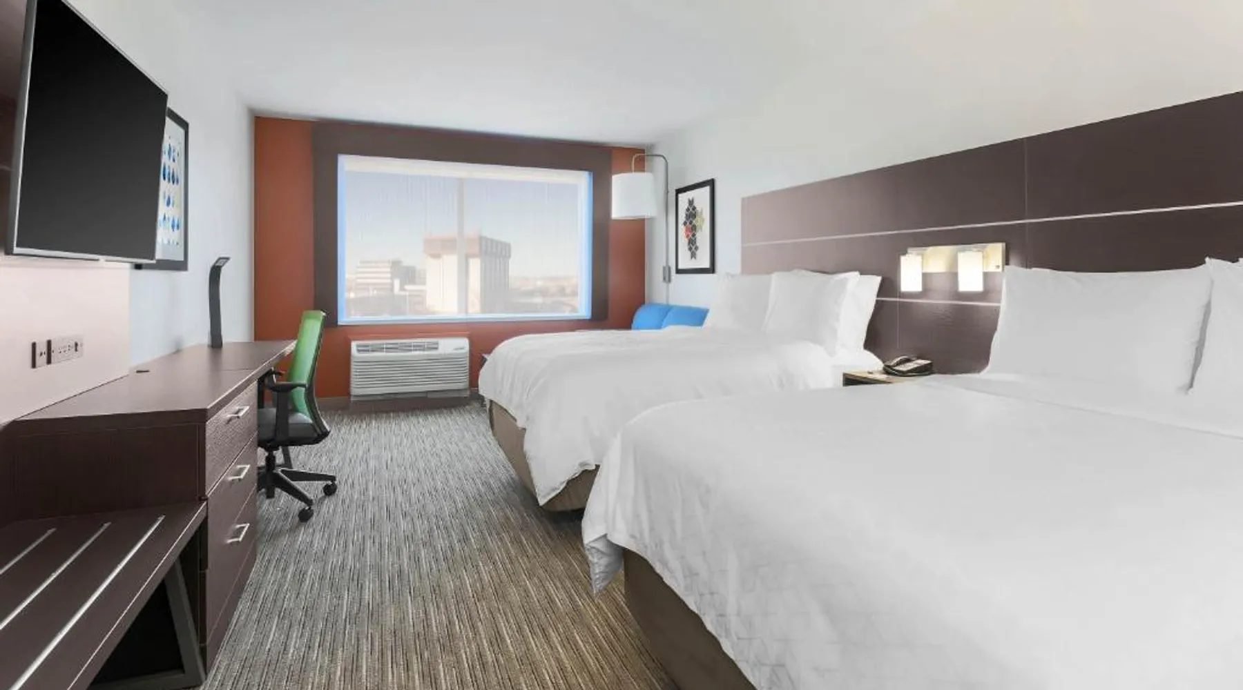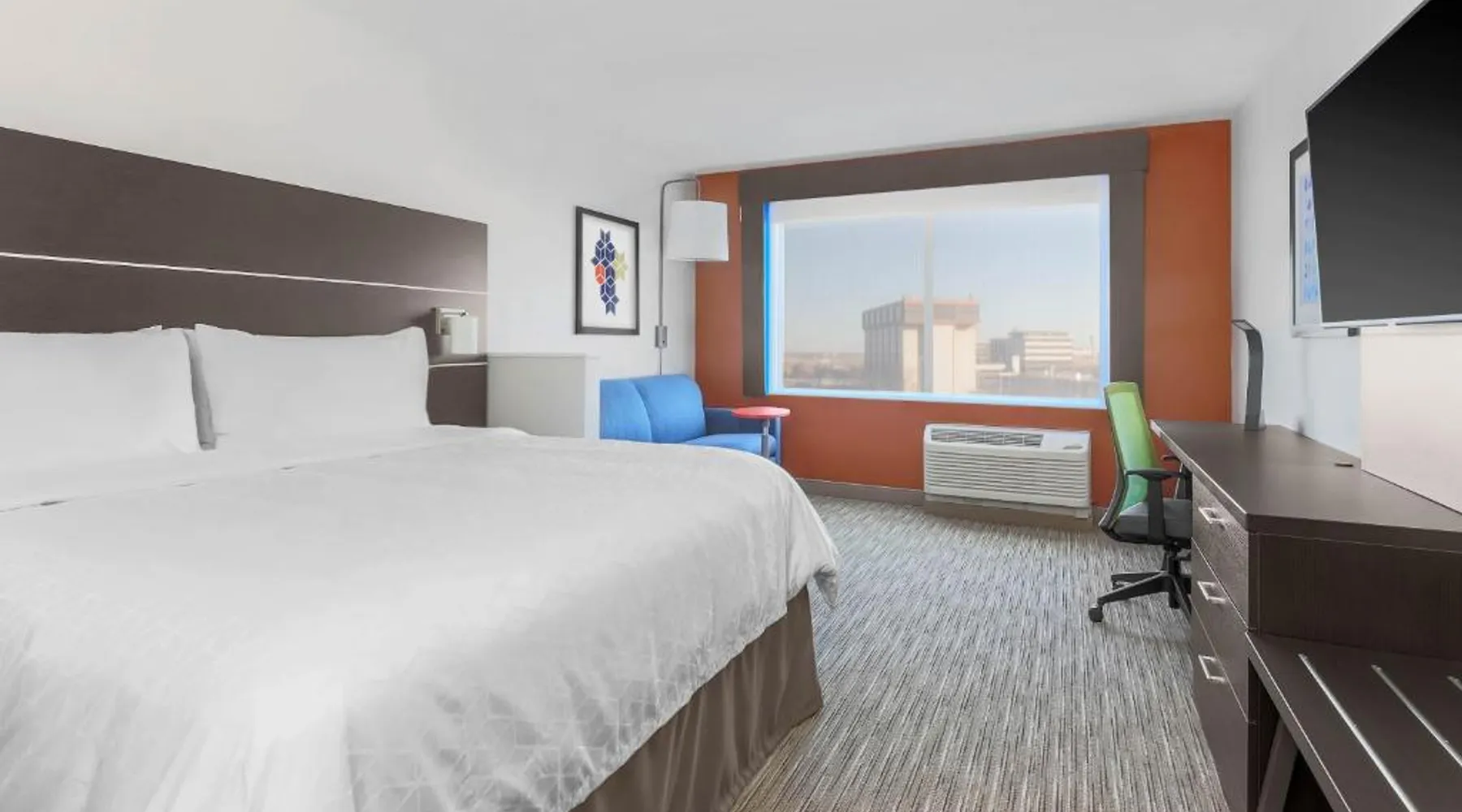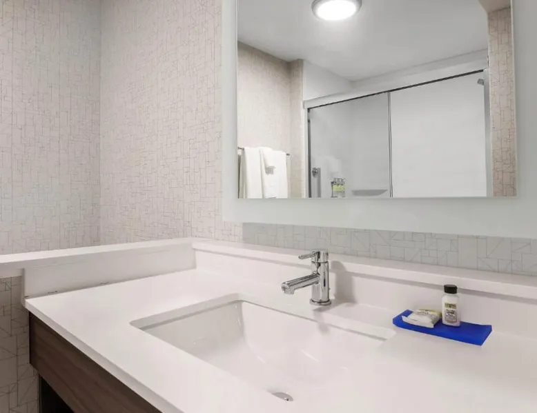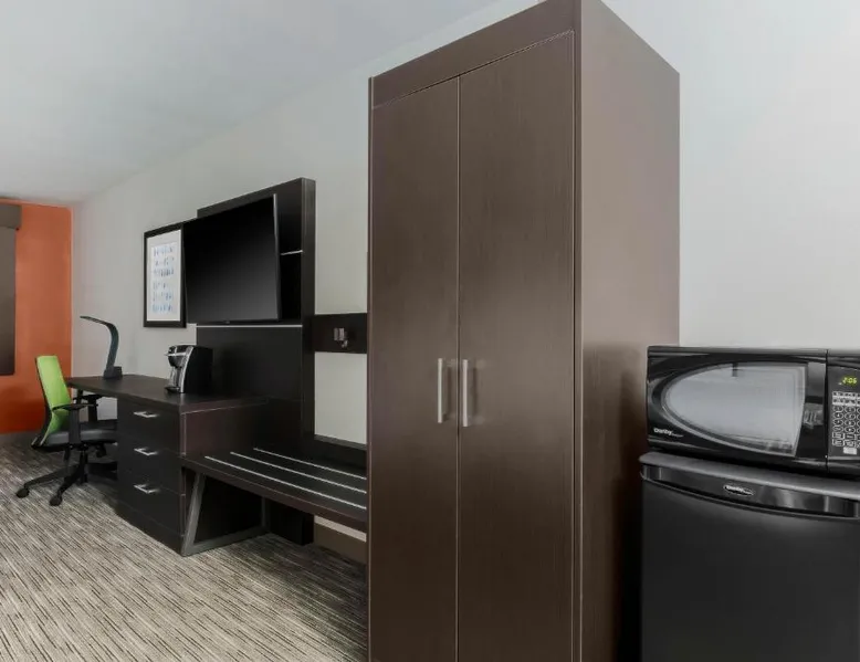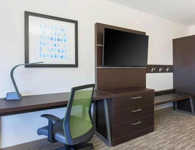 Comfortable Accommodations: Holiday Inn Express & Suites Chicago O'Hare Airport by IHG in Des Plaines offers air-conditioned rooms with private bathrooms, free WiFi, and modern amenities. Each room includes a work desk, TV, and complimentary toiletries. Leisure Facilities: Guests can enjoy a fitness center, indoor swimming pool, and a lounge. Additional facilities include a minimarket, business area, and 24-hour front desk. Dining Options: A continental buffet breakfast is served daily, featuring fresh pastries, cheese, fruits, and juice. Convenient Location: Located a few steps from Chicago O'Hare International Airport, the hotel is near attractions such as Loyola University Chicago (12 mi) and Wrigley Field (14 mi). Guests appreciate the connectivity and room cleanliness. The spacious double room provides air conditioning, a wardrobe, as well as a private bathroom featuring a shower and a hairdryer. The double room offers a safe deposit box, a tiled floor, a carpeted floor, heating and a flat-screen TV with cable channels. The unit offers 1 bed.