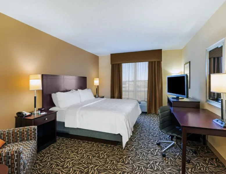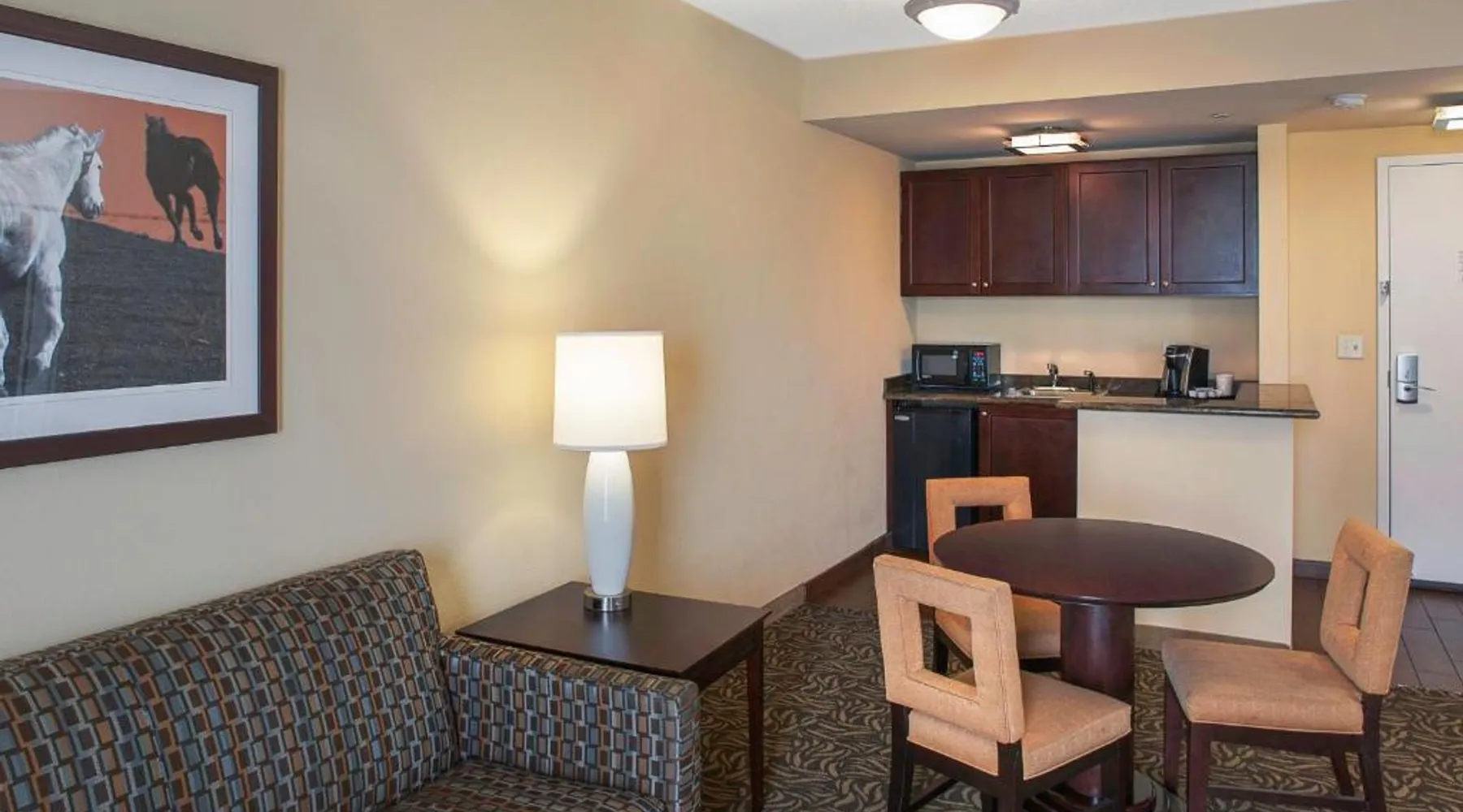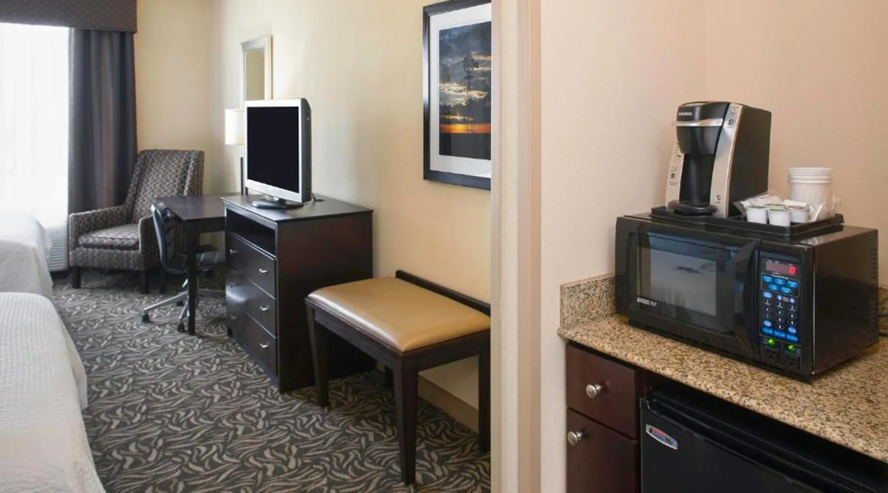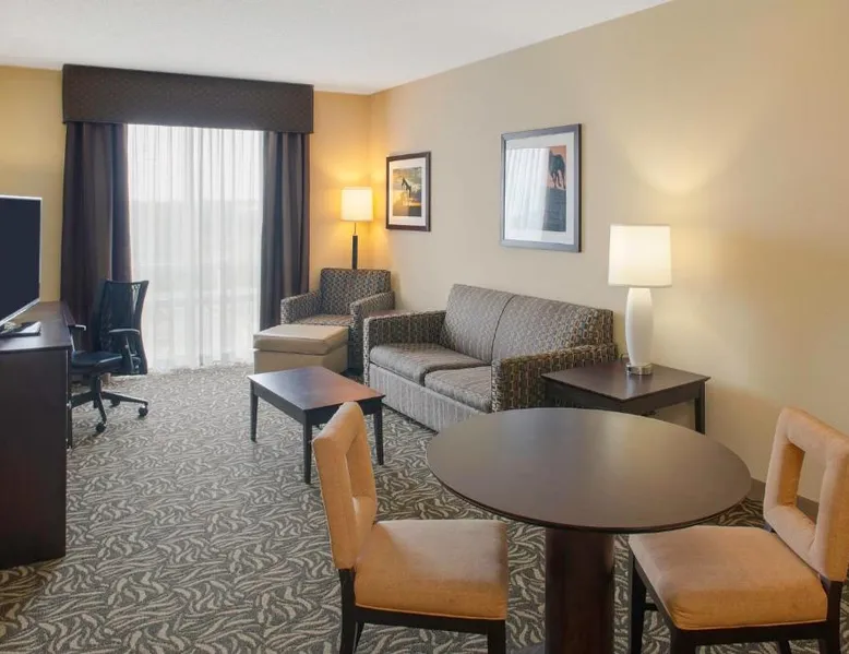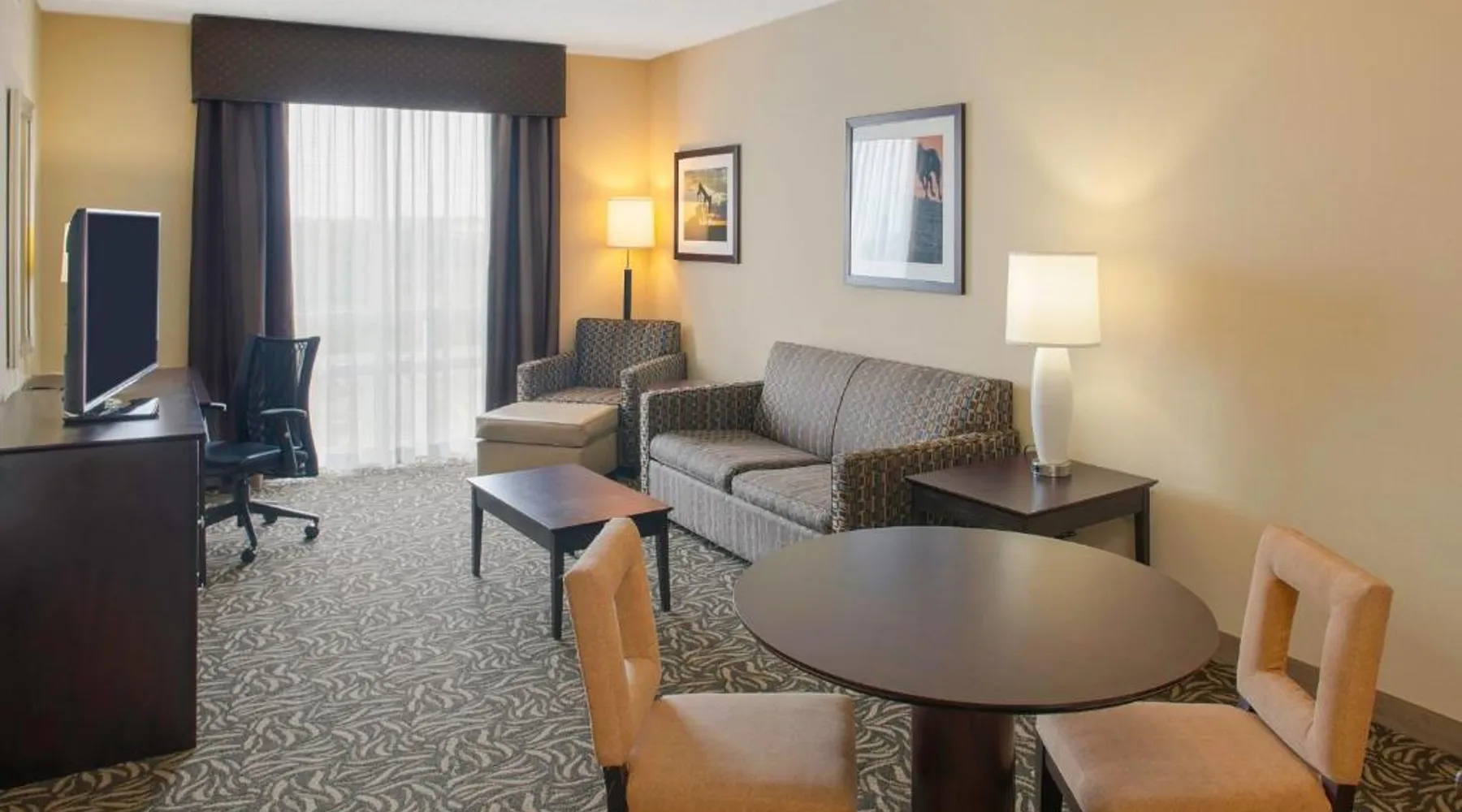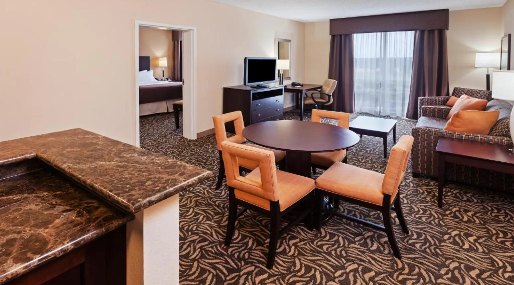 Comfortable Accommodations: Holiday Inn Ardmore by IHG in Ardmore offers comfortable rooms with air-conditioning, private bathrooms, and modern amenities. Each room includes a tea and coffee maker, refrigerator, and free WiFi. Dining and Leisure: Guests can enjoy a traditional restaurant serving American cuisine, a bar, and a seasonal outdoor swimming pool. The hotel features a fitness center, lounge, and outdoor seating area. Convenient Services: The property provides free on-site parking, a 24-hour front desk, and express check-in and check-out services. Additional amenities include a minimarket, business area, and laundry service. Guest Satisfaction: Highly rated by guests for its attentive staff and excellent service support. Features a separate living area with dining table, sofa bed and 2 flat-screen TVs.