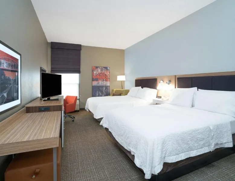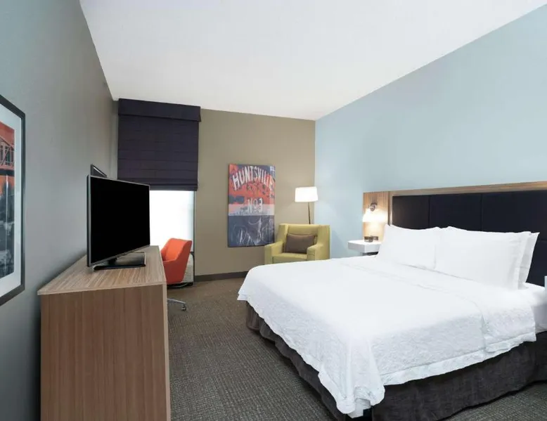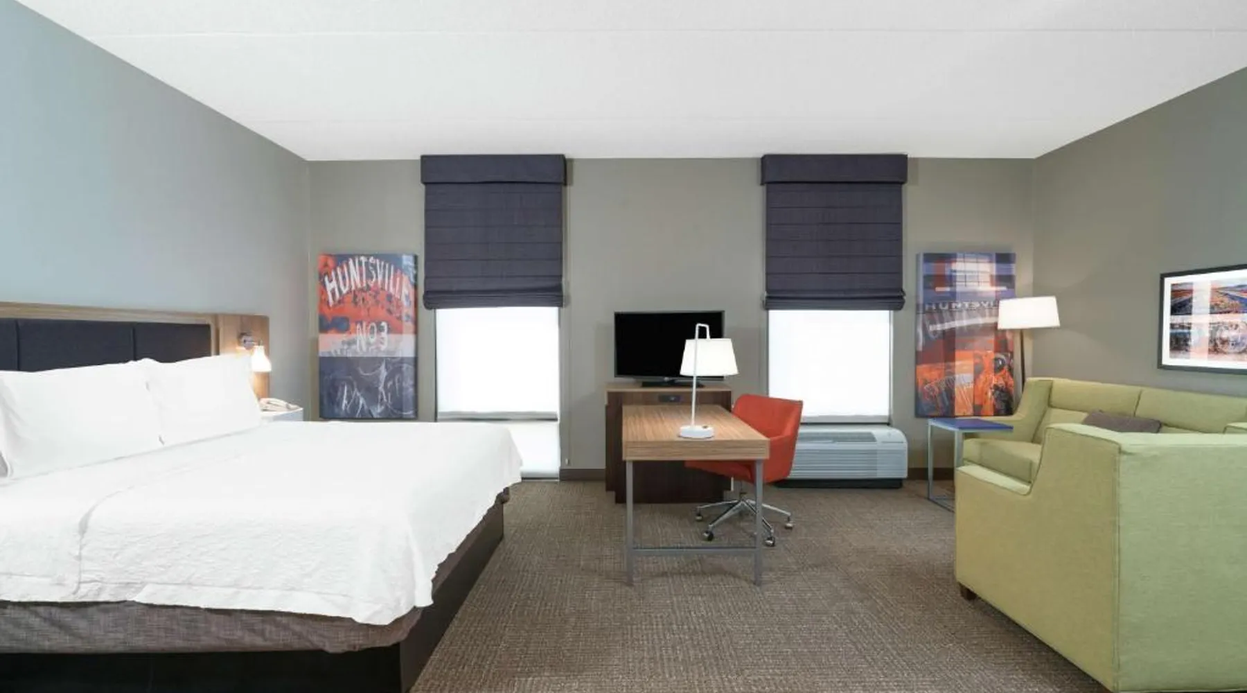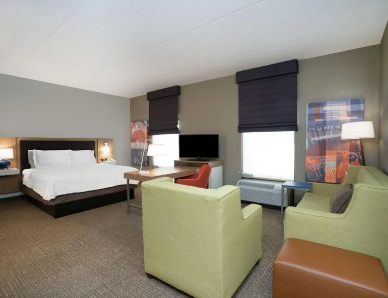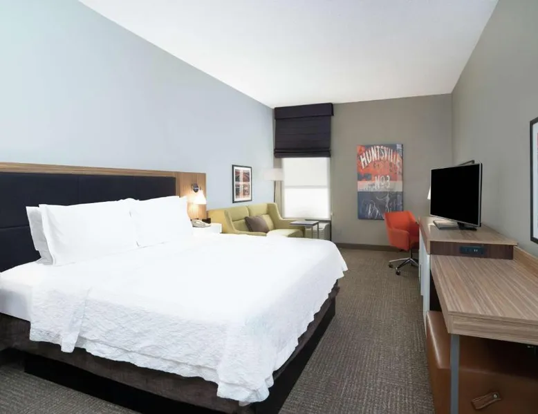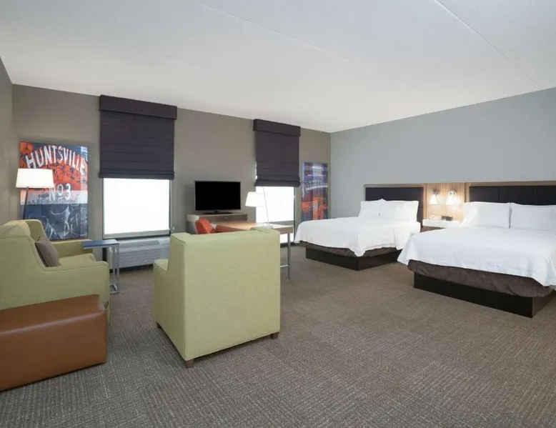Comfortable Accommodations: Hampton Inn Huntsville-Madison in Madison offers family rooms with free WiFi, air-conditioning, and modern amenities. Each room includes a refrigerator, microwave, tea and coffee maker, and a work desk. Leisure Facilities: Guests can enjoy an outdoor swimming pool and a fitness room. The hotel provides a free airport shuttle service to Huntsville International Airport, 2.5 mi away. Dining Options: A complimentary American buffet breakfast is served daily, featuring warm dishes, juice, and fruits. Additional amenities include a 24-hour front desk, free on-site parking, and a elevator. Local Attractions: Nearby attractions include Toyota Field (3.1 mi), University of Alabama in Huntsville (8.7 mi), and Southern Adventures (12 mi). Scuba diving is available in the surrounding area. Spacious studio features a living area with a sofa bed, dining table and flat-screen TV. Rates are based on 2 guests. A maximum of 6 guests can stay in this room. Please refer to the policies for fees that will apply for additional guests
