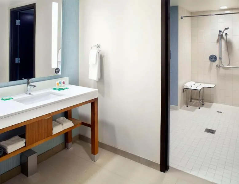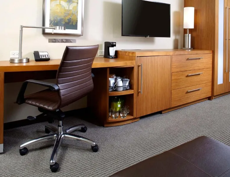 Comfortable Accommodations: Hyatt Place Cleveland/Lyndhurst/Legacy Village in Lyndhurst offers family rooms with air-conditioning, private bathrooms, and modern amenities. Each room includes a tea and coffee maker, hypoallergenic bedding, and free WiFi. Dining and Leisure: The family-friendly restaurant serves American cuisine, complemented by a bar. Guests can also enjoy an indoor swimming pool, fitness center, and lounge. Free on-site parking is available. Prime Location: Located a few steps from Contessa Gallery and a 17-minute walk to Beachwood Place Mall, the hotel is near attractions such as Cleveland Cinemas and Canterbury Golf Club. Guests appreciate the convenient location and nearby shops. This room features a flat-screen TV and air conditioning.