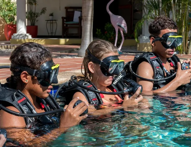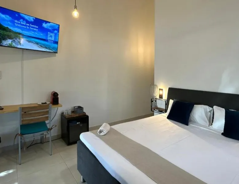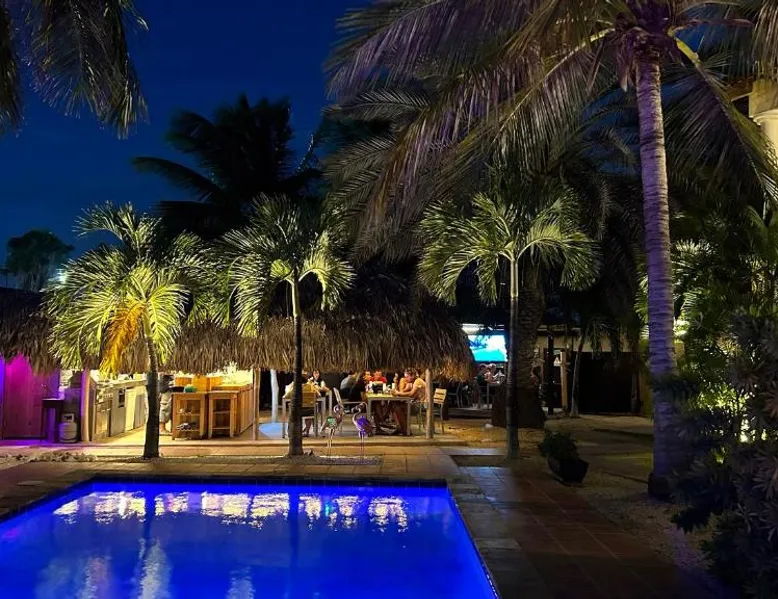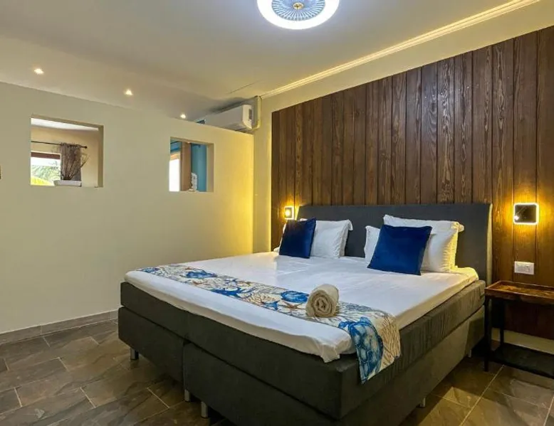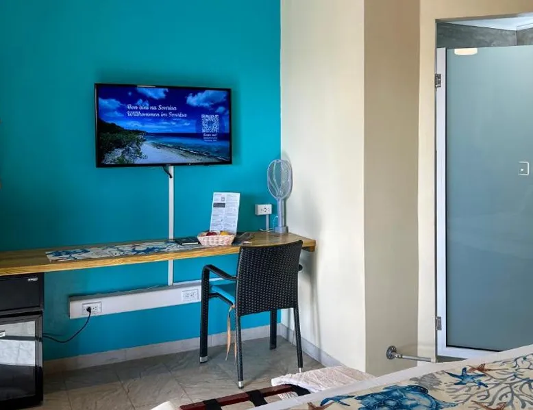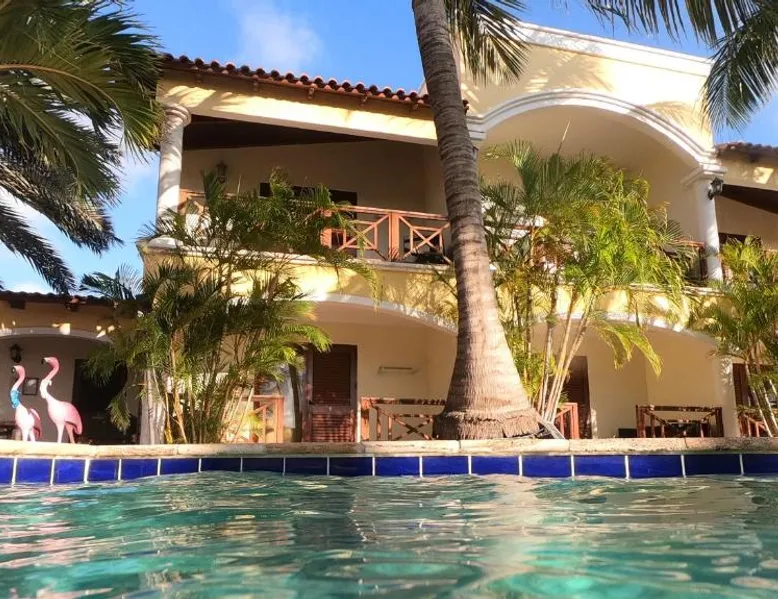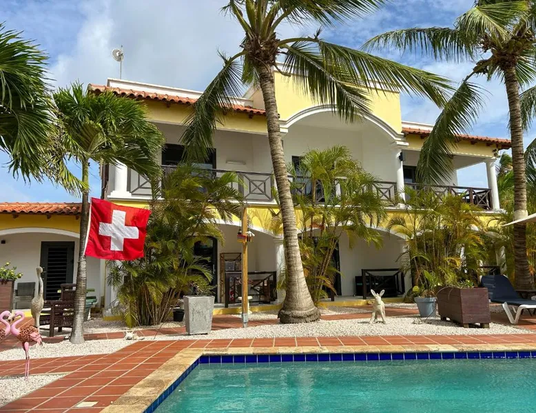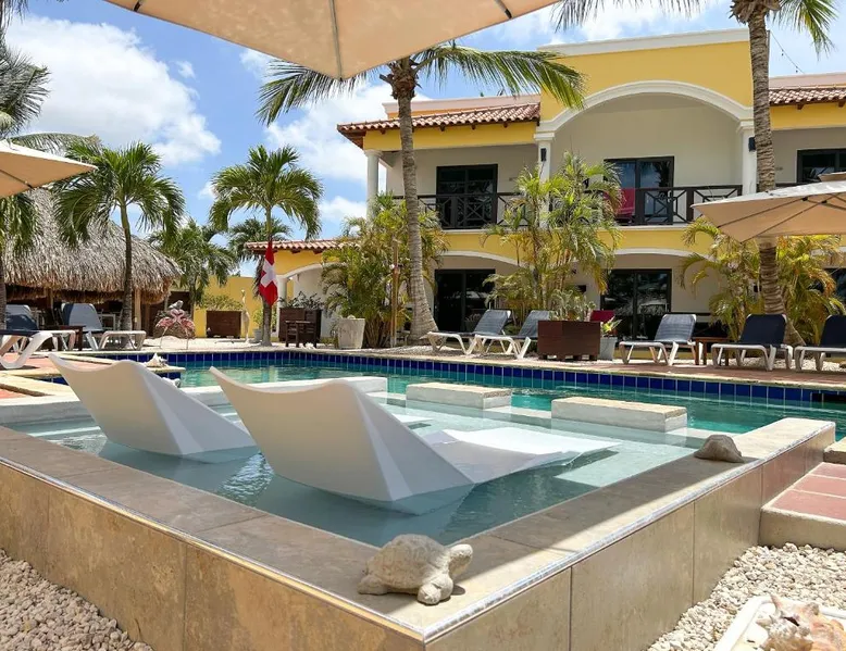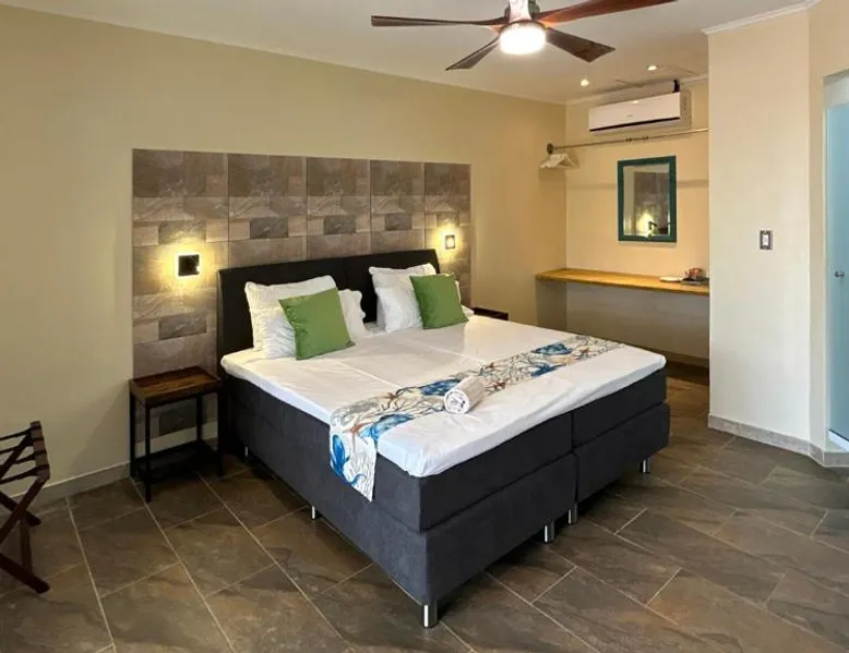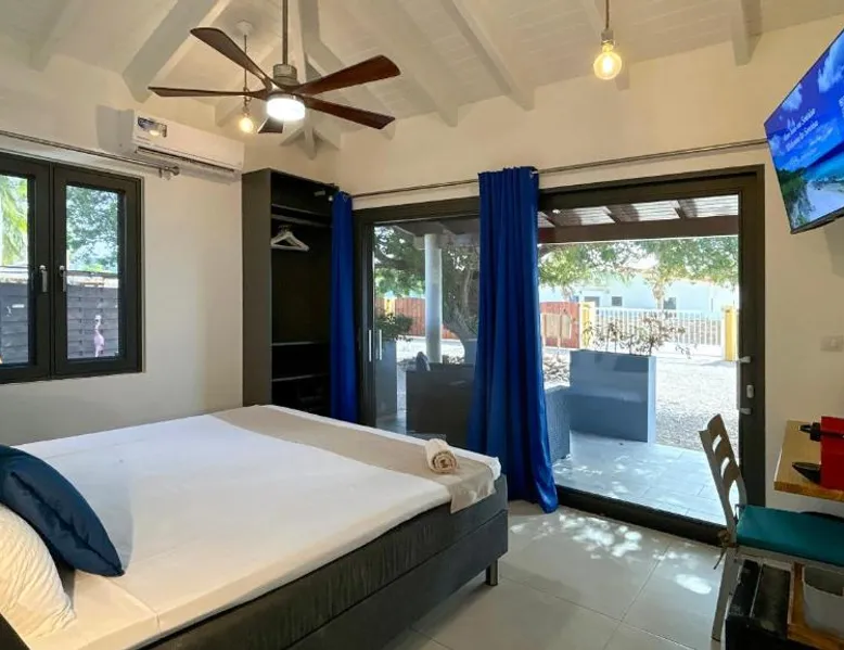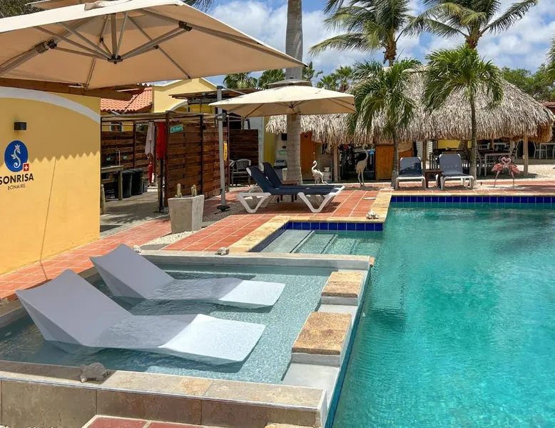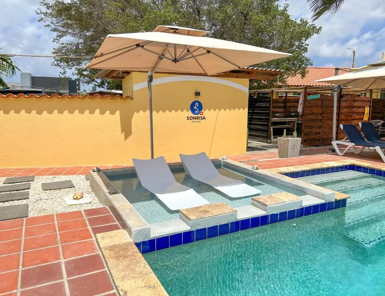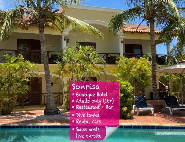 Our Adults Only Boutique Hotel Sonrisa offers “sleep, drive & dove” packages with a personal touch. Corinne and Beat enjoy the opportunity to offer hospitality and personalized assistance to every guest who stays with us. Our charming boutique hotel was built in the colorful style characteristic of the country. With a beautiful swimming pool and a spacious garden oasis, our guests get into the vacation mood directly on arrival. With only 10 spacious suites, they enjoy a private atmosphere where they can switch off and let Bonaire enchant them. We offer a special selection of rental cars. All of them are suitable to visit the national park, to dove or to explore the island. On-site dove tanks (free Nitrox upgrade), rinse and store facilities for dove gear are available for our guests as well as rental diving and snorkeling equipment. We are looking forward to welcome you! Featuring a private entrance, this air-conditioned suite consists of 1 bedroom and 1 bathroom with a shower and a hairdryer. Boasting a terrace with garden views, this suite also provides soundproof walls and a flat-screen TV. The unit offers 1 bed.