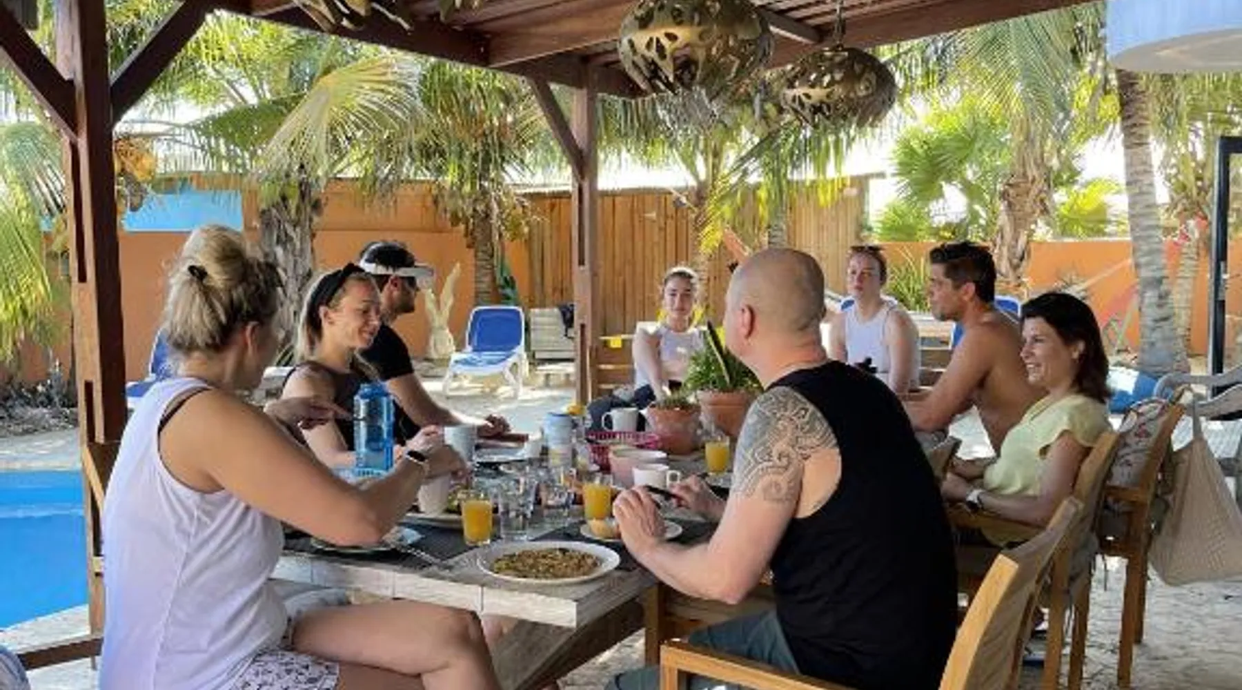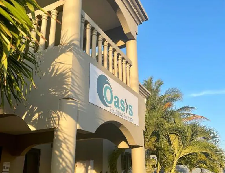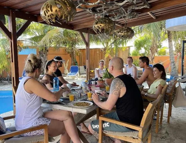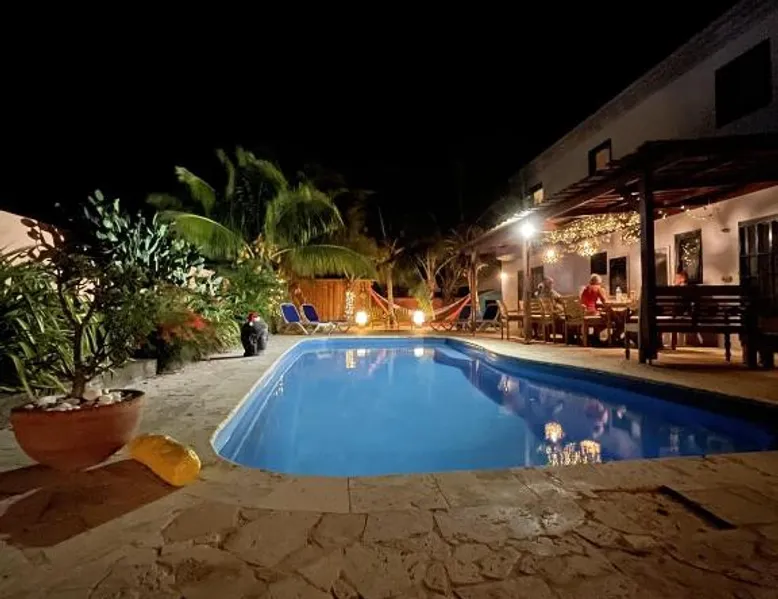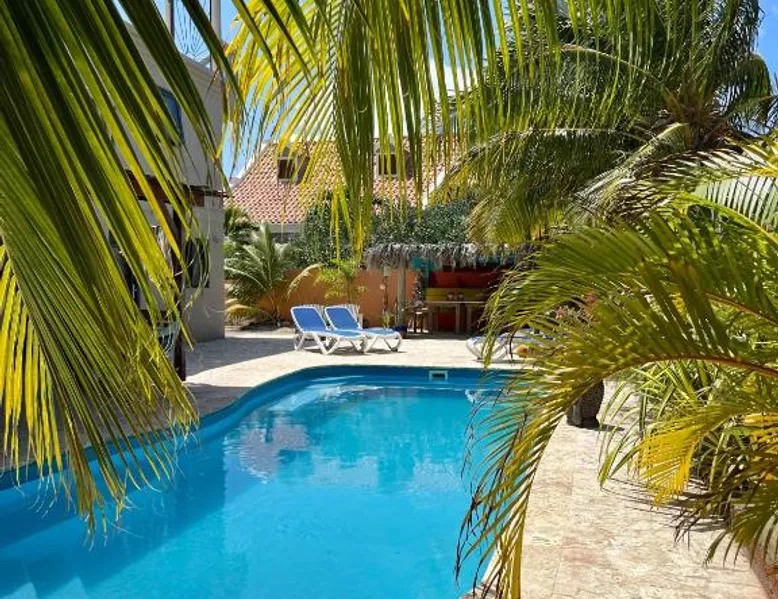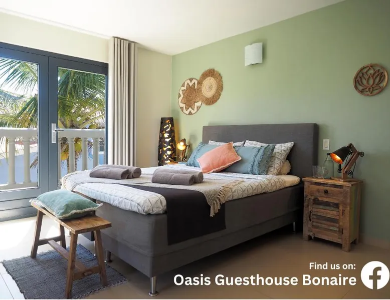 Comfortable Accommodations: Oasis guest house in Kralendijk offers family rooms with private bathrooms, air-conditioning, and modern amenities. Each room includes a kitchen, TV, and free WiFi, ensuring a pleasant stay. Leisure Facilities: Guests can relax by the saltwater swimming pool, sun terrace, and lush garden. Additional amenities include a coffee shop, outdoor seating area, and barbecue facilities, providing ample opportunities for leisure and socializing. Convenient Location: Located 3281 feet from Flamingo International Airport, the guest house is a short walk from Bachelor's Beach and 1.2 mi from Te Amo Beach. Scuba diving opportunities enhance the surrounding area. Guest Services: Private check-in and check-out, a paid shuttle service, and concierge assistance are available. Free on-site parking, bicycle parking, and bike hire cater to various travel needs. The Family Room offers air conditioning, a mini-bar and LCD flat-screen cable TV. It also features a safety deposit box and a wardrobe. Views of the pool and city landmarks are available. The private bathroom has a shower.
