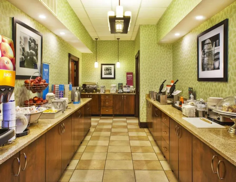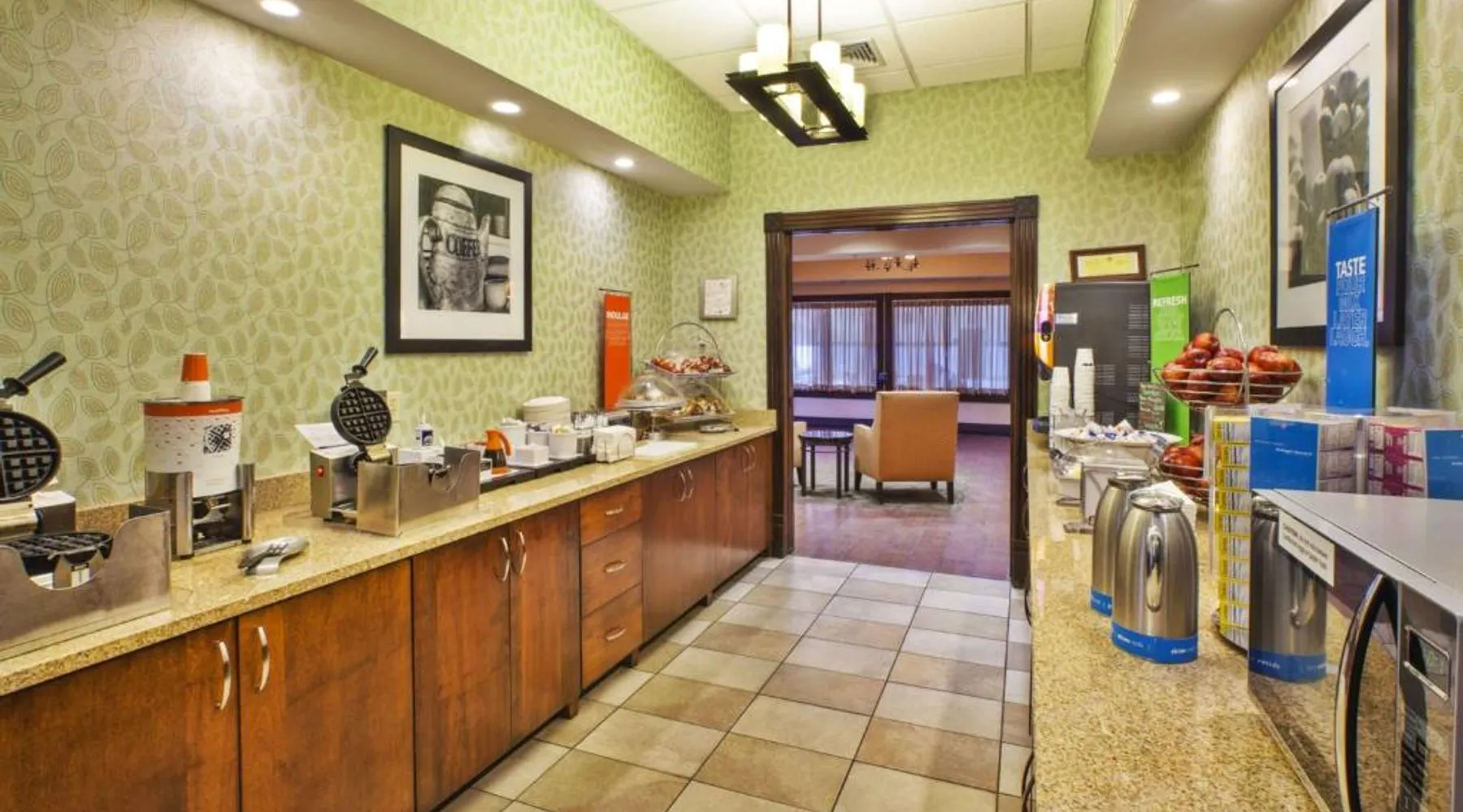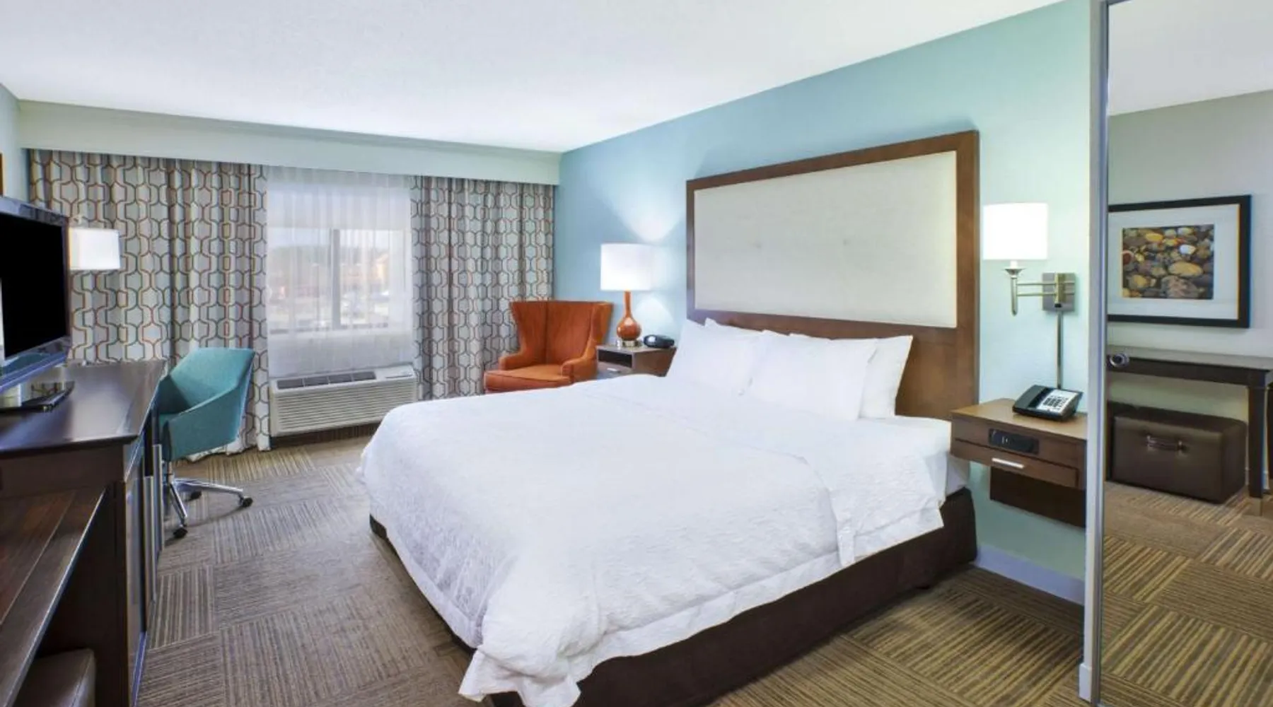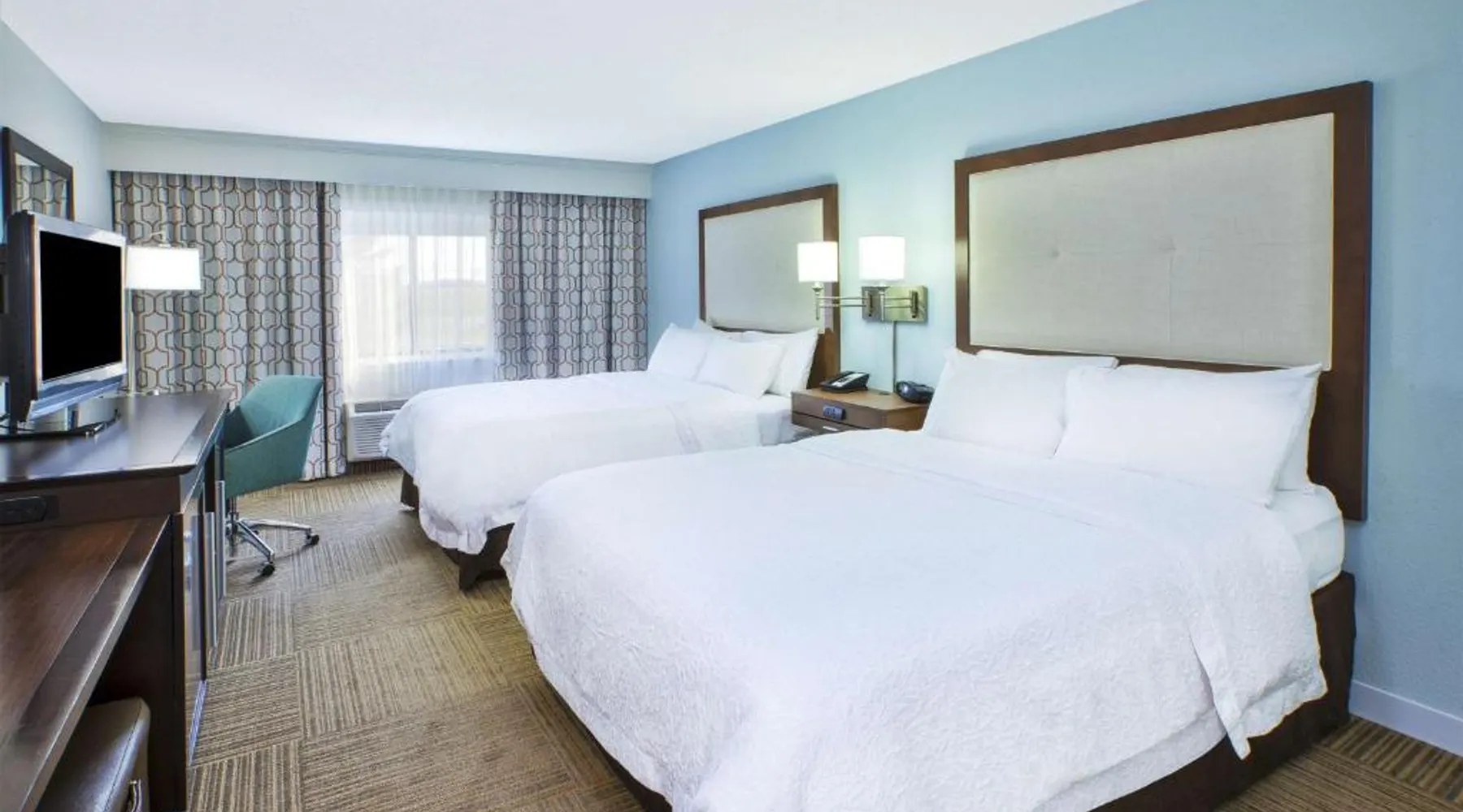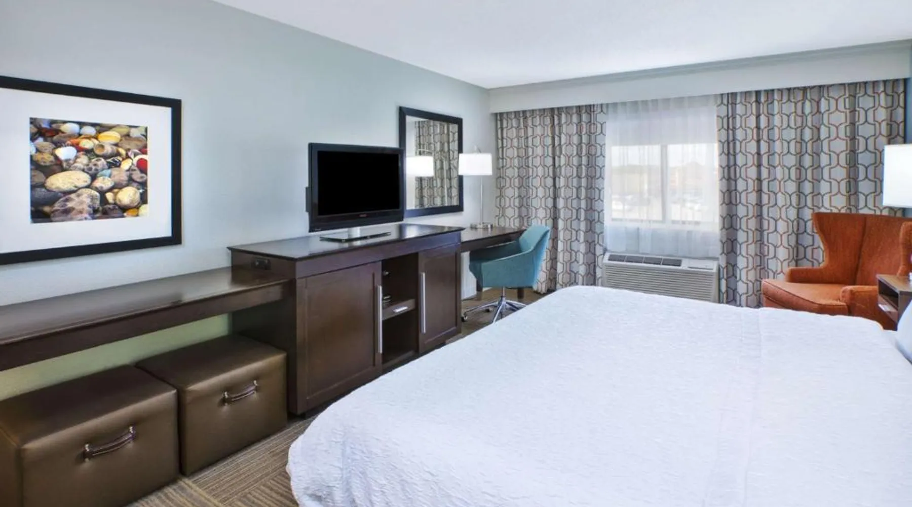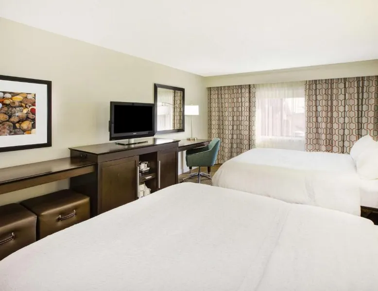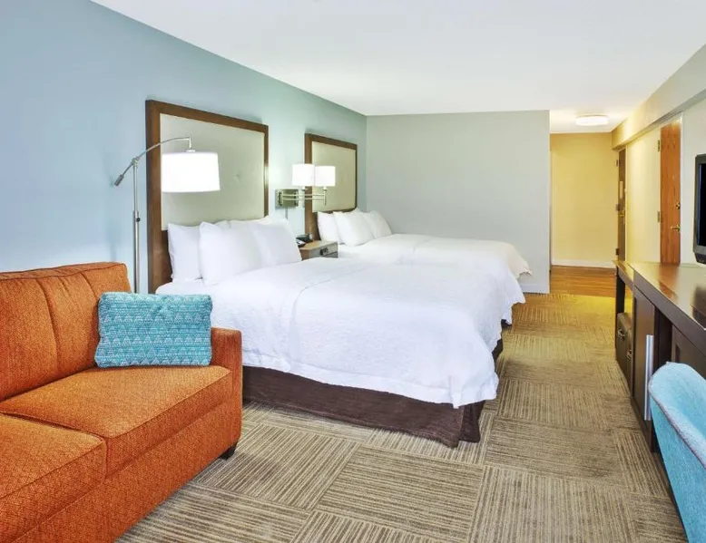 Comfortable Accommodations: Hampton Inn Gaylord in Gaylord offers family rooms with free WiFi, air-conditioning, and modern amenities. Each room includes a tea and coffee maker, hairdryer, free toiletries, shower, and TV. Leisure Facilities: Guests can enjoy a fitness center, indoor swimming pool, and a beautiful garden. Additional facilities include a lounge, fitness room, elevator, 24-hour front desk, electric vehicle charging station, and outdoor seating area. Dining Options: A continental buffet breakfast is served daily, featuring warm dishes, fresh pastries, and juice. Special diet menus are available, and daily housekeeping ensures room cleanliness. Location and Attractions: Located 50 mi from Pellston Regional Airport and 22 mi from Monument Golf Course, the hotel provides easy access to skiing and cycling activities. Guests appreciate the attentive staff and convenient location. This air conditioned room includes a flat-screen TV with premium channel. desk and coffee maker.