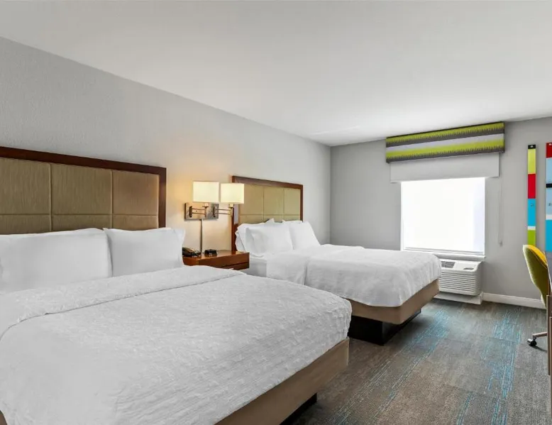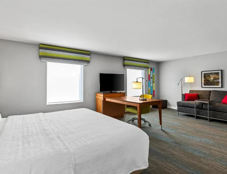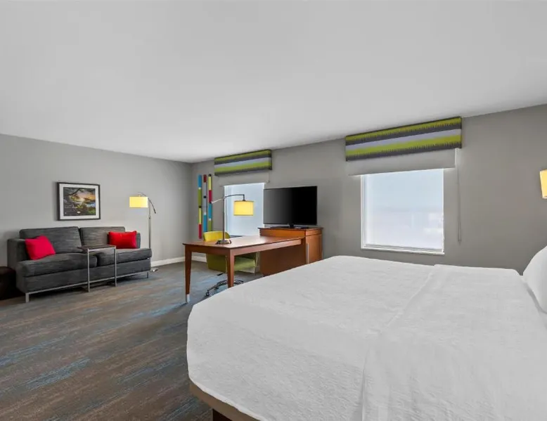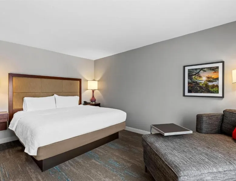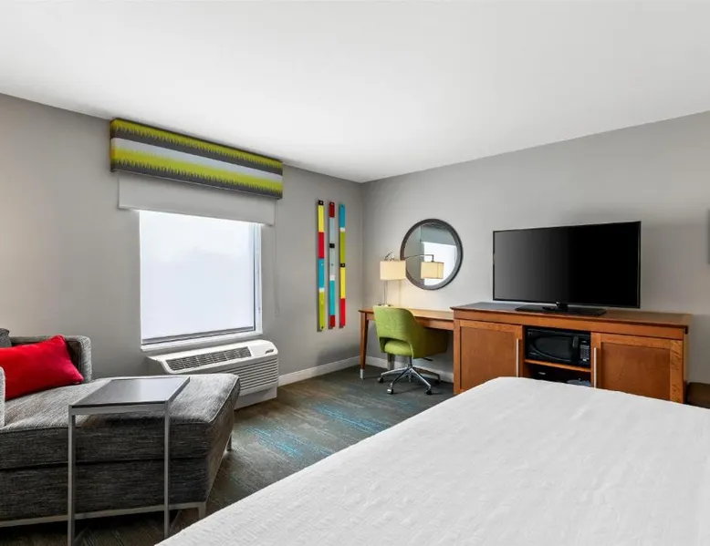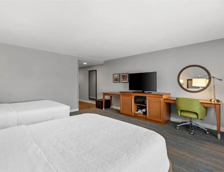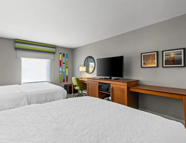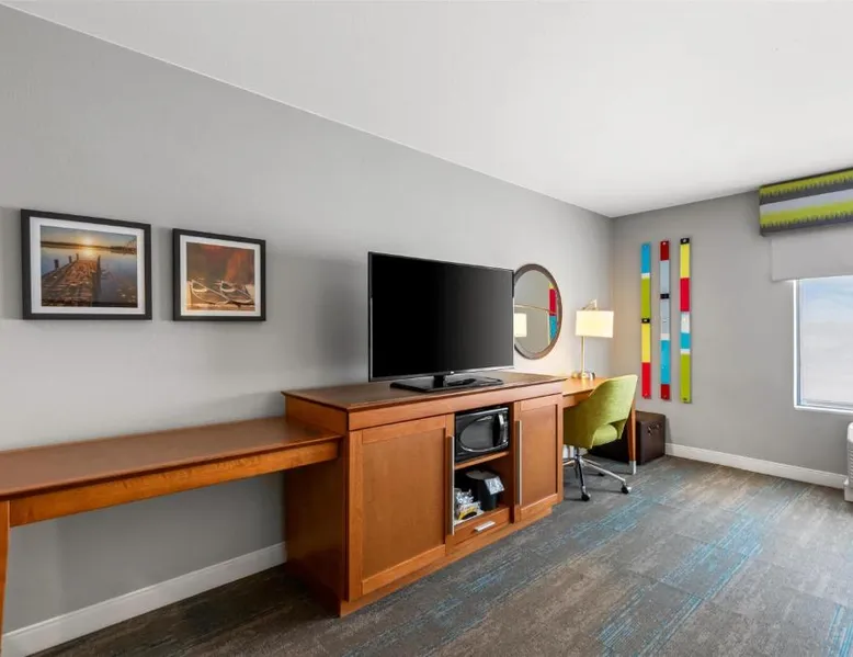 Comfortable Accommodations: Hampton Inn Fond du Lac in Fond du Lac offers family rooms with balconies, tea and coffee makers, hairdryers, refrigerators, microwaves, showers, and TVs. Each room includes a sofa bed and seating area. Exceptional Facilities: Guests enjoy an indoor swimming pool, free WiFi, fitness room, elevator, and 24-hour front desk. Free on-site private parking is available. Convenient Location: Located 35 mi from Outagamie County Regional Airport, the hotel is near EAA AirVenture Museum (17 mi), University of Wisconsin-Oshkosh (21 mi), Oshkosh Public Museum (21 mi), and New Holstein Historical Society: Timm House (29 mi). Guest Satisfaction: Highly rated for its breakfast and room cleanliness, the hotel ensures a pleasant stay for all visitors. This room features a flat-screen TV, coffee maker and free in-room movie channels. The room includes disability accessible amenities.