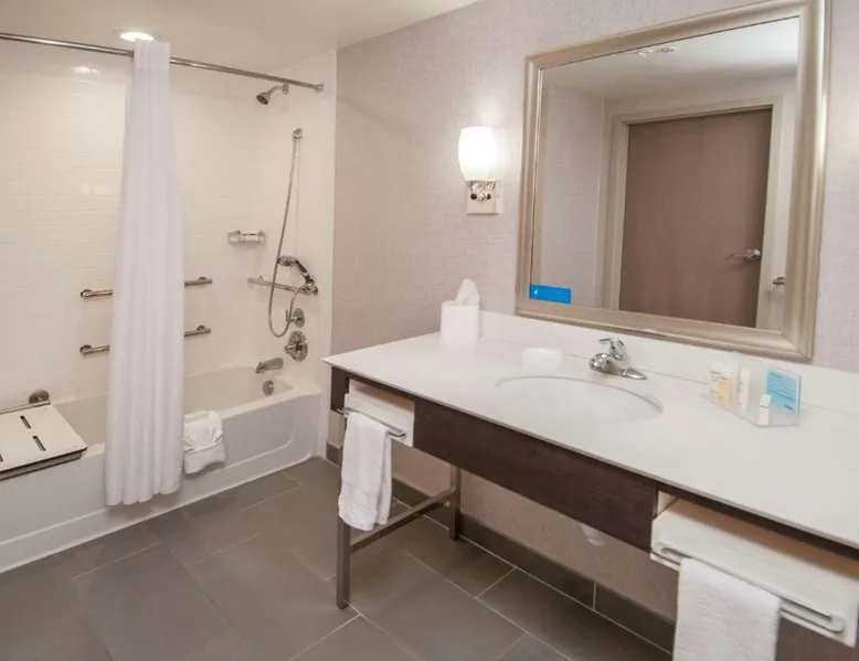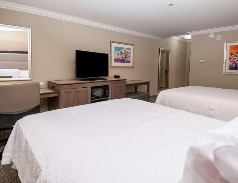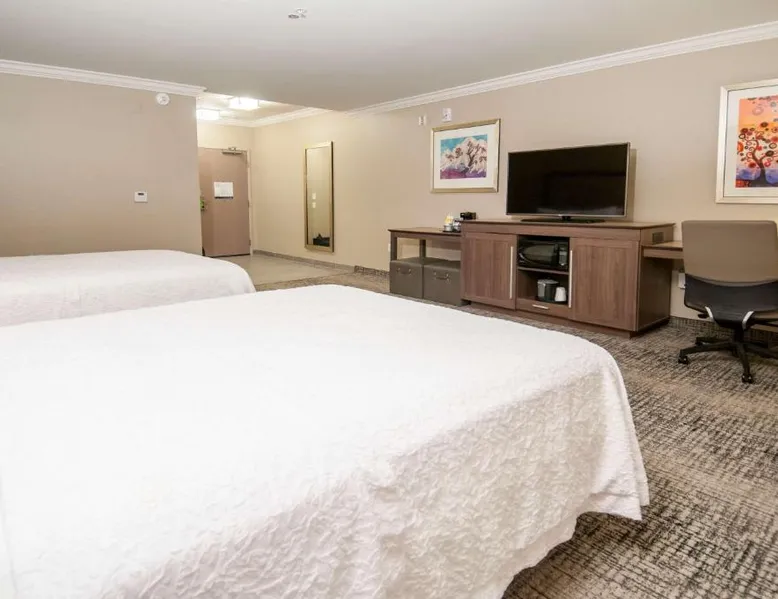 Comfortable Accommodations: Hampton Inn & Suites Ridgeland in Ridgeland offers adults-only rooms with air-conditioning, free WiFi, and amenities such as tea and coffee makers, refrigerators, and work desks. Leisure Facilities: Guests can enjoy a fitness center, sun terrace, indoor swimming pool, and outdoor seating area. Additional facilities include a lounge, fitness room, and business area. Convenient Location: Located 14 mi from Jackson-Evers Airport, the hotel is near attractions like Mississippi Coliseum (11 mi) and Mississippi Veterans Memorial Stadium (9.3 mi). Free off-site parking is available. Guest Services: The property provides a 24-hour front desk, daily housekeeping, child-friendly buffet, and luggage storage. Free WiFi is accessible throughout the hotel. The air-conditioned quadruple room features a flat-screen TV with cable channels, a tea and coffee maker, a seating area and heating. The unit has 2 beds.
