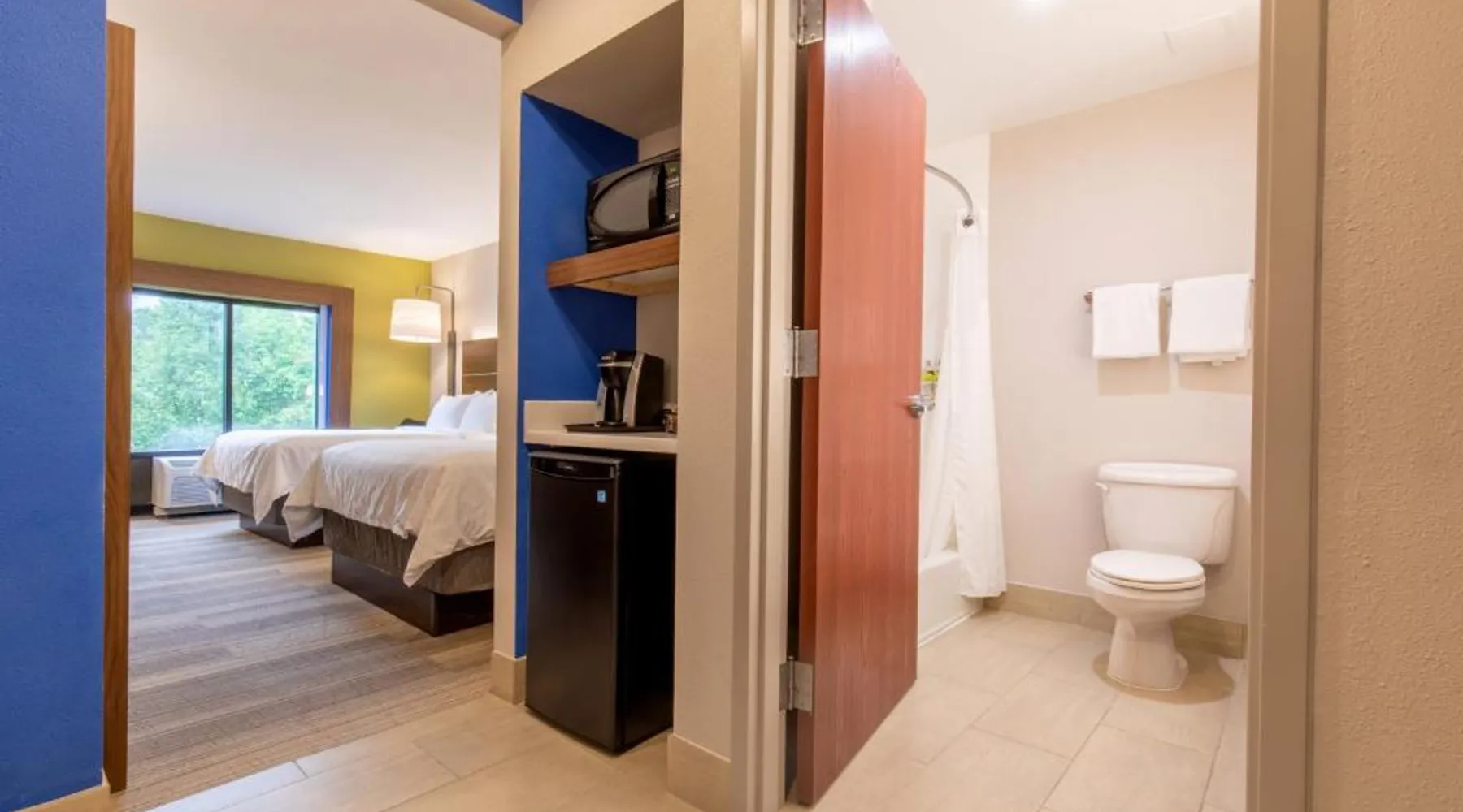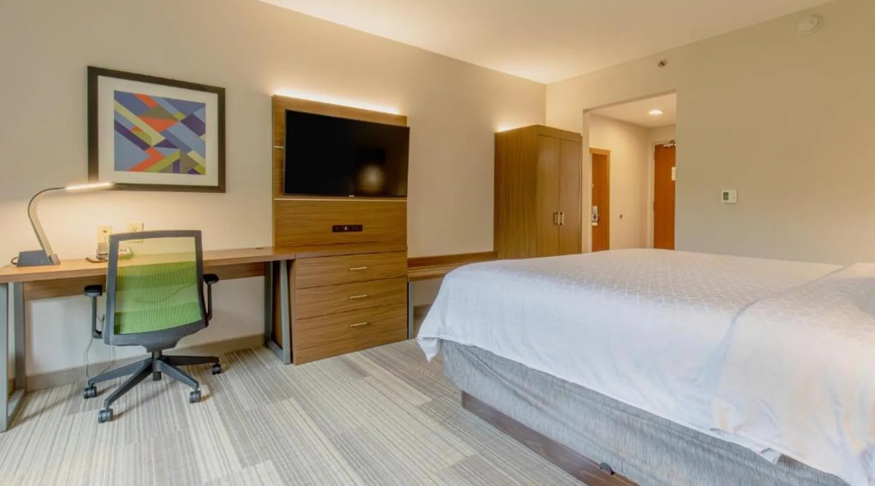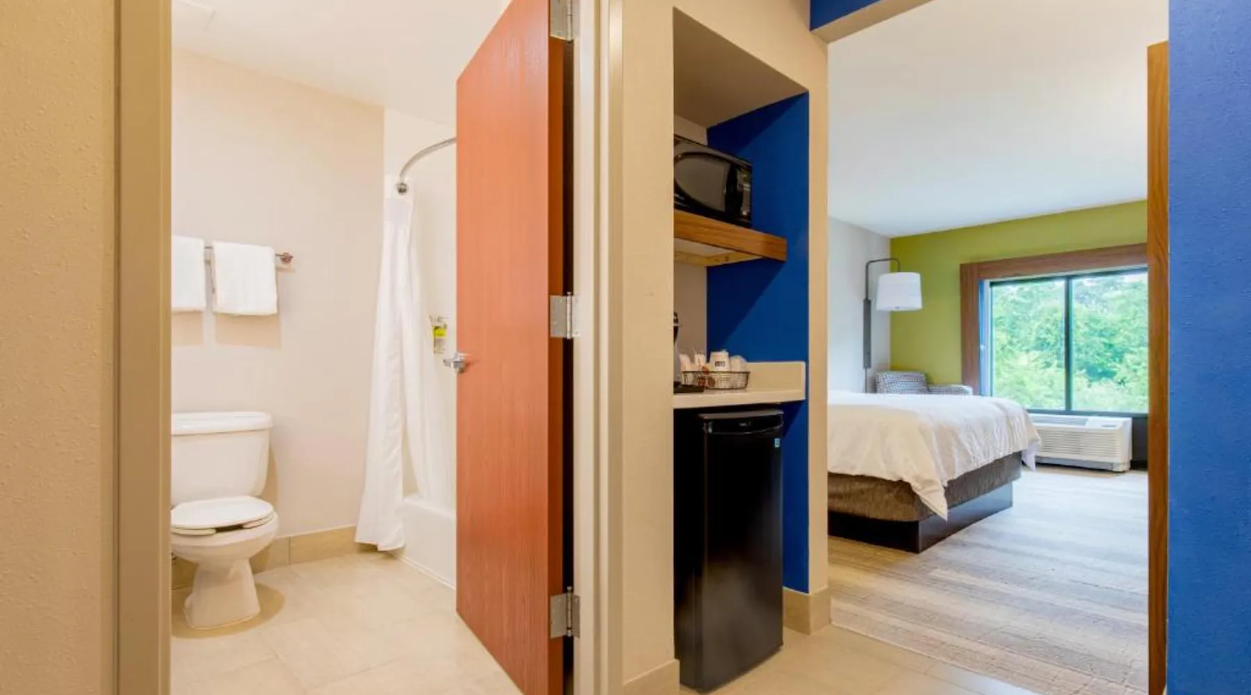 Comfortable Accommodations: Holiday Inn Express Johnson City by IHG in Johnson City offers clean rooms with air-conditioning, private bathrooms, and modern amenities including free WiFi, a work desk, and a seating area. Convenient Facilities: Guests enjoy a elevator, hot tub, and a 24-hour front desk. Additional amenities include a tea and coffee maker, hairdryer, refrigerator, microwave, and TV. Prime Location: Located 9.3 mi from Tri-Cities Regional Airport, the hotel is near attractions such as Hands On! Discovery Center (6.2 mi), Tweetsie Trail and George L. Carter Railroad Museum (7.5 mi), and Bristol Motor Speedway (17 mi). Guest Satisfaction: Highly rated for room cleanliness, breakfast provided by the property, and attentive staff and service support. The suite offers air conditioning, a tea and coffee maker, as well as a private bathroom boasting a bath and a hairdryer. This suite has a seating area, heating and a flat-screen TV with cable channels. The unit has 1 bed.
