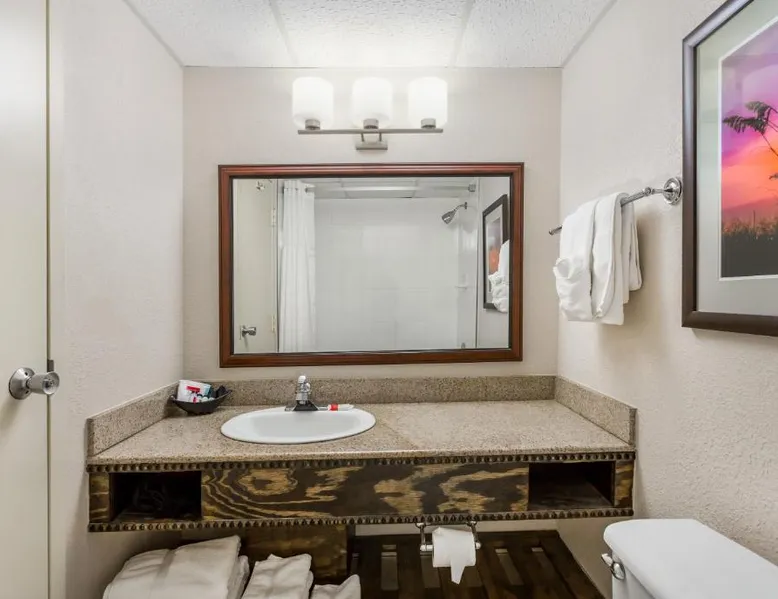 Ramada Plaza by Wyndham Nags Head Oceanfront is nestled on the shores of the Atlantic Ocean. Guest can take a refreshing plunge in the pool or unwind in the hot tub. Beach access and free WiFi are provided. The North Carolina Aquarium is 16 mi away. A cable TV, microwave, and small refrigerator are provided in every room at the Ramada Plaza by Wyndham Nags Head Oceanfront. Select rooms include a patio or private balcony with an ocean, beach dune, or street view. Guests can work up a sweat in the fitness center. Beach chairs and umbrellas are provided. A complimentary launderette is also available. Beachcombers Wood Fired Grille and Tiki Hut serve breakfast buffet, lunch and dinner. Wright Brothers Monument is 1.9 mi from the property. Guests will also be 12 mi from Roanoke Island Festival Park and 23 mi from Pea Island National Wildlife Refuge. Providing free toiletries, this triple room includes a private bathroom with a bath, a shower and a hairdryer. The air-conditioned triple room provides a flat-screen TV with cable channels, a tea and coffee maker, a wardrobe, a safe deposit box as well as garden views. The unit offers 1 bed.