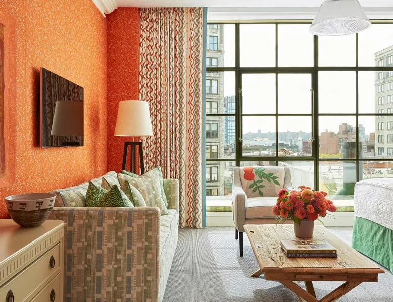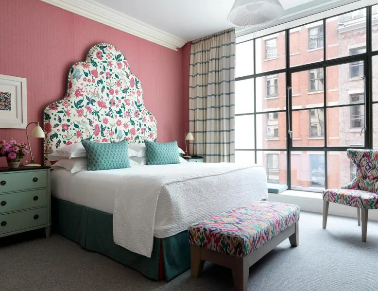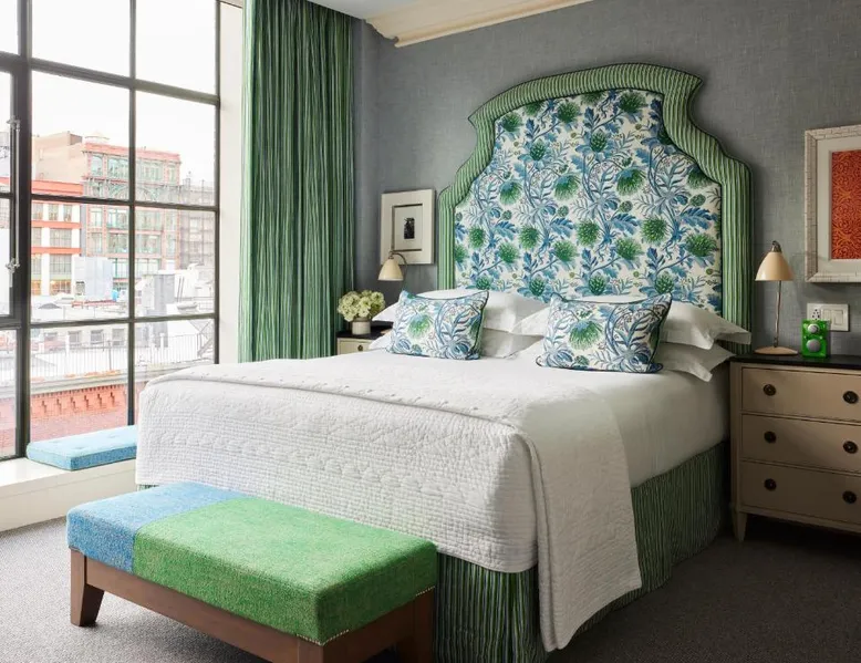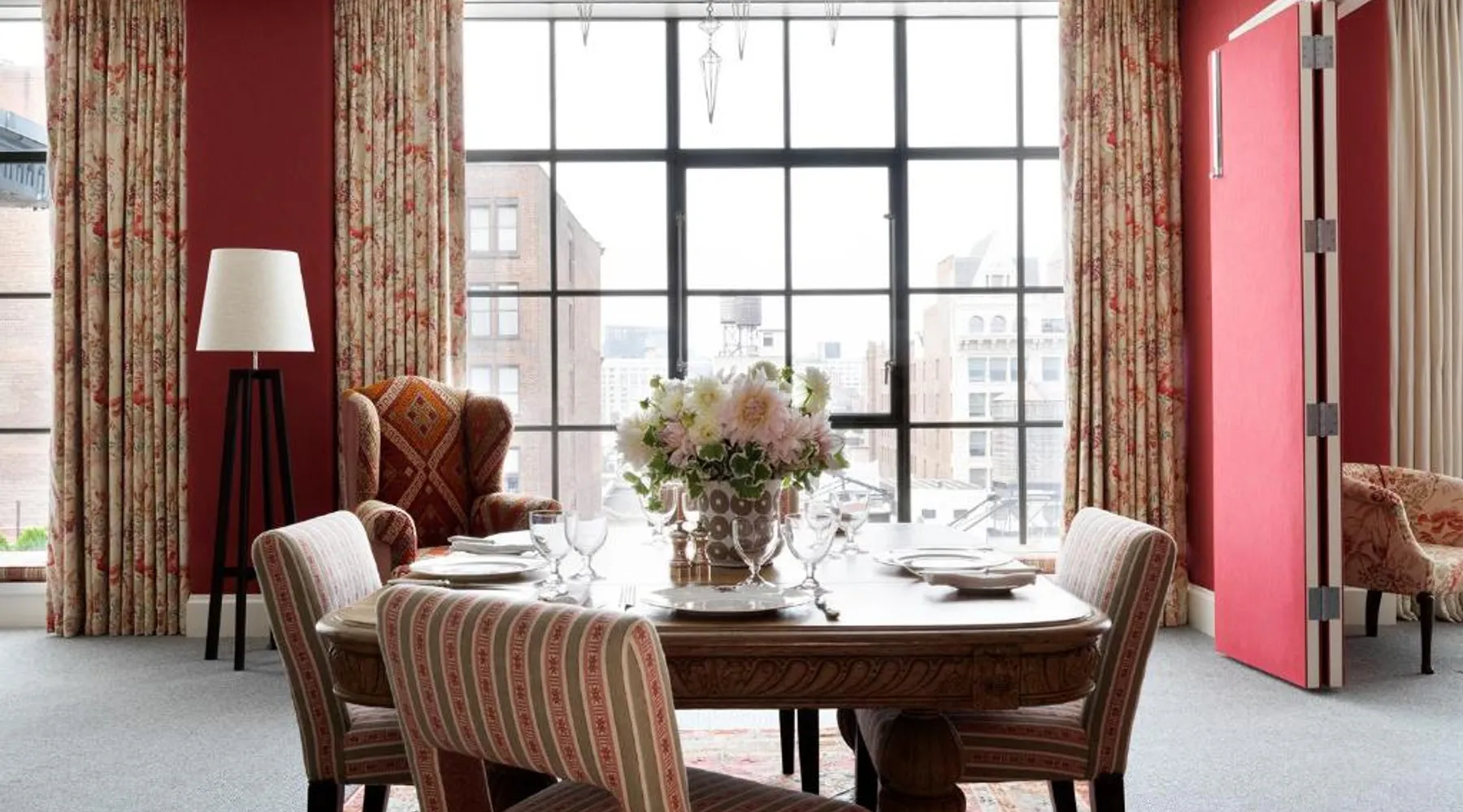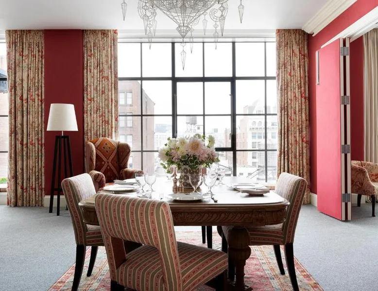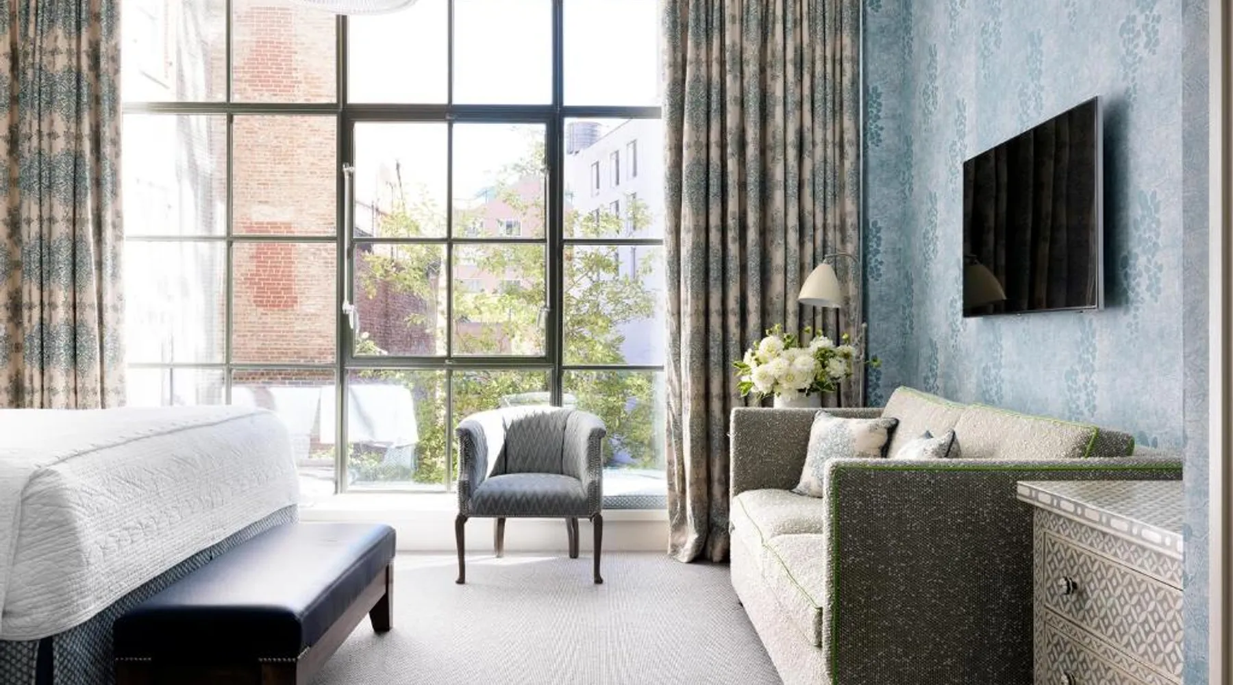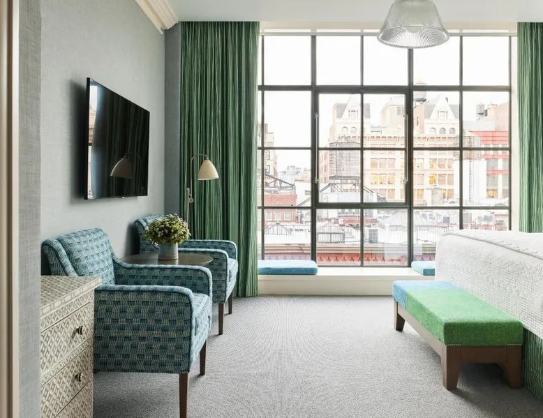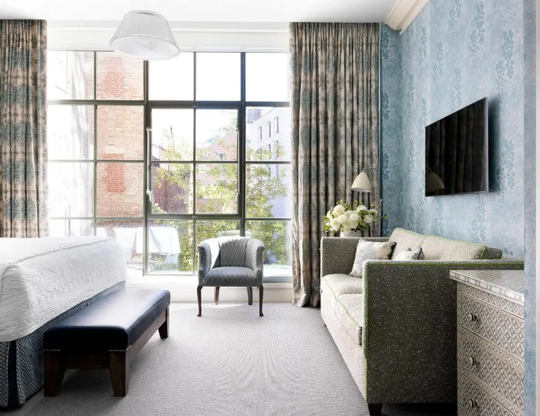 Located on a cobbled street in the SoHo neighborhood, this contemporary design hotel features a beautiful inner courtyard and an on-site terrace restaurant. Free Wi-Fi is available throughout the hotel. The Crosby Street Hotel offers bright, modern rooms with high ceilings and full-length windows. Each is equipped with flat-screen cable TV, DVD player and iPod docking station. Guests of Crosby Street are welcome to work out in the 24-hour gym or relax in front of the fireplace in the plush drawing room. Films are shown in the hotel’s private theater each Sunday. The Crosby Bar and Terrace serves gourmet items including breakfast and brunch. An afternoon tea with pastries and sandwiches is offered daily. The Crosby Street Hotel is adjacent to the Museum of Modern Art Design and 1 block from the Spring Street subway station. Located on the 3rd and 4th floors, this room features high ceilings with full-length windows.