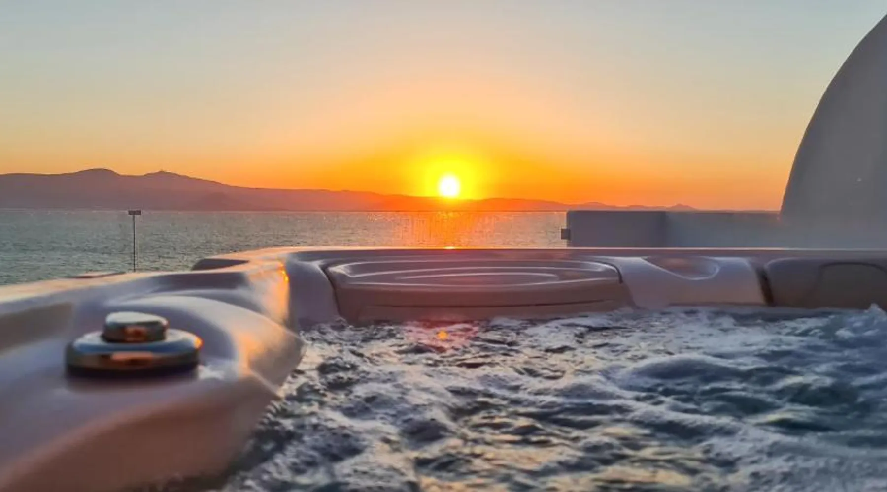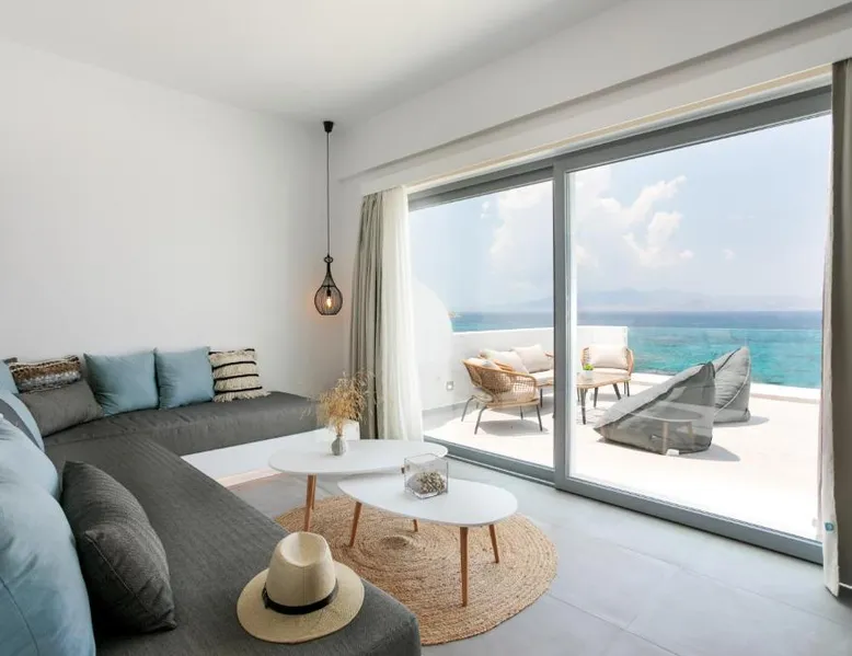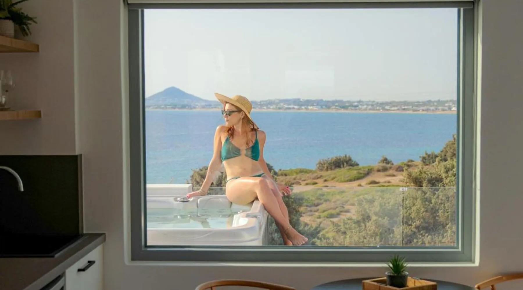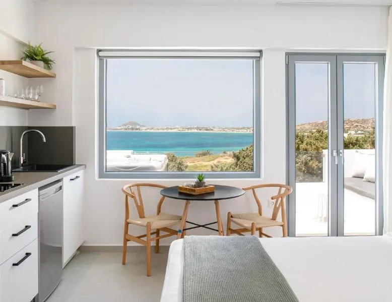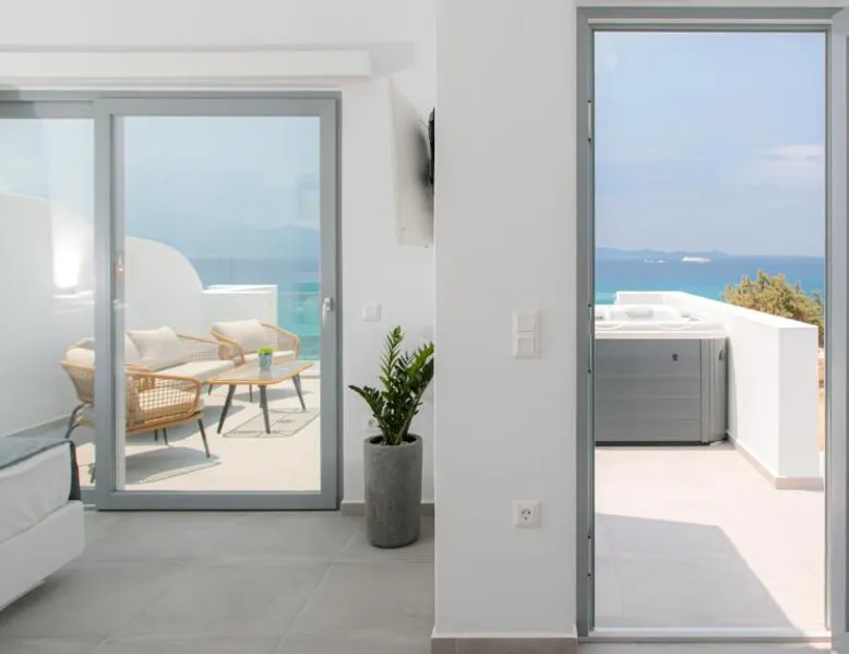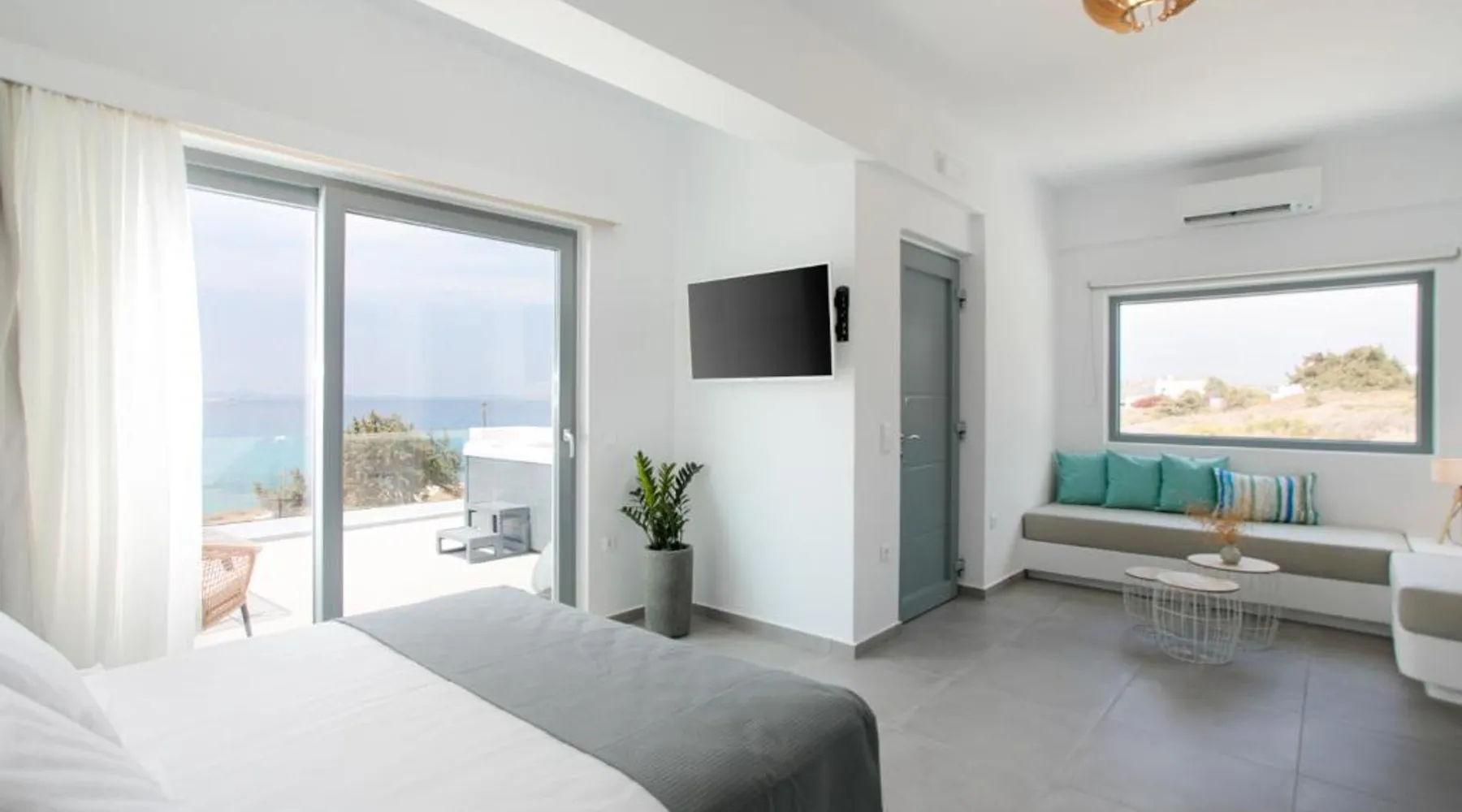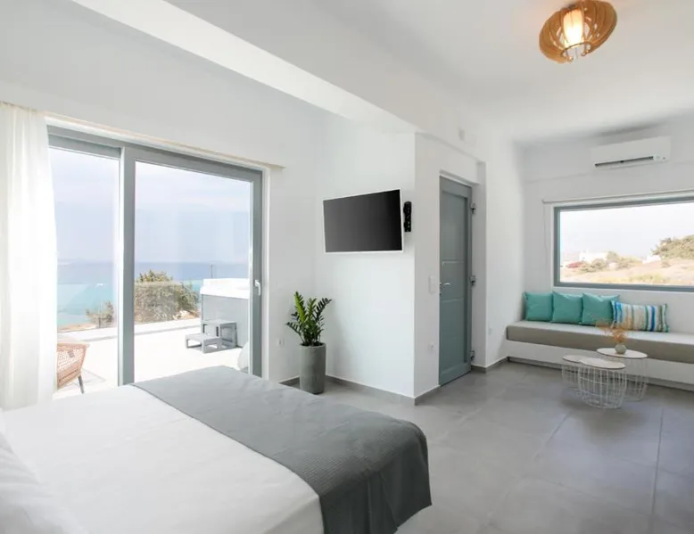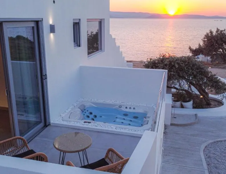 Beachfront Location: Seanfinity Beachfront Suites in Orkos offers direct beachfront access, a sun terrace, and a lush garden. Guests enjoy sea views and a serene setting with free WiFi. Comfortable Amenities: The apartment features air-conditioning, a terrace, balcony, and a fully equipped kitchen. Additional amenities include a hot tub, pool with a view, and free on-site parking. Nearby Attractions: Orkos Beach is just a few steps away, while Naxos Castle lies 6.8 mi from the property. Other attractions include Portara and the Archaeological Museum of Naxos, each 6.8 mi distant. Guest Satisfaction: Highly rated for its beachfront location, scenic views, and attentive host, Seanfinity Beachfront Suites ensures a memorable stay. This suite's special features are the hot tub and the spa bath. Featuring a private entrance, this air-conditioned suite consists of 1 living room, 1 separate bedroom and 1 bathroom with a walk-in shower and a bidet. The well-equipped kitchen features a stovetop, a refrigerator, kitchenware and a tea and coffee maker. Boasting a terrace with sea views, this suite also provides soundproof walls and a flat-screen TV with streaming services. The unit offers 2 beds.