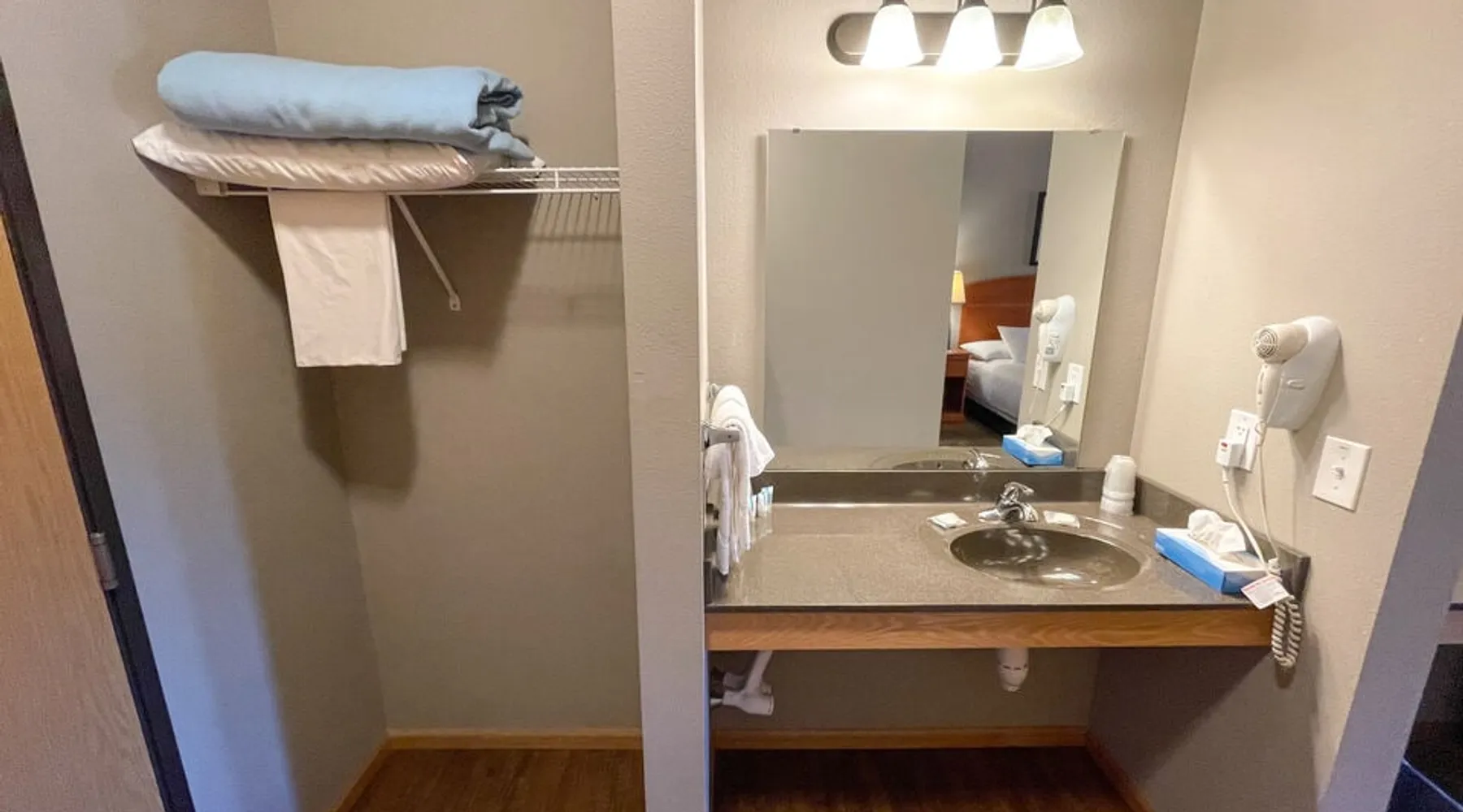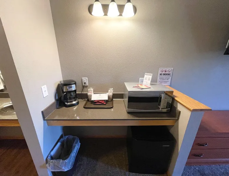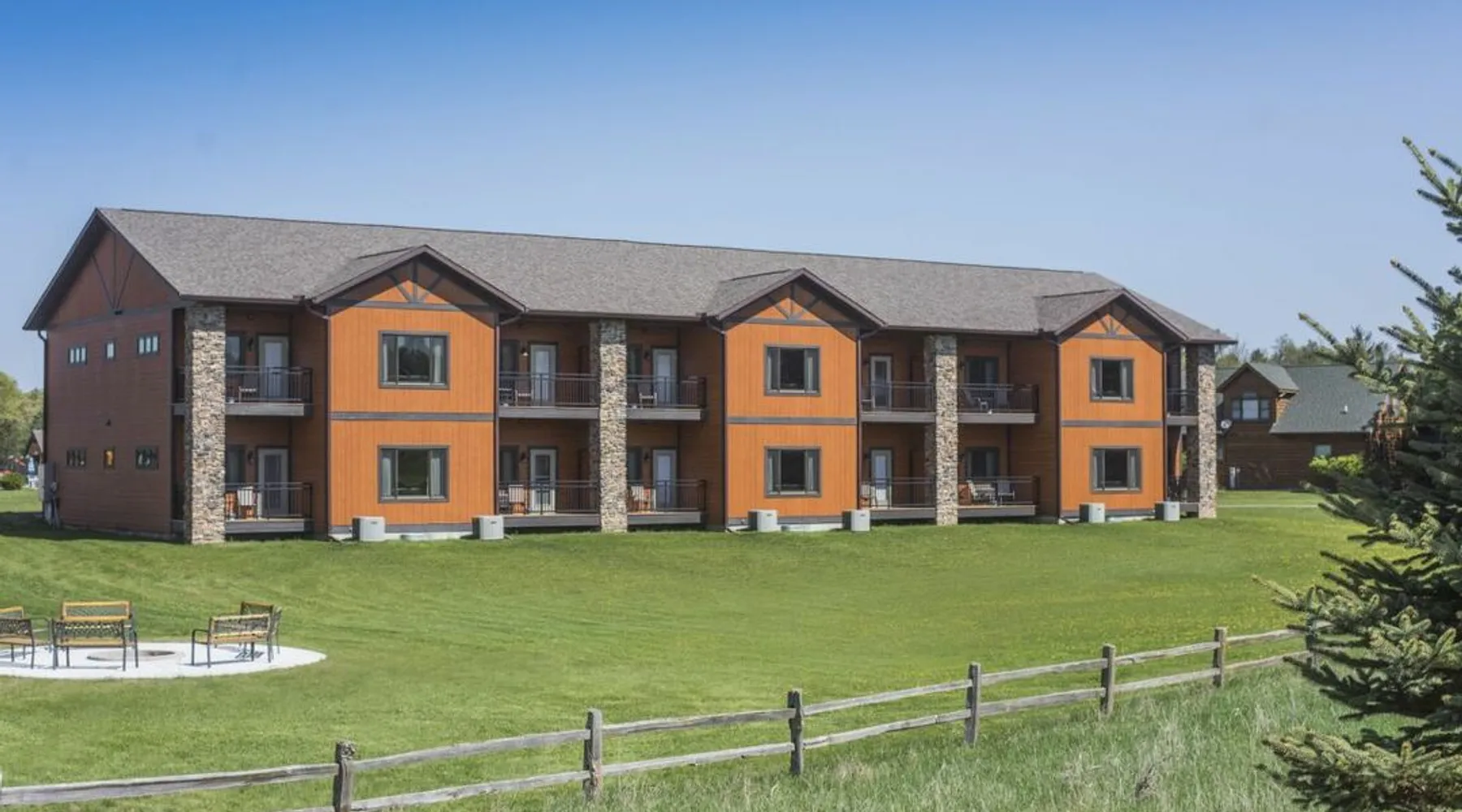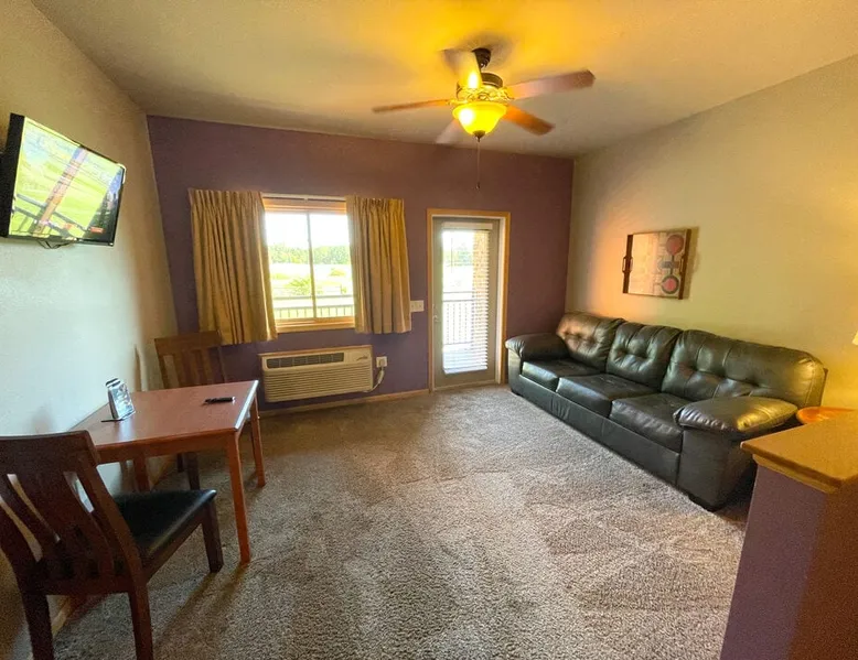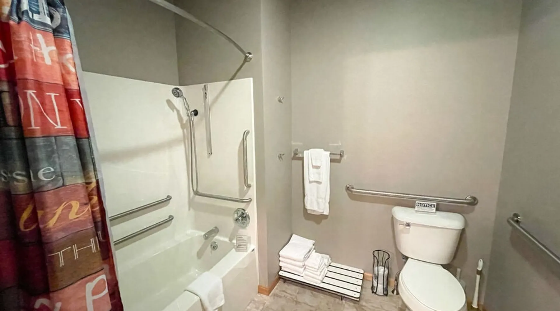 The King Hotel Room (ADA) is located just 10 minutes from Downtown Wisconsin Dells. The King Hotel Room is located in our Cedar Stone Condo building. Enjoy the view of Spring Brook’s golf course on the spacious balcony with provided outdoor seating. Enjoy the Clubhouse amenities such as the onsite Bar & Grill, Golf Course, Fitness Room, and Indoor and Outdoor Pools. The space This 500+ square foot Cedar Stone Room features a king-size bed and accommodates up to 4 (ADA/Handicap unit). Included are a leather sleeper sofa (queen size), table with seating for two and two 32" TVs. For added guest convenience, this unit offers a compact refrigerator, microwave and 4-cup coffee maker (complimentary coffee and tea provided). Additional amenities include a stocked bathroom, toiletries, hair dryer, iron and ironing board. The Cedar Stone Condos-Rooms are directly across the street from Spring Brook’s Clubhouse. This is a lower level unit. Living Area - Queen Sofa Sleeper - Large Flat Screen TV - Appliances: Mini Refrigerator, Microwave and 4-Cup Coffee Maker - Table with Seating Master Bedroom - King Bed - Large Flat Screen TV - Full Shower - Tub - Shower OUTSIDE: - Balcony Seating - In-Ground Fire Pit Shared Between the 2 Condo Buildings - 2 Gas Grills Shared Between the 2 Condo Buildings - Spacious Backyard Shared Between the 2 Condo Buildings Guest access Easy, fast, hassle free self check-in! Following a simple electronic signature, you will receive a Digital Guestbook containing important information regarding your stay. This property has key code access. After booking, guests will be given a personal code to access the property as well as facilities at the Clubhouse. The onsite Clubhouse is where you can find the Bar & Grill, ProShop, Fitness Room, and the Indoor and Outdoor Pools. Other things to note We are a Vacation Home Resort managing over 100 privately owned properties. We strive to deliver a comfortable and rewarding stay for all our guests. *Room sleeps maximum of 4, rates based on 4 people over the age of 3. Must be 18 years of age or older to make a reservation. When not in a family setting – everyone staying must be 18 years of age or older. CLUBHOUSE AMENITIES: Sports Bar & Grill - Burgers, Wraps, Wings, and More - Breakfast on Weekends - Serves Friday Fish Fry and Saturday Prime Rib - Hosts Events like Karaoke, DJ’s, and more! ProShop - 9-Hole Golf Course - Spring & Autumn Hours: 10am - Dusk - Summer Hours: 8am - Dusk Indoor Pool *Hours: Weekdays 7am - 10pm, Weekends 7am - 11pm - Kiddie Pool w/ Slides - Whirlpool - Poolside Basketball Hoop - Lounge Area - Showers, Lockers, and Bathrooms Outdoor Pool (Seasonal) *Hours: Weekdays 7am - 10pm, Weekends 7am - 11pm - Whirlpool - Kiddie Pool - Cabana Bar Fitness Room *Hours: Weekdays 7am - 10pm, Weekends 7am - 11pm - Cardio Machines (Treadmill, Bike, Cross Trainer) - Pro Series SE Fitness Machine - Dumbbell Rack - Adjustable Bench - Flat Screen TVs - Tanning Bed - Showers, Lockers, and Bathrooms Activity Rentals - Surrey Bike Rentals (4 and 6 Person) - Shuttle Cart Rentals *Due to business guidelines, our properties do not have cooking basics such as salt, pepper, olive oil, etc. We also do not supply toiletries such as shampoo, conditioner, bodywash, or laundry detergent.