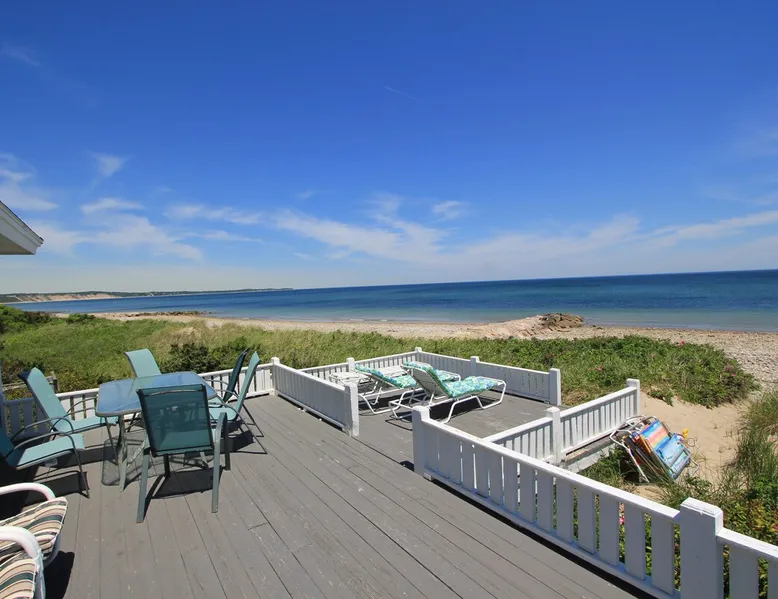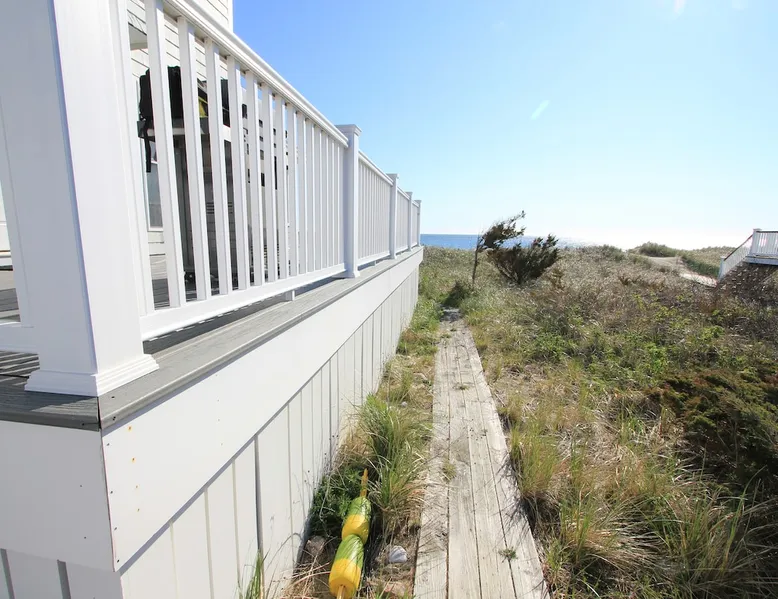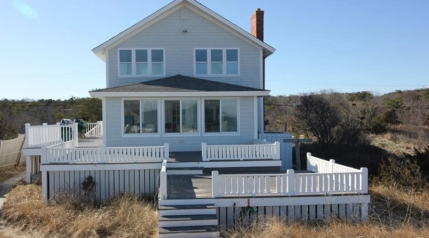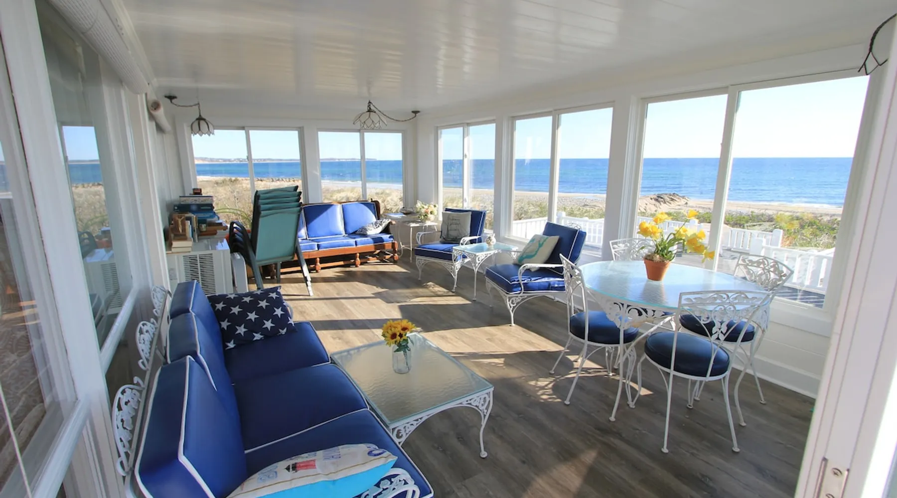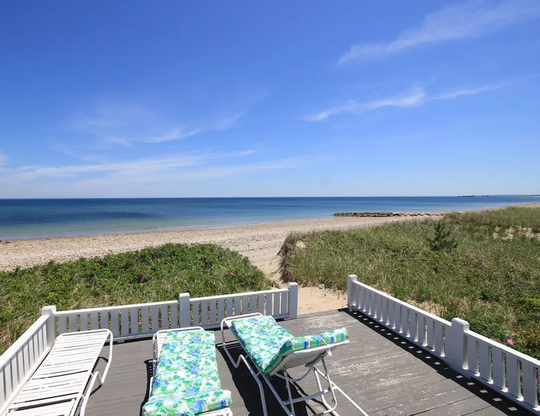 This spacious ocean view home is the perfect Cape Cod getaway for large families or groups of friends. With seven bedrooms, multiple living areas, and sweeping views of Cape Cod Bay from nearly every room, it’s a place made for relaxing, gathering, and making lasting memories. Enjoy morning coffee or evening cocktails on the wraparound deck as the ocean breeze drifts in — this Sagamore Beach retreat has everything you need for a comfortable and unforgettable stay. The space • Type: Large single-family home • Location: Sagamore Beach, with direct dune and ocean views • Approx. Size: Expansive layout with multiple living areas — ideal for large groups • Key Features: Wraparound deck with waterviews, fireplace, sunroom, Wi-Fi, laundry room, and fully equipped kitchen Bedrooms & Bathrooms • Bedroom 1: Queen bed (1st floor) • Bedroom 2: Two twin beds (1st floor) • Bedroom 3: Queen bed with private bath and ocean views (2nd floor, master) • Bedroom 4: Queen bed (2nd floor) • Bedroom 5: Queen bed (2nd floor) • Bedroom 6: Bunk room with 3 twins, one bunk bed, and one full bed (2nd floor) • Bedroom 7: Two twin beds (basement level) • Bathrooms: 3 full baths — one on the first floor and one on the second floor with shower and tub, and one in the master bedroom with shower Living Areas • Spacious living room with fireplace and ocean views • Cozy sunroom perfect for reading or morning coffee • Dining area adjacent to the kitchen for group meals • Additional lower-level space for bike and kayak storage Kitchen • Fully equipped kitchen with modern appliances including a drip and Keurig coffee maker plus second fridge in pantry area • Ample cabinet and counter space for cooking large meals • Dining table with seating for the group Outdoor Space • Wraparound deck with gas grill and stunning panoramic Cape Cod Bay views • Outdoor seating for dining and lounging • Enclosed outdoor shower Guest access entire house Other things to note • Parking: Parking for 4 cars in the driveway, additional parking across the street • Linens: Sheets and towels not provided — check out Dune Tootin Linen Rentals for pricing • Pets: Up to 2 dogs allowed ($100 fee for second dog) • A/C: A/C split unit (1 in first-floor living room, 4 on second floor — one in each bedroom); one window A/C unit available in second-floor closet if needed • Internet/TV: Wi-Fi and Smart TV with basic cable • Minimum Stay: 7-night minimum (Saturday–Saturday) • Check-in / Check-out: Check-in at 3 PM / Check-out at 10 AM; remote check-in with lockbox • Smoking: Not allowed • Other Notes: This large, comfortable home is perfect for multi-generational gatherings or family reunions, offering unmatched space and views of Cape Cod Bay.