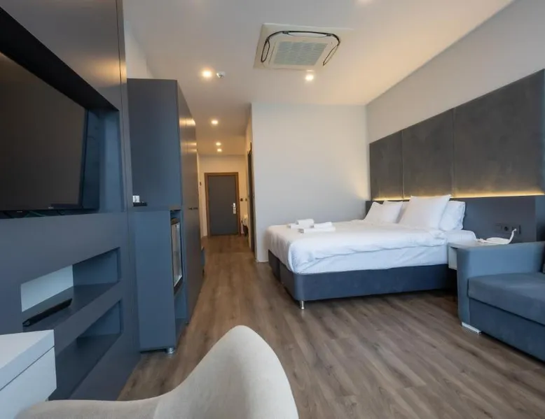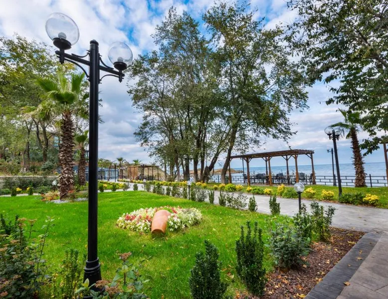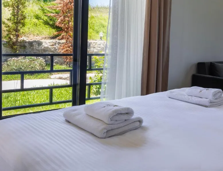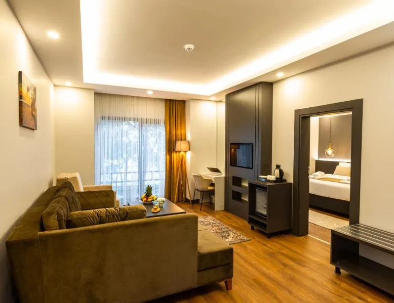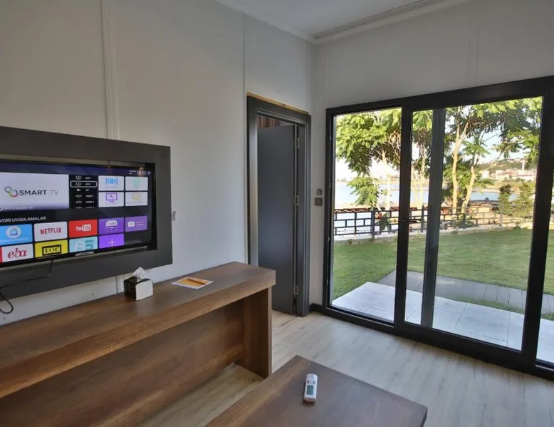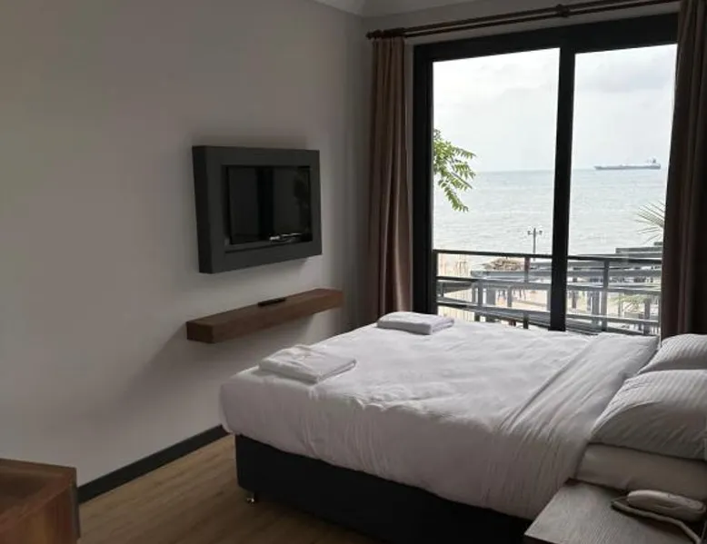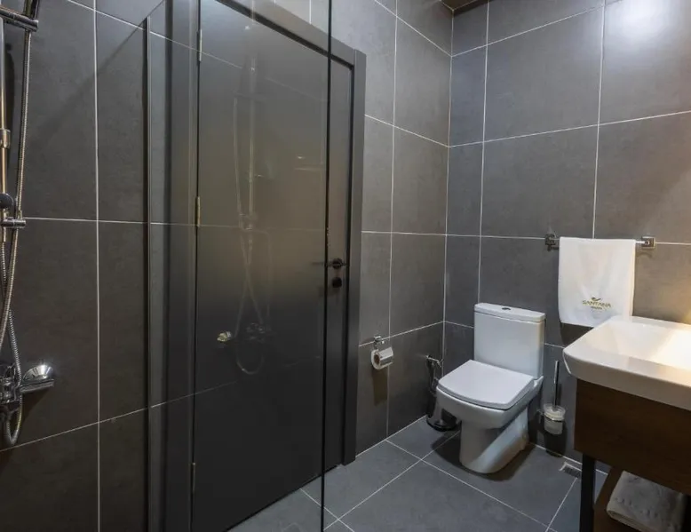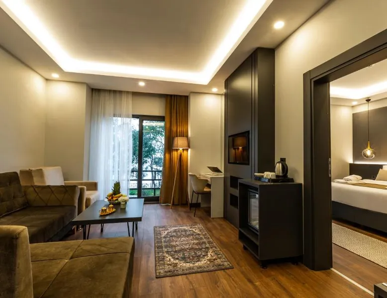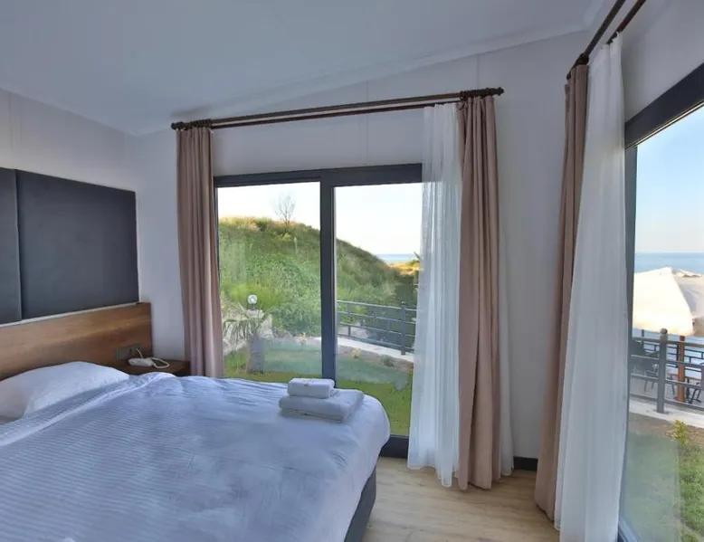 Elegant Accommodations: Santana Otel in Trabzon offers a 5-star experience with a sun terrace, lush garden, and a restaurant serving international cuisine. Guests enjoy free WiFi, a bar, and a variety of dining options. Comfortable Amenities: The hotel features private check-in and check-out, a lounge, hot tub, and a 24-hour front desk. Additional services include a paid shuttle, room service, and free on-site parking. Prime Location: Located 9.9 mi from Trabzon Airport, Santana Otel is near attractions such as Atatürk Pavilion (17 mi) and Trabzon Hagia Sophia Museum (17 mi). Guests appreciate the beach access, scenic views, and attentive staff. Boasting a private entrance, this air-conditioned bungalow comes with 1 living room, 1 separate bedroom and 1 bathroom with a walk-in shower and a hairdryer. The bungalow features a flat-screen TV with streaming services, soundproof walls, a mini-bar, a tea and coffee maker as well as sea views. The unit has 3 beds.