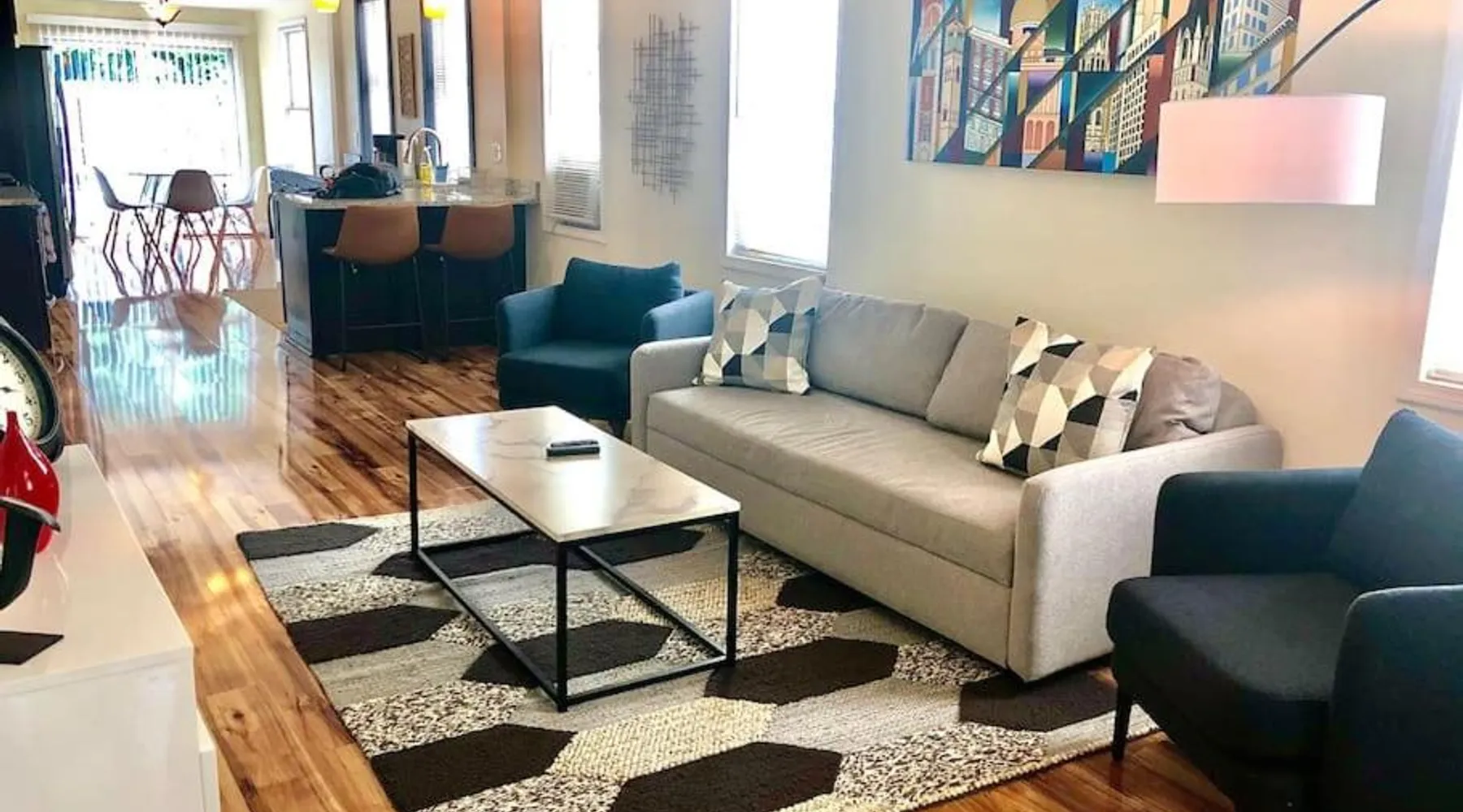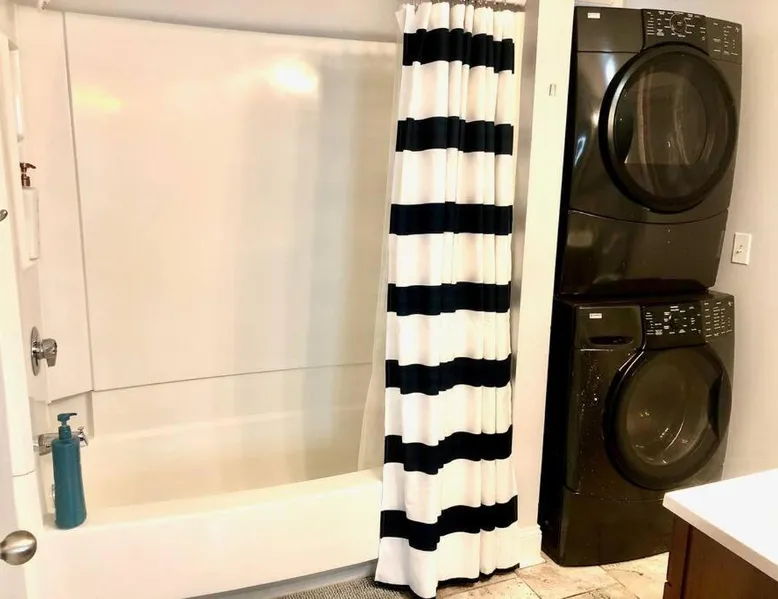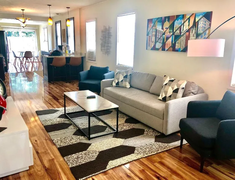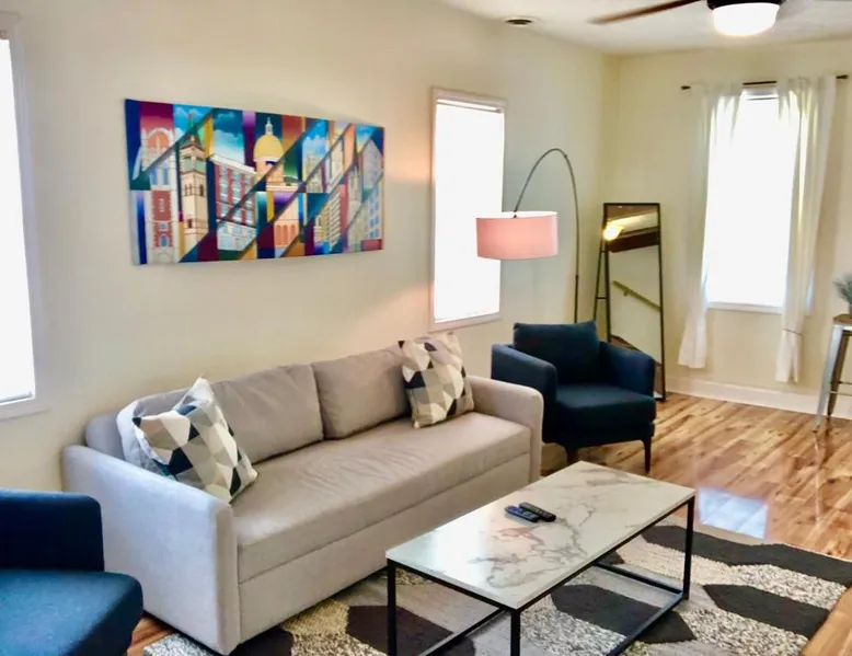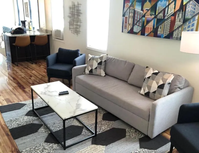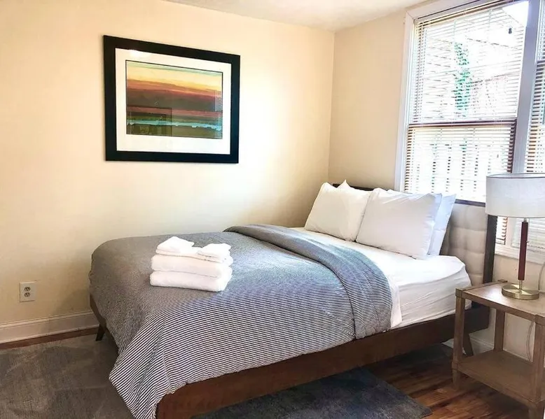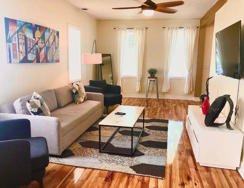 Comfortable Living: The House Hotels - W20TH in Cleveland offers a three-bedroom holiday home with a living room. Guests enjoy free WiFi and complimentary parking. Modern Amenities: The property features air-conditioning, a kitchenette, washing machine, kitchen, bath, TV, and kitchenware. Convenient Location: Located 3.1 mi from Cleveland Burke Lakefront Airport and 1.2 mi from Rocket Mortgage FieldHouse. Nearby attractions include Progressive Field and the Rock and Roll Hall of Fame. Local Activities: Boating is available in the surrounding area. This air-conditioned apartment is consisted of of 1 living room, 3 separate bedrooms and 1 bathroom with a bath. The apartment's kitchen, which features kitchenware, is available for cooking and storing food. The apartment offers a flat-screen TV, a washing machine, tumble dryer and heating. The unit offers 5 beds.