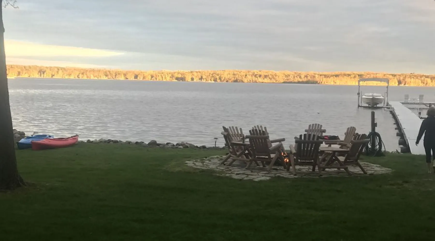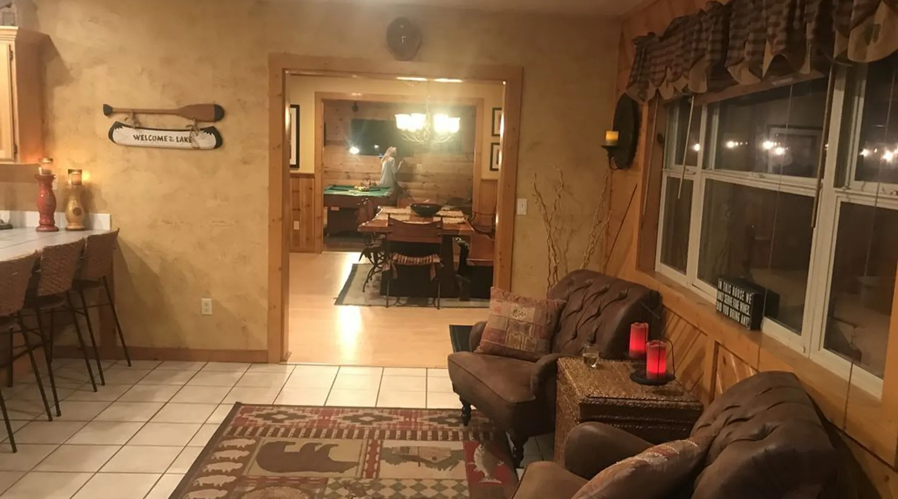 Come enjoy 2500 acers lake in beautiful Marinette County and our 4400 sq ft brick home (with log interior) situated on 2 wooded, flat acres (no steps) with 204 feet of pure sandy bottom lake frontage with incredible views, sunsets, and stars. The home is two stories (wheelchair accessible) 8 bedrooms and a loft, 3 bath and 2 -half baths with a dramatic 2 story, log family room, 2 fireplaces (family and master bedroom), a hot tub, recreation room (pool table, ping pong, foosball table games, TV), Game room breakfast bar, kitchen appliances, and sleeps 18 comfortably so you can bring the whole gang! pet friendly but there is a charge of $200 per pet. (2 dogs minimum) Dog are not allowed upstairs. There is something to do no matter what the season and no matter what the weather. In the summer go swimming, Kayaking, Paddle boarding, Fishing, playing on our foam swimming mat, boating, golf and enjoy the lake. In all seasons drive just 30 minutes away and hike along picturesque waterfall trails. Watch the seasons change in fall when the trees change colors and light up the sky. In the winter ice skate, play ice hockey, hit the snowmobiling trails that you can enter not far from the house. No matter what it's a great place to stay.