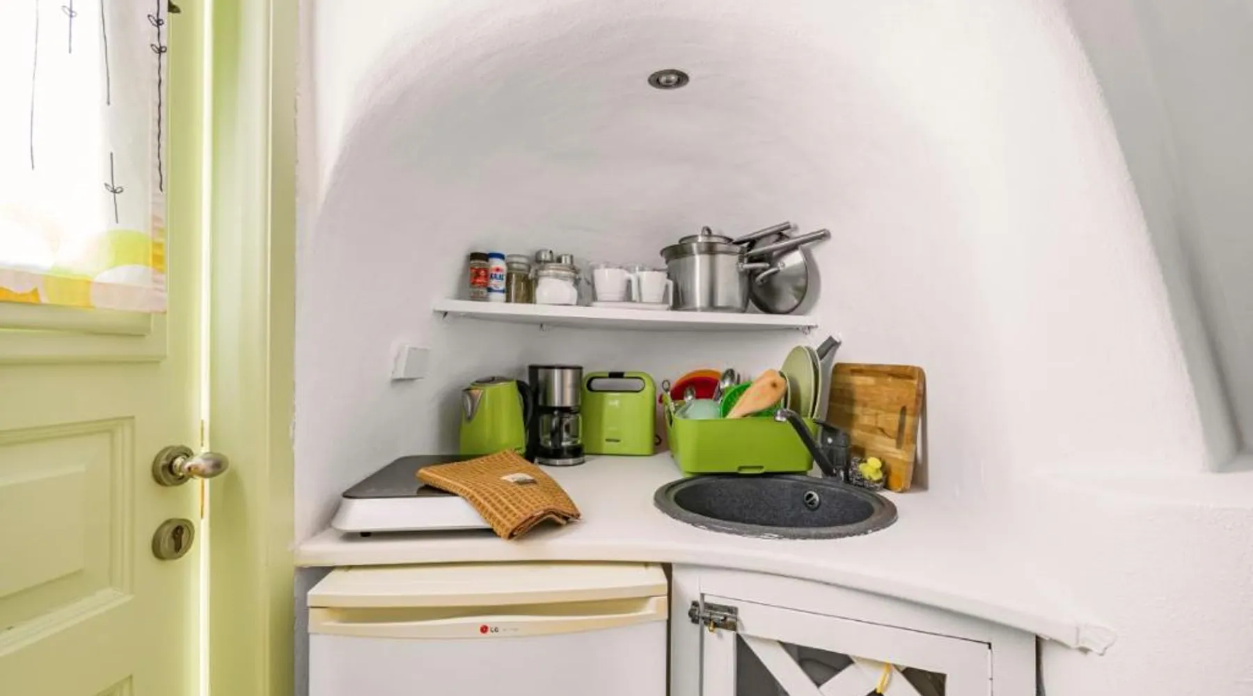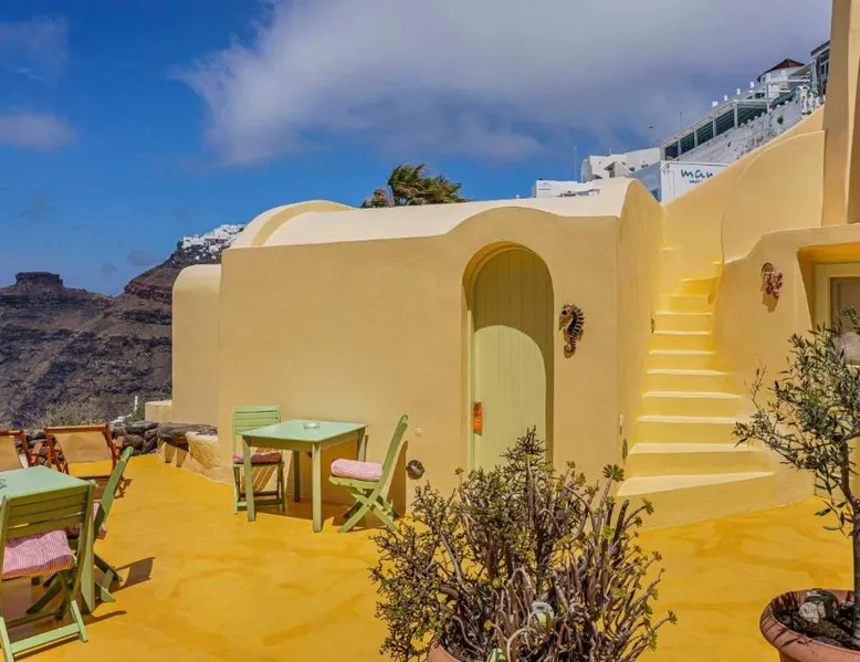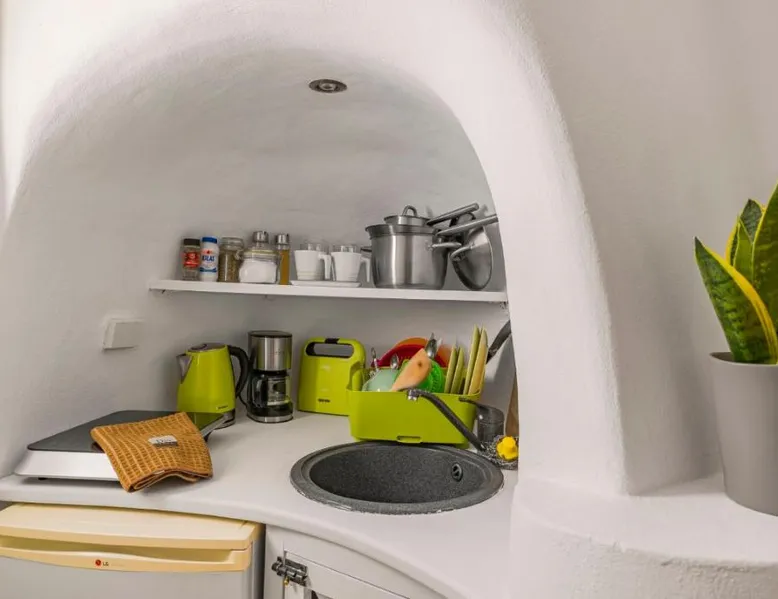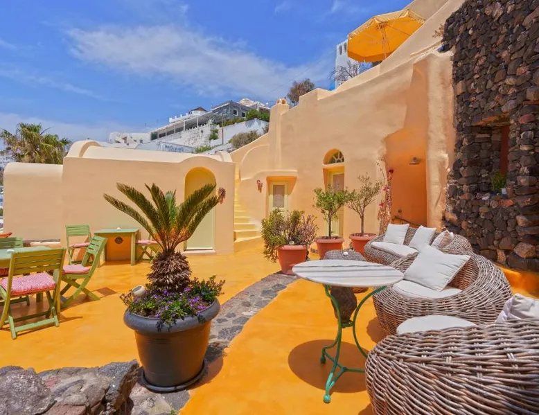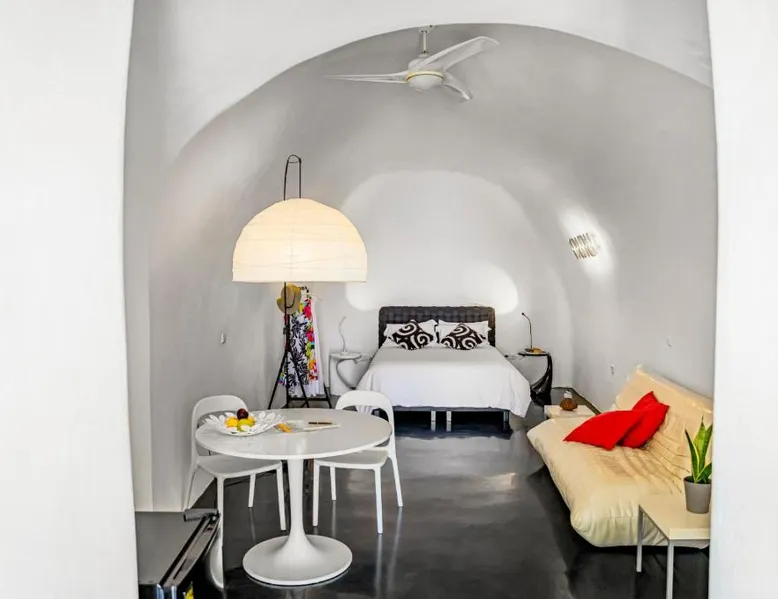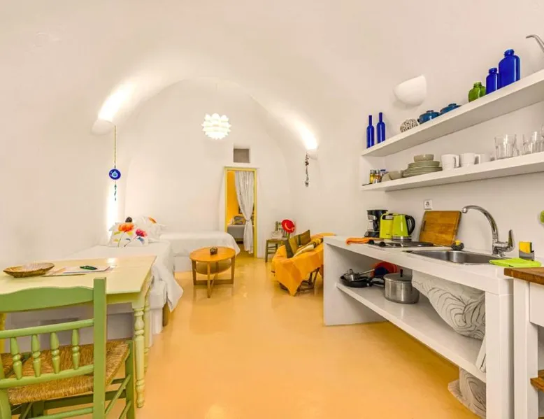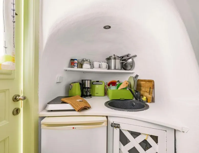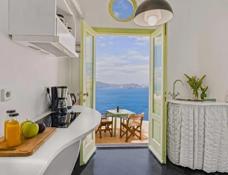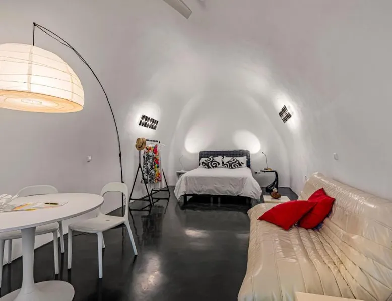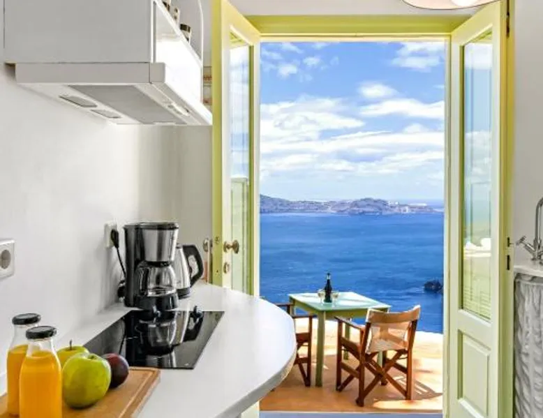 Historic Setting: Sensyo Caves in Firostefani offers a unique apartment housed in a historic building. Guests enjoy sea views and a private terrace, complemented by free WiFi. Comfortable Amenities: The apartment features air-conditioning, a kitchenette, and a private bathroom. Additional amenities include a balcony, patio, and outdoor seating area. Convenient Services: Private check-in and check-out, a paid shuttle service, concierge, and daily housekeeping ensure a comfortable stay. Bike hire and luggage storage are also available. Local Attractions: Located 4.3 mi from Santorini International Airport, the property is near the Archaeological Museum of Thera (8-minute walk) and Megaro Gyzi (1969 feet). Boating and scuba diving are popular activities in the surroundings. Offering direct views over the caldera from its shared terrace, this studio has a toaster and soundproofing. Has sofa, and kitchenette .