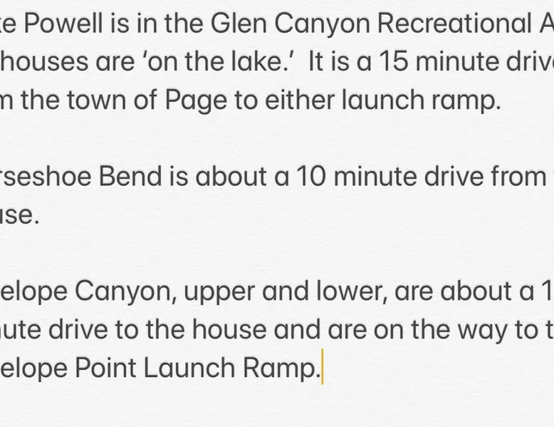 🏜️Horseshoe Bend House Fresh, fun, and exceptionally clean, newly renovated home in a beautiful location; near Horseshoe Bend (7 minutes,) Antelope Canyon (12 minutes,) and Lake Powell (15-20 minutes.) Boat parking Fully appointed kitchen, laundry, and room to park your boat Free Pickleball courts in town #AntelopeCanyonHouse The space #AntelopeCanyonHouse 🚤-Boat/Jet ski extra parking off street 🛀🏽 Master bath with full tub/shower and second bath with walk-in shower. 👩🏽🍳 Kitchen with quartz countertops and fully outfitted with electric cook top, stainless steel fridge, full size oven & microwave, dishwasher, double-basin sink with garbage disposal, stainless steel pans, mixer, toaster, drip coffee maker, standard dishes, utensils and flatware, plus serving bowls & platters provided. You'll find common spices available for cooking use. 🥩Stainless Steel BBQ 🫧 Full size Whirlpool washer / dryer in house. 📺 WIFI & Smart TV with Roku ❄️ AIR CONDITIONED home for your comfort. 🎣 FISHERMAN'S paradise, check out Wayne's Words Forum for ideas and detail Guest access This is an entire house to yourself, not shared, no meals provided. Fully equipped kitchen to use Pack n Play available, on request, but we are not childproofed Absolutely no smoking of any substance, no vaping or e-cigarettes, inside the house. If you smoke outside, pick up your butts. We provide access to Wi-FI with a 1GB modem, but please be aware, Page is a small town in a remote area, the internet sometimes goes up & down for no apparent reason. We provide smart TVs with some streaming, etc Sign rental agreement at booking with ID upload for security Other things to note No parties, no extra guests beyond the original agreed number without permission. Sign rental agreement at booking with ID upload for security A security Deposit Hold of $300 is required