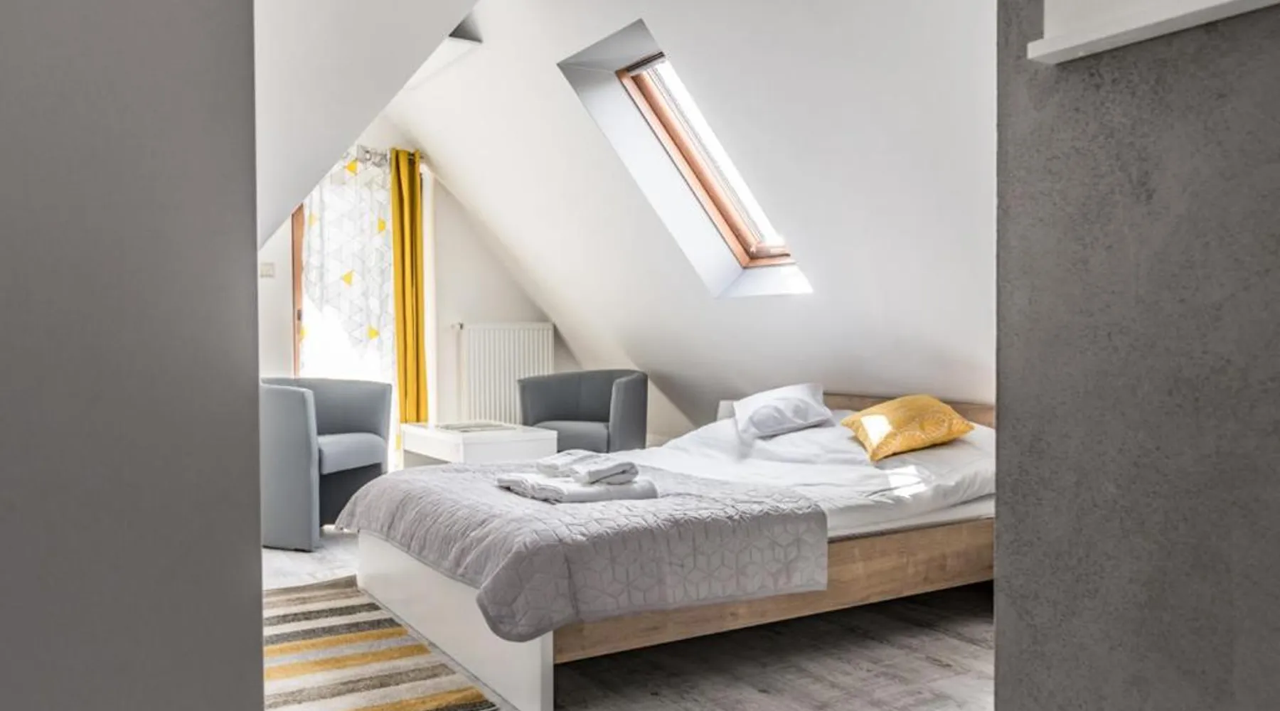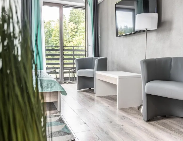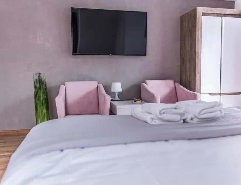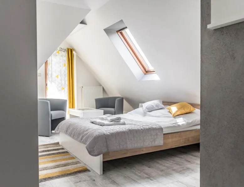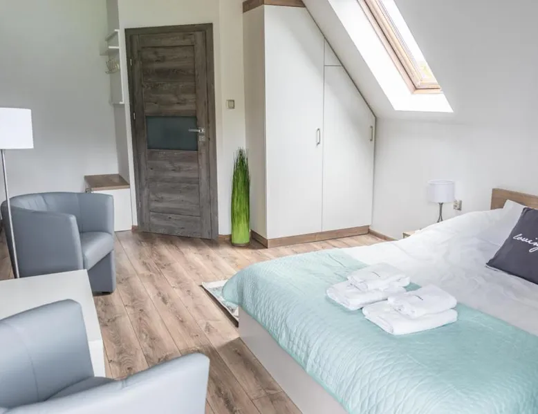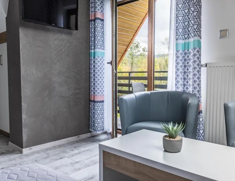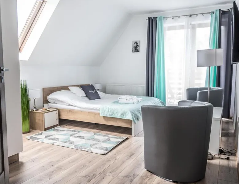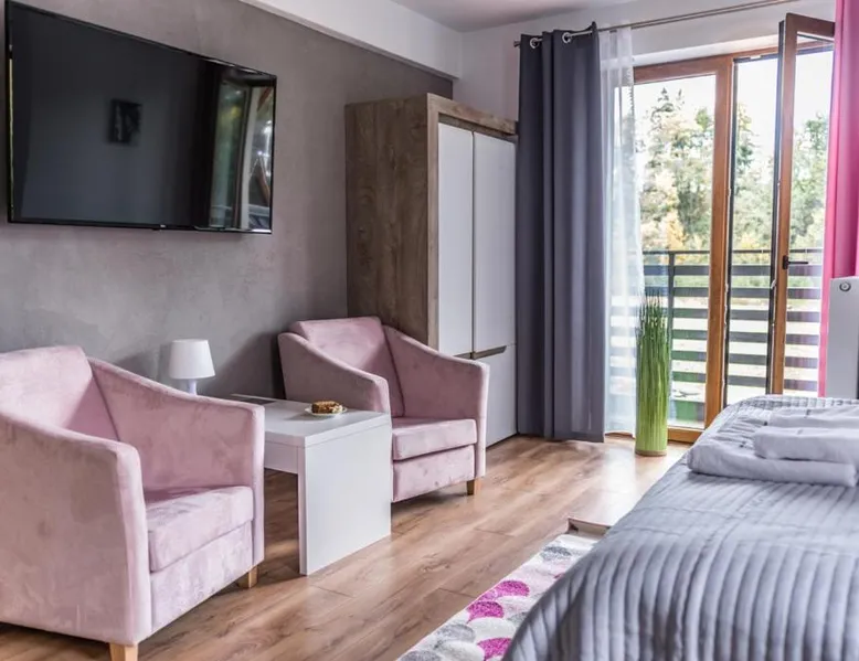 Comfortable Accommodations: MIŁOSZÓWKA in Witów offers a homestay experience with a garden and free WiFi. Guests enjoy a shared kitchen, balcony, and private bathroom equipped with a shower and hairdryer. Modern Amenities: The property features a TV, wardrobe, and electric kettle. Free on-site private parking is available, ensuring convenience for all visitors. Local Attractions: Gubalowka Mountain lies 8.7 mi away, Railway Station Zakopane 9.3 mi, Zakopane Aqua Park 9.9 mi, Tatra National Park 11 mi, Kasprowy Wierch Mountain 18 mi, and Bania Thermal Baths 23 mi from the homestay. Guest Satisfaction: Highly rated by guests for its cleanliness, well-equipped kitchen, and quiet area. The triple room offers a wardrobe, an electric kettle, as well as a private bathroom featuring a shower and a hairdryer. This triple room features heating, a flat-screen TV and a balcony. The unit offers 2 beds.