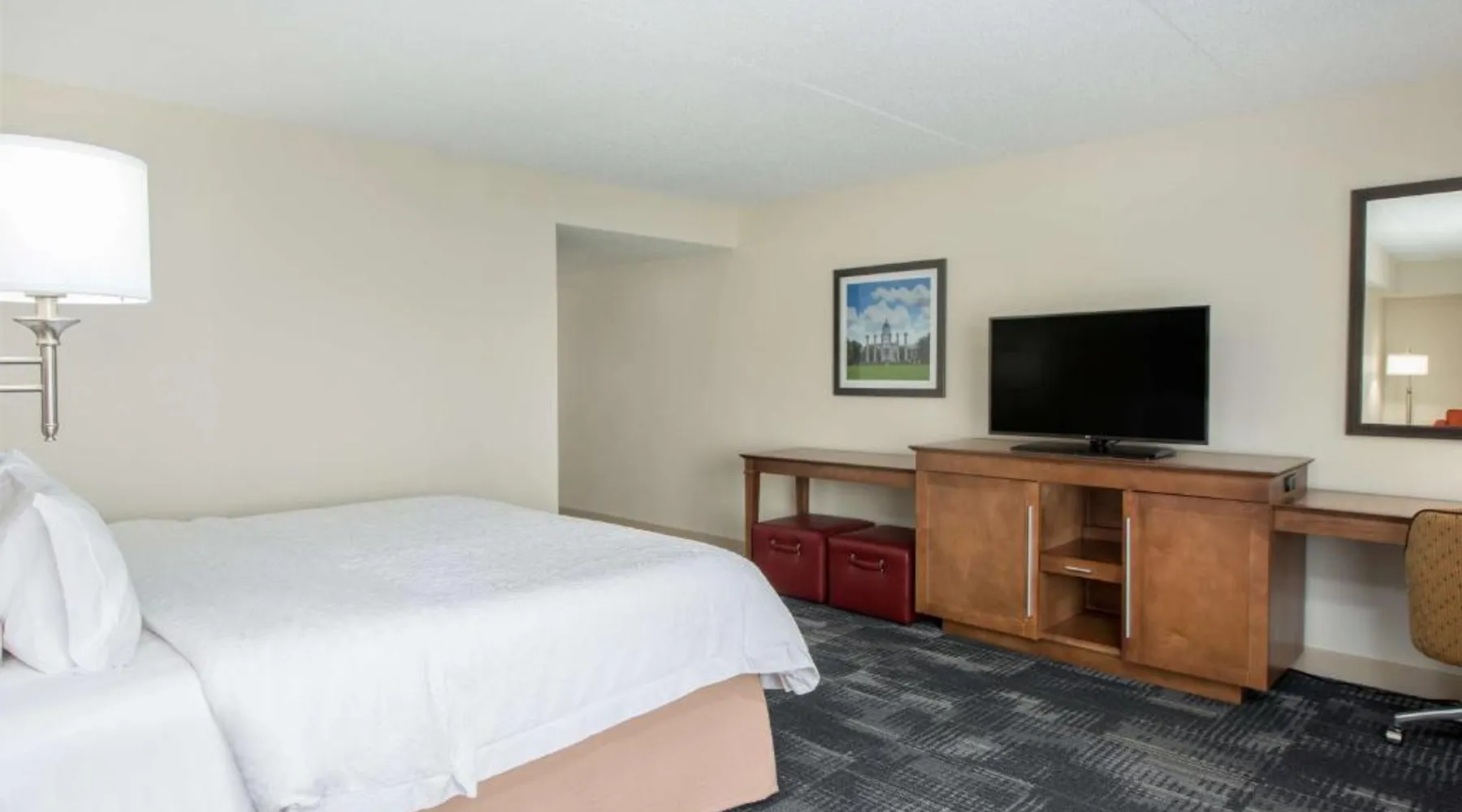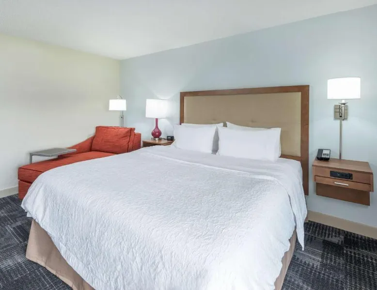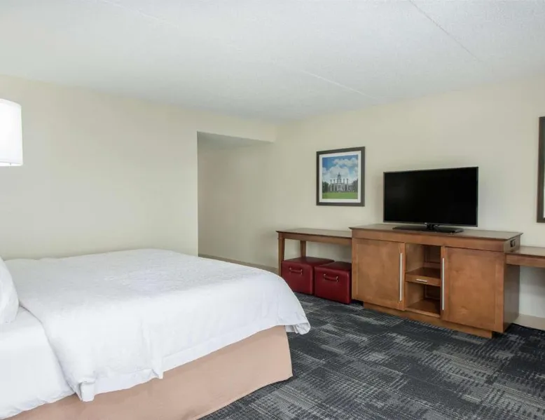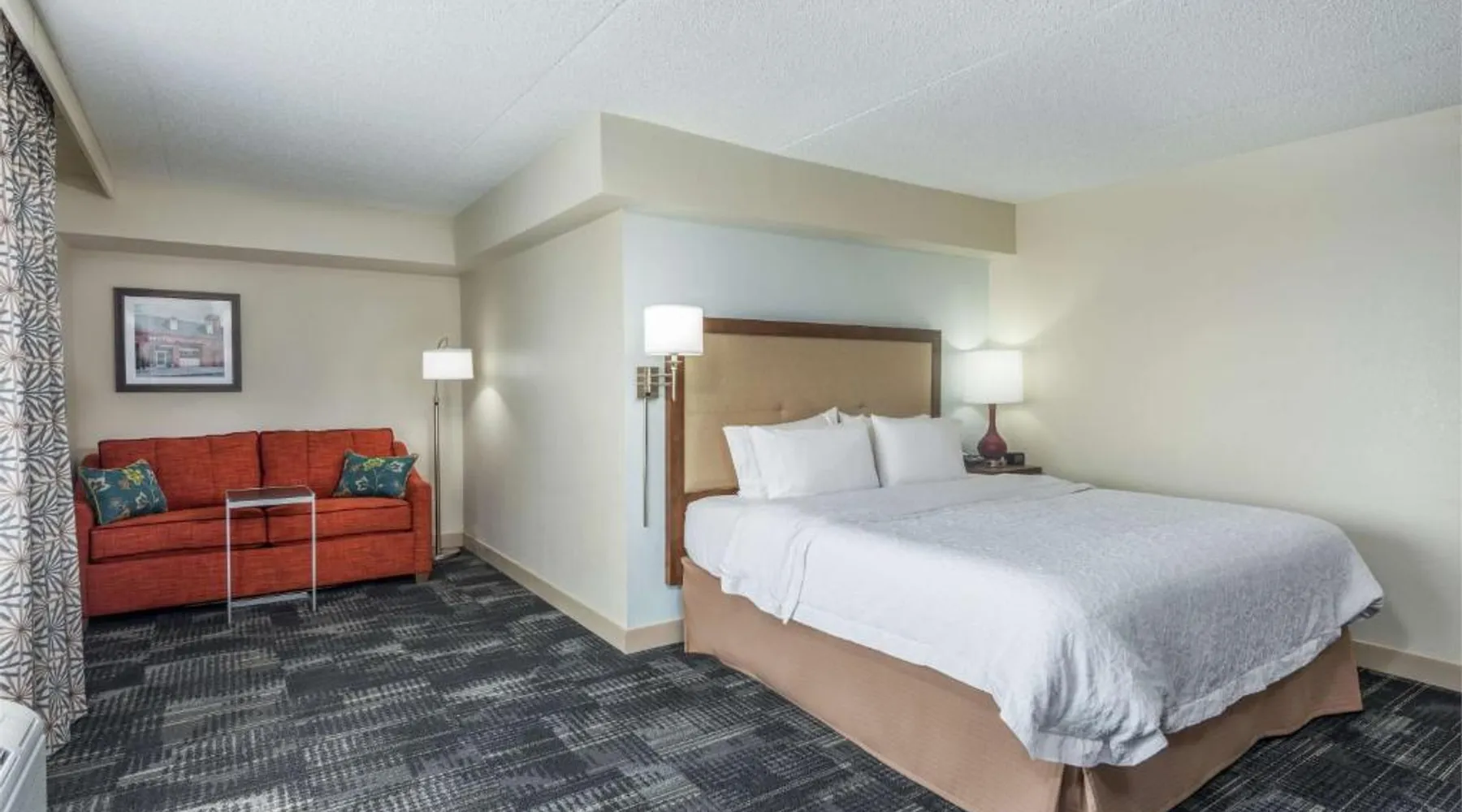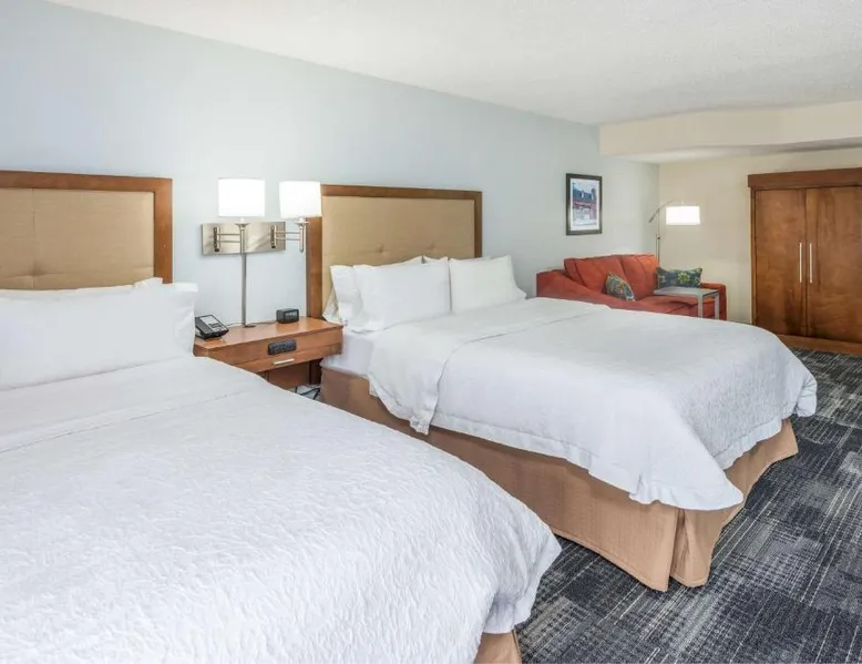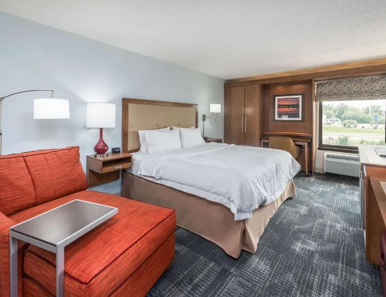 Comfortable Accommodations: Hampton Inn Columbia in Columbia offers 5-star rooms with free WiFi, air-conditioning, and modern amenities. Guests enjoy refrigerators, tea and coffee makers, and flat-screen TVs. Exceptional Facilities: The hotel features a fitness center, sun terrace, and indoor swimming pool. Additional facilities include a hot tub, business area, and laundry service. Delicious Breakfast: A complimentary American buffet breakfast is served daily, highly praised by guests for its quality and variety. Convenient Location: Located 12 mi from Columbia Regional Airport, the hotel is near attractions such as Stephens Lake Park (2.4 mi) and Faurot Field (5 mi). Guests appreciate the room cleanliness and attentive staff. This guestroom includes a sofa bed, free WiFi, and a flat-screen TV. A desk and ergonomic chair are provided.