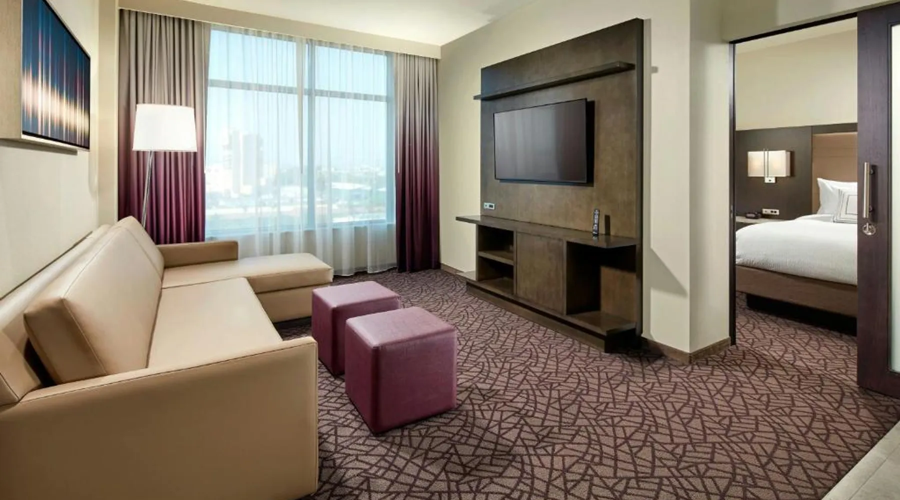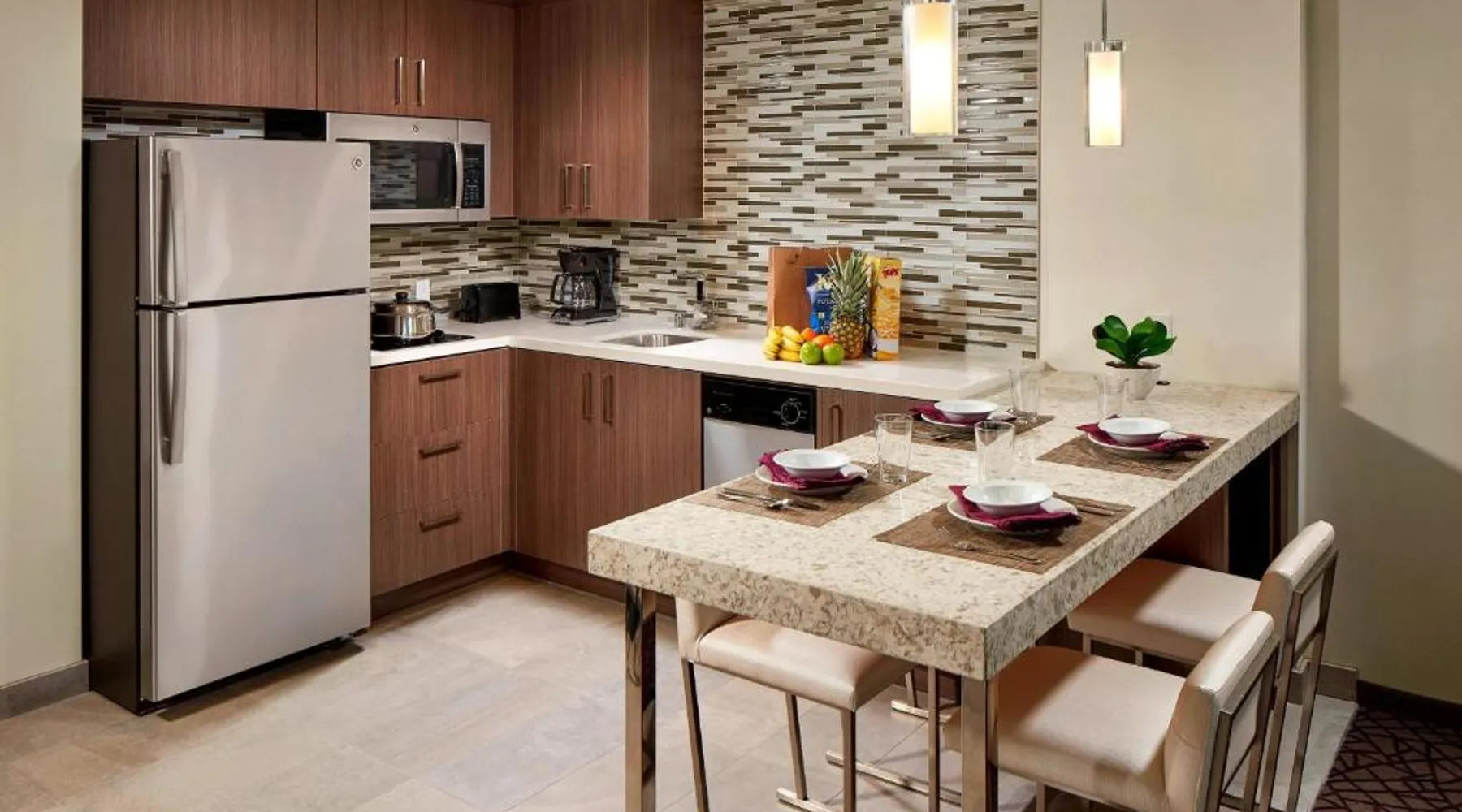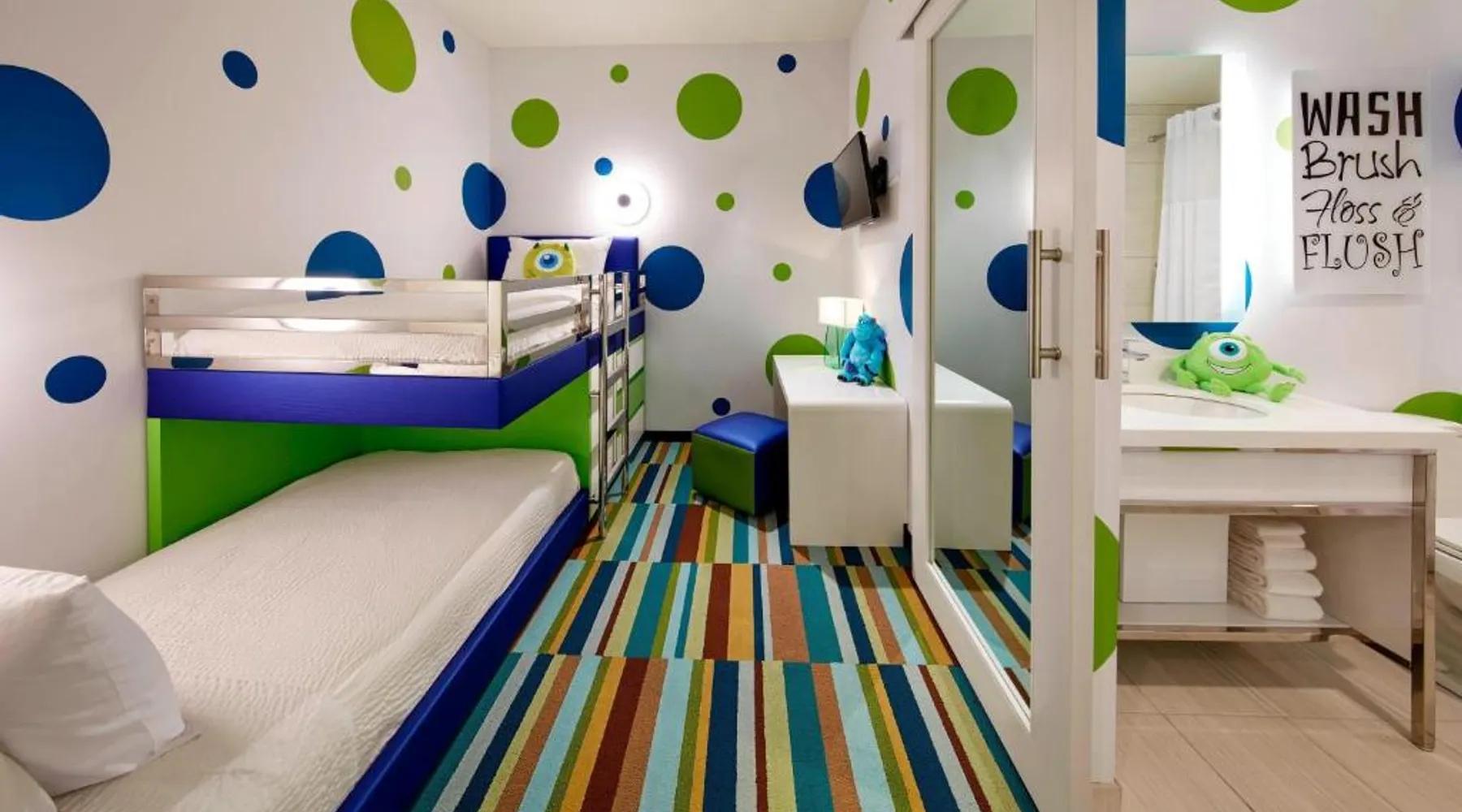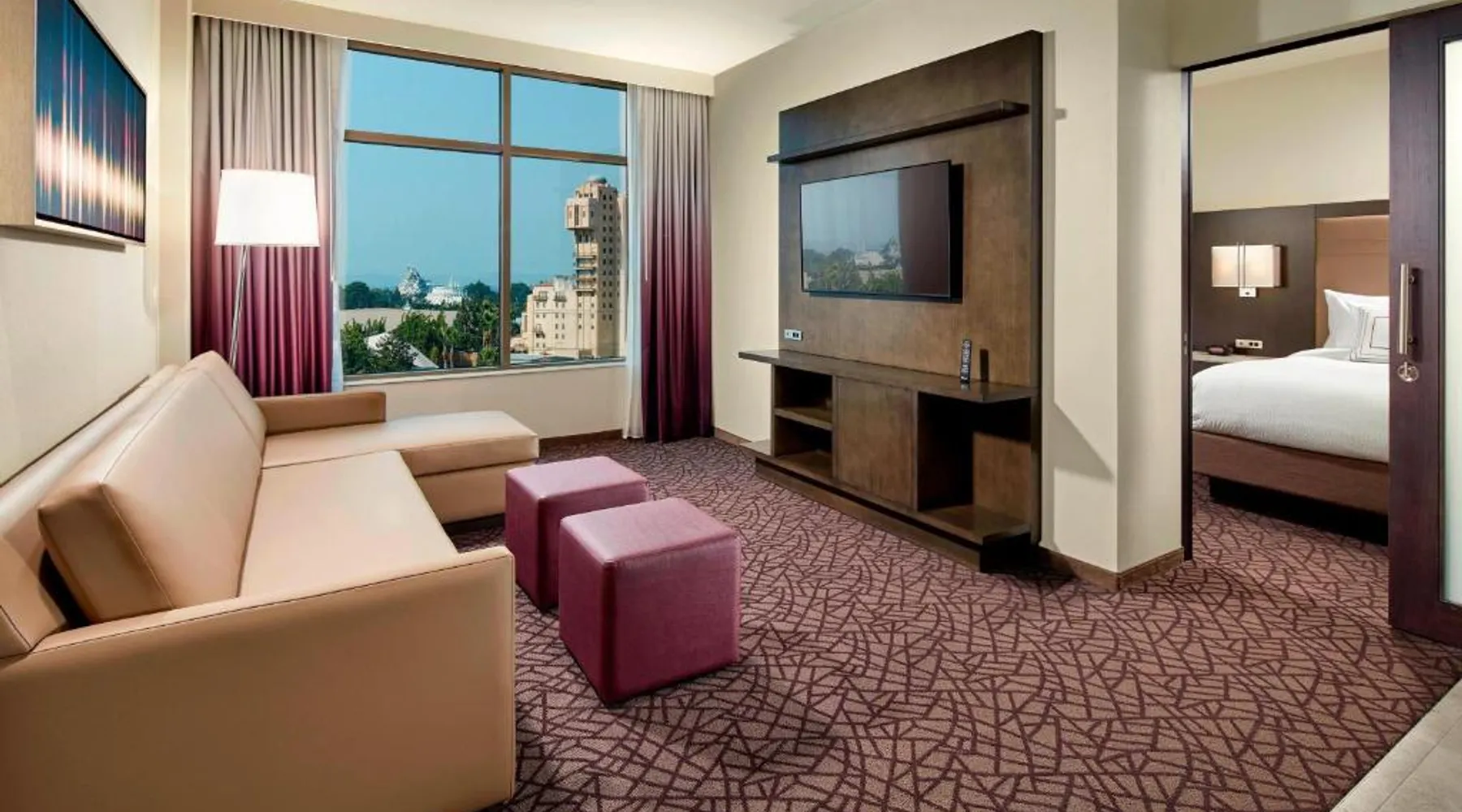 Just 1 mile from Disneyland Adventure Park'd entrance, this Residence Inn offers spacious rooms with a cable TV. It features a sun deck. All rooms are warmly decorated and are furnished with a seating area and granite bathroom counter tops. Disney themed suites are available. Each room has a fully equipped kitchen. The spacious studios, both the 1- and 2-bedroom suites, separate the living and sleeping areas. Kids' suites are brightly themed with bunk beds and bathroom. Guests can enjoy free access to the fitness center next to the hotel and the concierge desk is available to assist with tourism planning. Guests can also access the rooftop pool with cabanas. Daily breakfast is provided. A convenience store is located onsite. This Residence Inn offers 1 meeting room, 275 square feet. The Anaheim Convention Center is also 4 minutes walk from this hotel, and Riverview Golf Course is 4.6 miles away. The John Wayne Airport is 12 mi away. This suite features a living room, a satellite TV and a microwave and a stove top.
