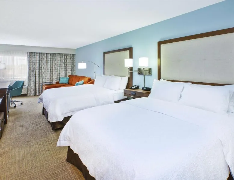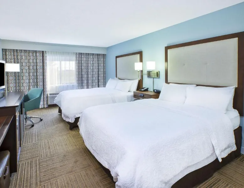 Comfortable Accommodations: Hampton Inn Gaylord in Gaylord offers family rooms with free WiFi, air-conditioning, and modern amenities. Each room includes a tea and coffee maker, hairdryer, free toiletries, shower, and TV. Leisure Facilities: Guests can enjoy a fitness center, indoor swimming pool, and a beautiful garden. Additional facilities include a lounge, fitness room, elevator, 24-hour front desk, electric vehicle charging station, and outdoor seating area. Dining Options: A continental buffet breakfast is served daily, featuring warm dishes, fresh pastries, and juice. Special diet menus are available, and daily housekeeping ensures room cleanliness. Location and Attractions: Located 50 mi from Pellston Regional Airport and 22 mi from Monument Golf Course, the hotel provides easy access to skiing and cycling activities. Guests appreciate the attentive staff and convenient location. This air conditioned room includes a flat-screen TV with premium channel. desk and coffee maker.