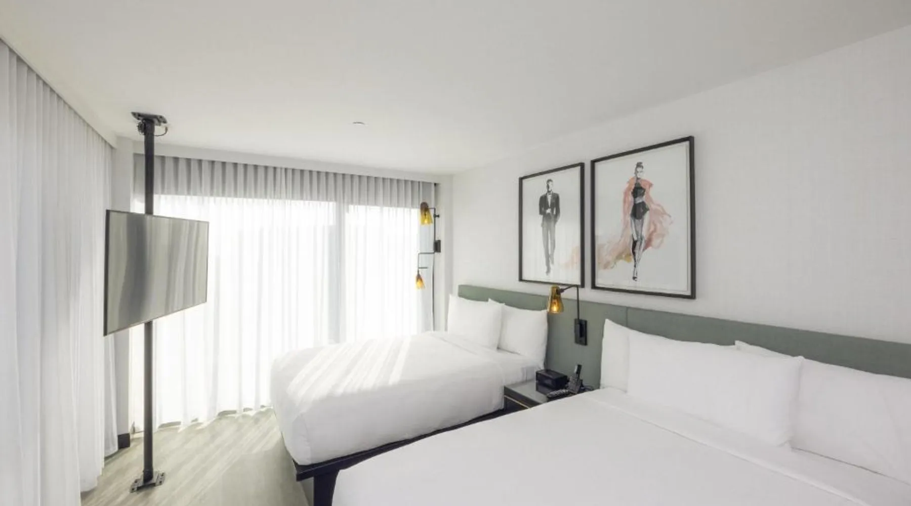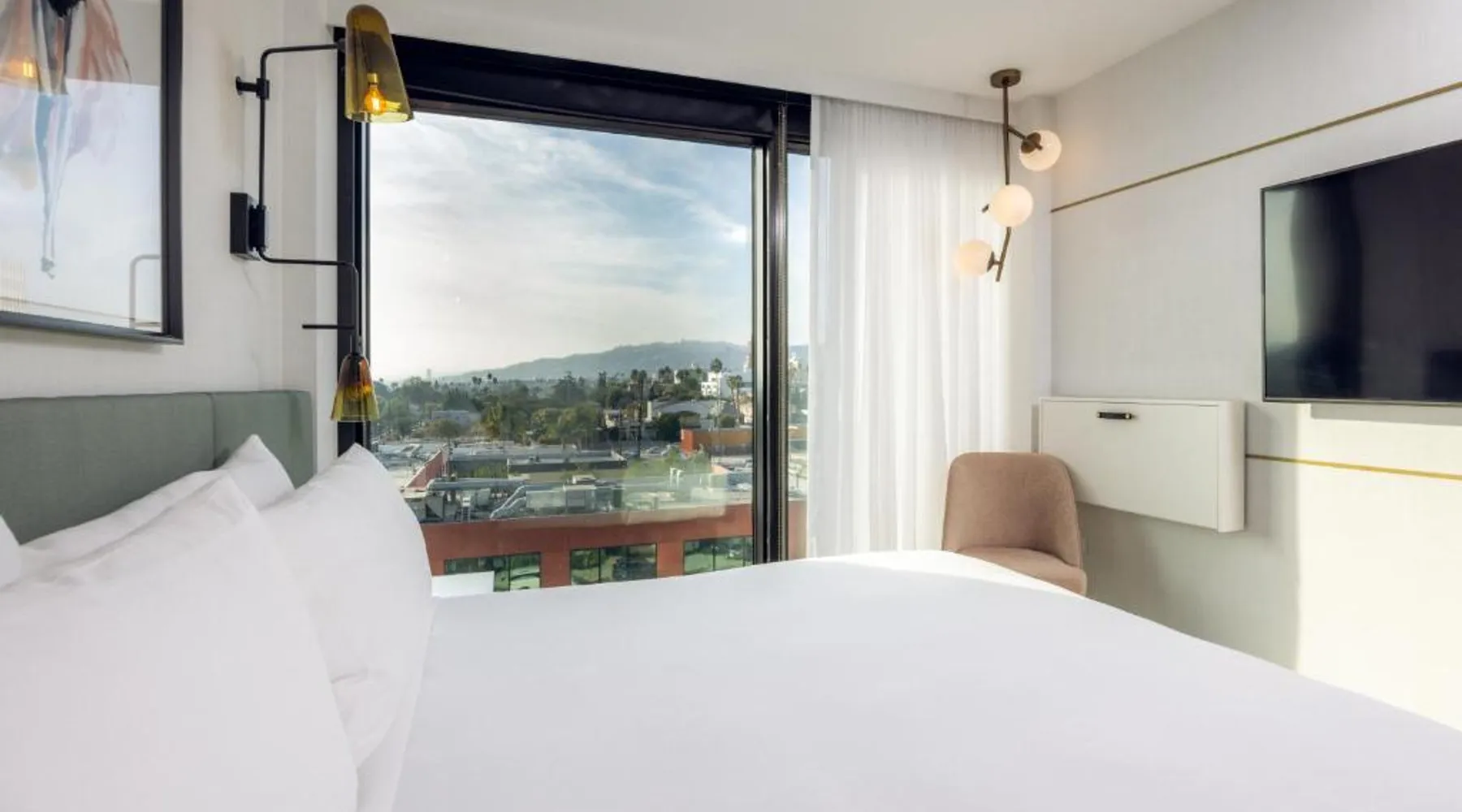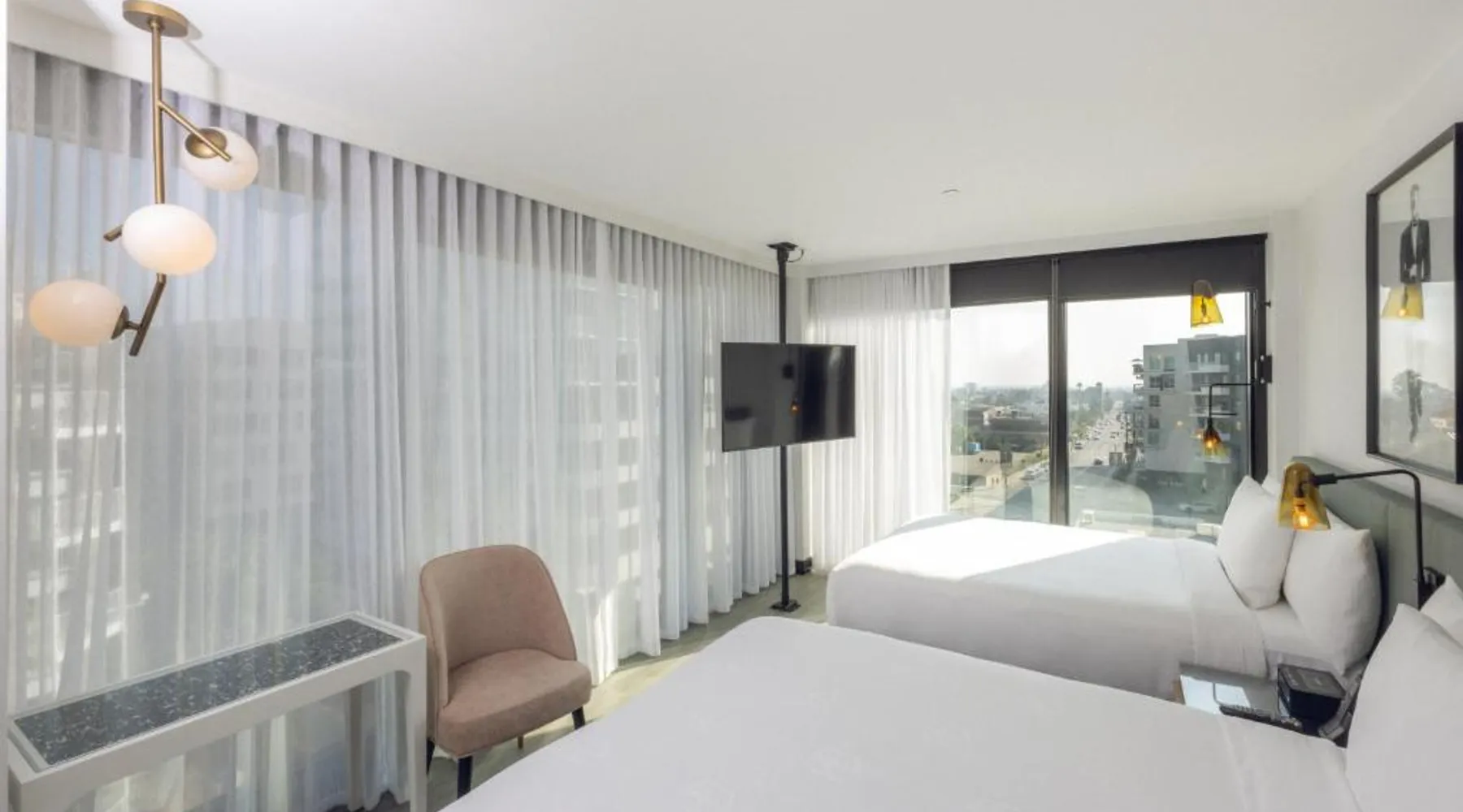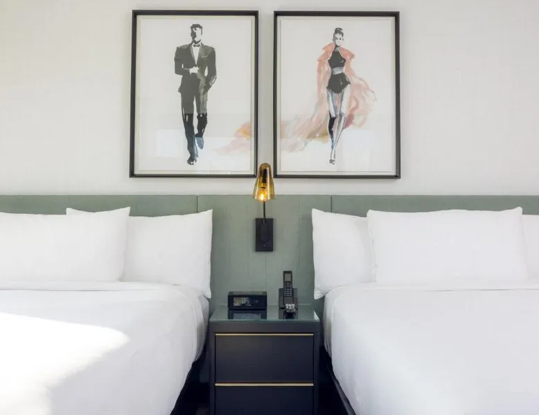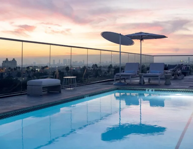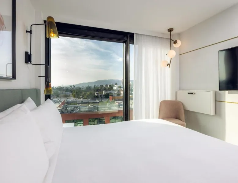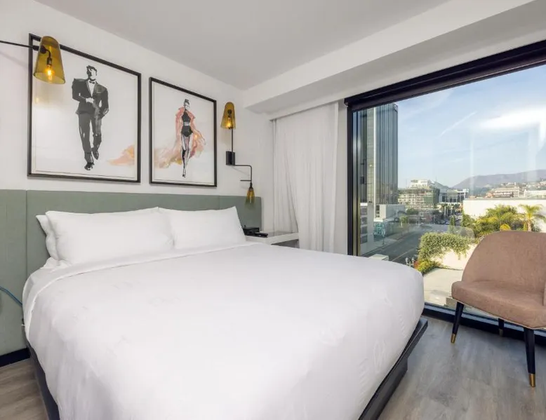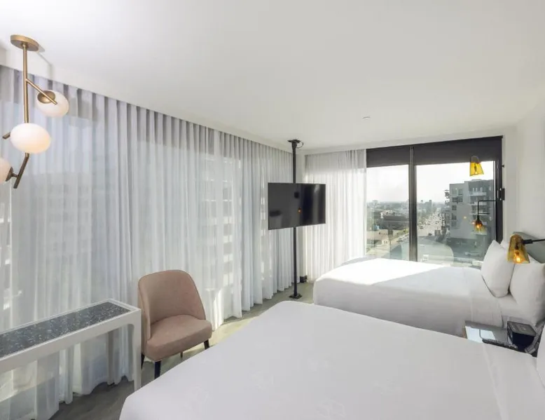 Elegant Accommodations: The Godfrey Hotel Hollywood in Los Angeles offers stylish rooms with air-conditioning, balconies, and modern amenities. Each room includes a private bathroom, work desk, and free WiFi. Exceptional Facilities: Guests can enjoy a swimming pool with a view, fitness center, sun terrace, restaurant, and bar. Additional facilities include a fitness room, 24-hour front desk, concierge service, and free toiletries. Dining Experience: The modern, family-friendly restaurant serves American cuisine for lunch and dinner, complemented by cocktails. Outdoor seating areas provide relaxing spaces. Prime Location: Located 7.5 mi from Hollywood Burbank Airport, the hotel is near attractions such as Capitol Records Building (less than 0.6 mi) and Dolby Theater (1.2 mi). Guests appreciate the rooftop pool, bar, and convenient location. Featuring free toiletries and bathrobes, this quadruple room includes a private bathroom with a walk-in shower and a hairdryer. The air-conditioned quadruple room features a flat-screen TV, a tea and coffee maker, a safe deposit box, tumble dryer as well as city views. The unit has 2 beds.