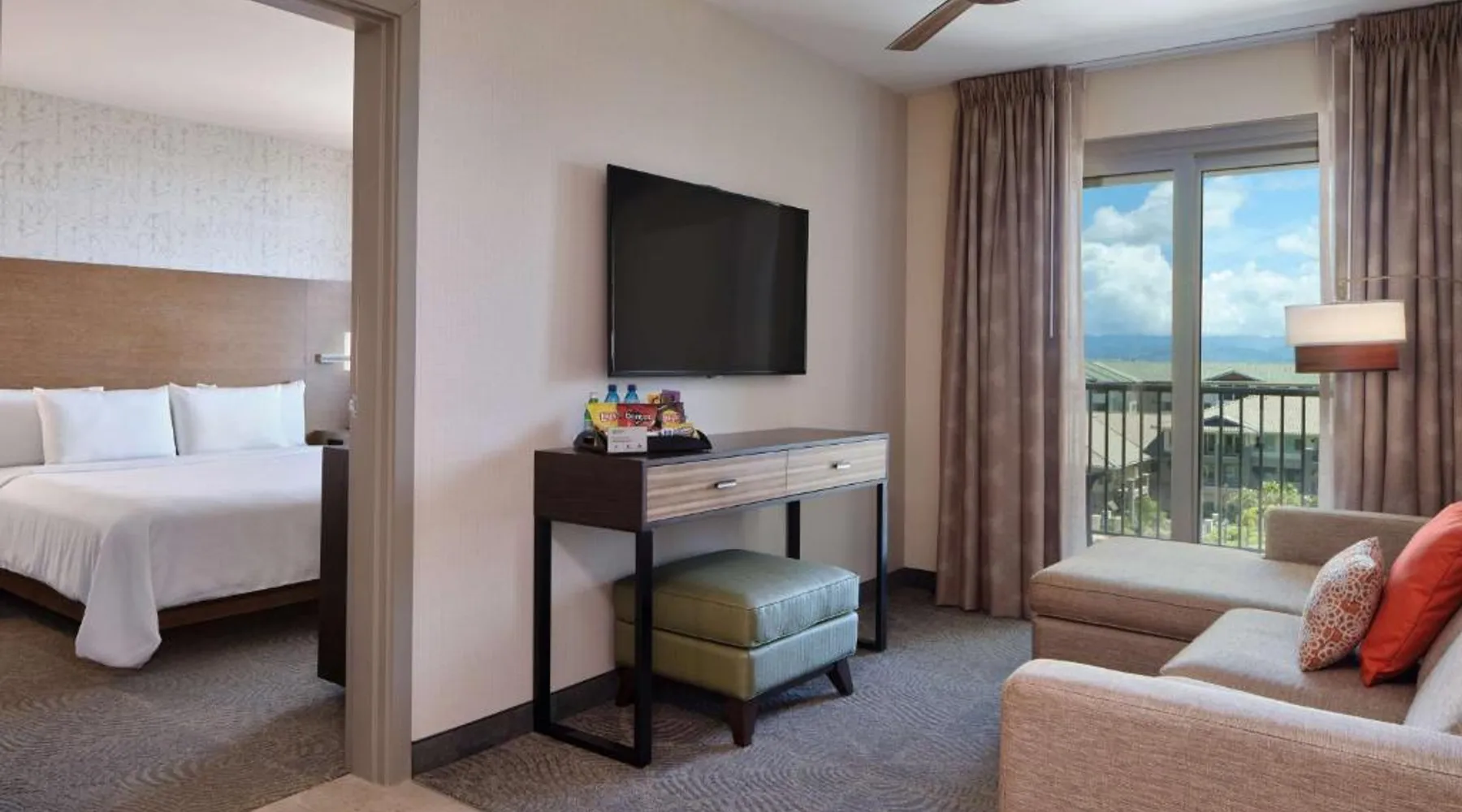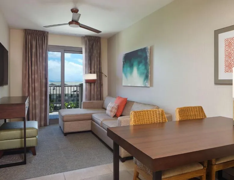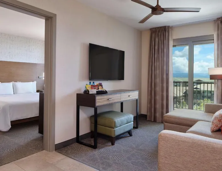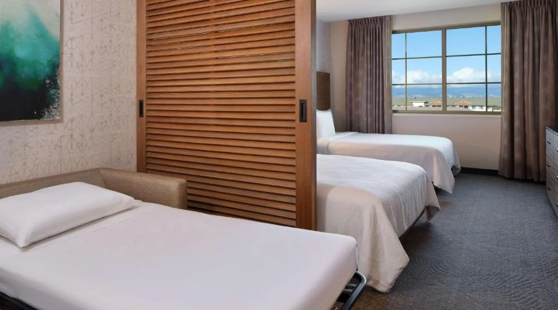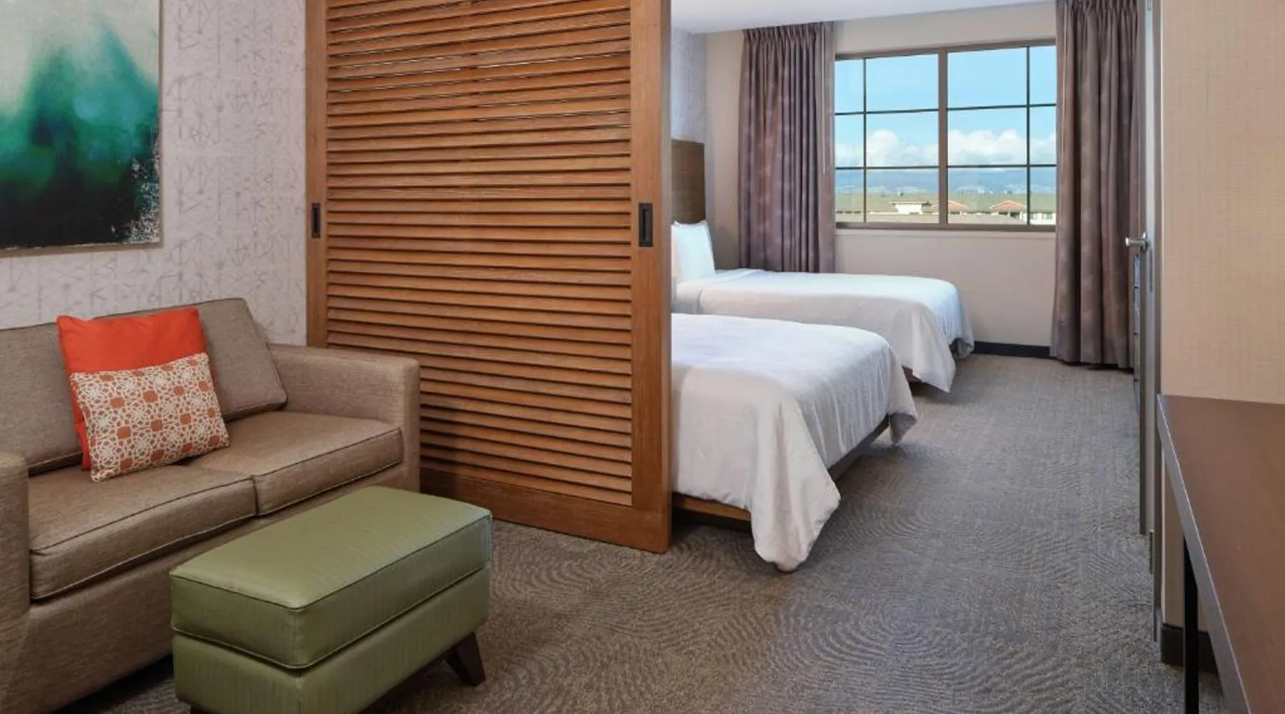 Comfortable Accommodations: Embassy Suites By Hilton Oahu Kapolei in Kapolei offers family rooms with balconies, private bathrooms, and modern amenities. Each room includes air-conditioning, a work desk, and free WiFi. Dining and Leisure: Guests can enjoy a swimming pool with a view, fitness center, restaurant, and bar. The family-friendly restaurant serves American, Japanese, and local cuisines, offering lunch, dinner, and cocktails. Breakfast includes local specialties, fresh pastries, and a hot tub. Convenient Location: Located 17 mi from Honolulu International Airport, the hotel is near attractions such as USS Bowfin Submarine Museum & Park (14 mi) and Pearl Harbor (14 mi). Free on-site parking and a 24-hour front desk enhance the stay. This studio is air-conditioned and features a flat-screen TV with cable channels, a tea and coffee maker, a seating area and a safe deposit box. The unit offers 2 beds.