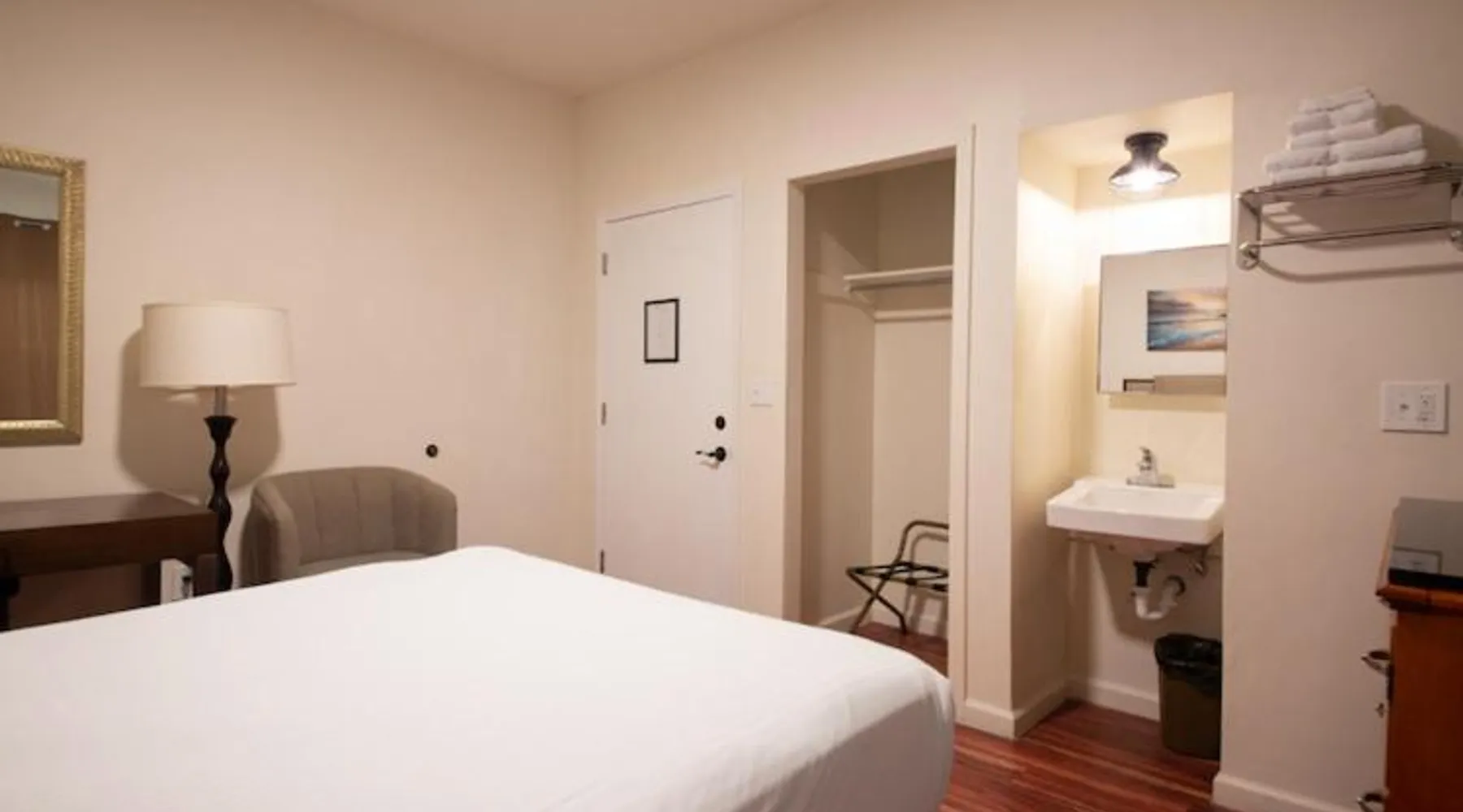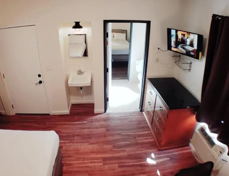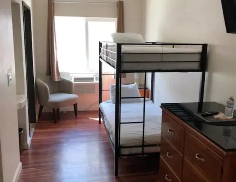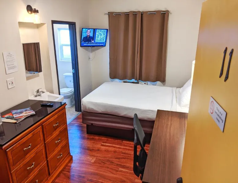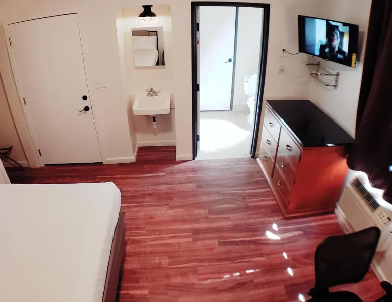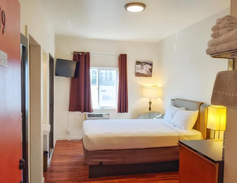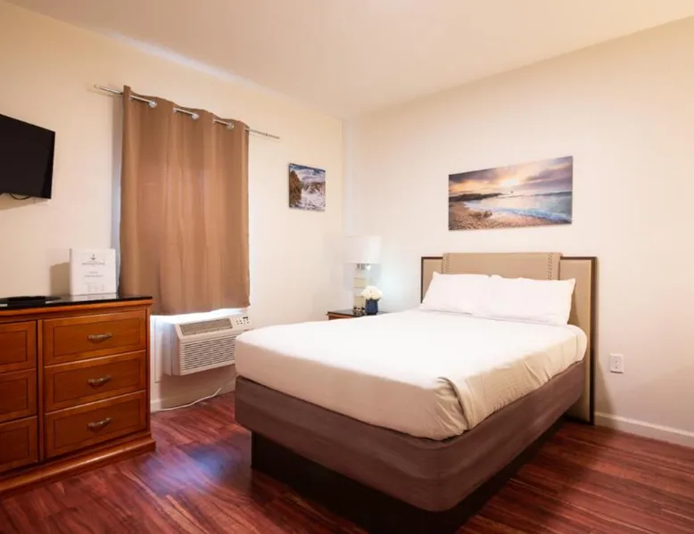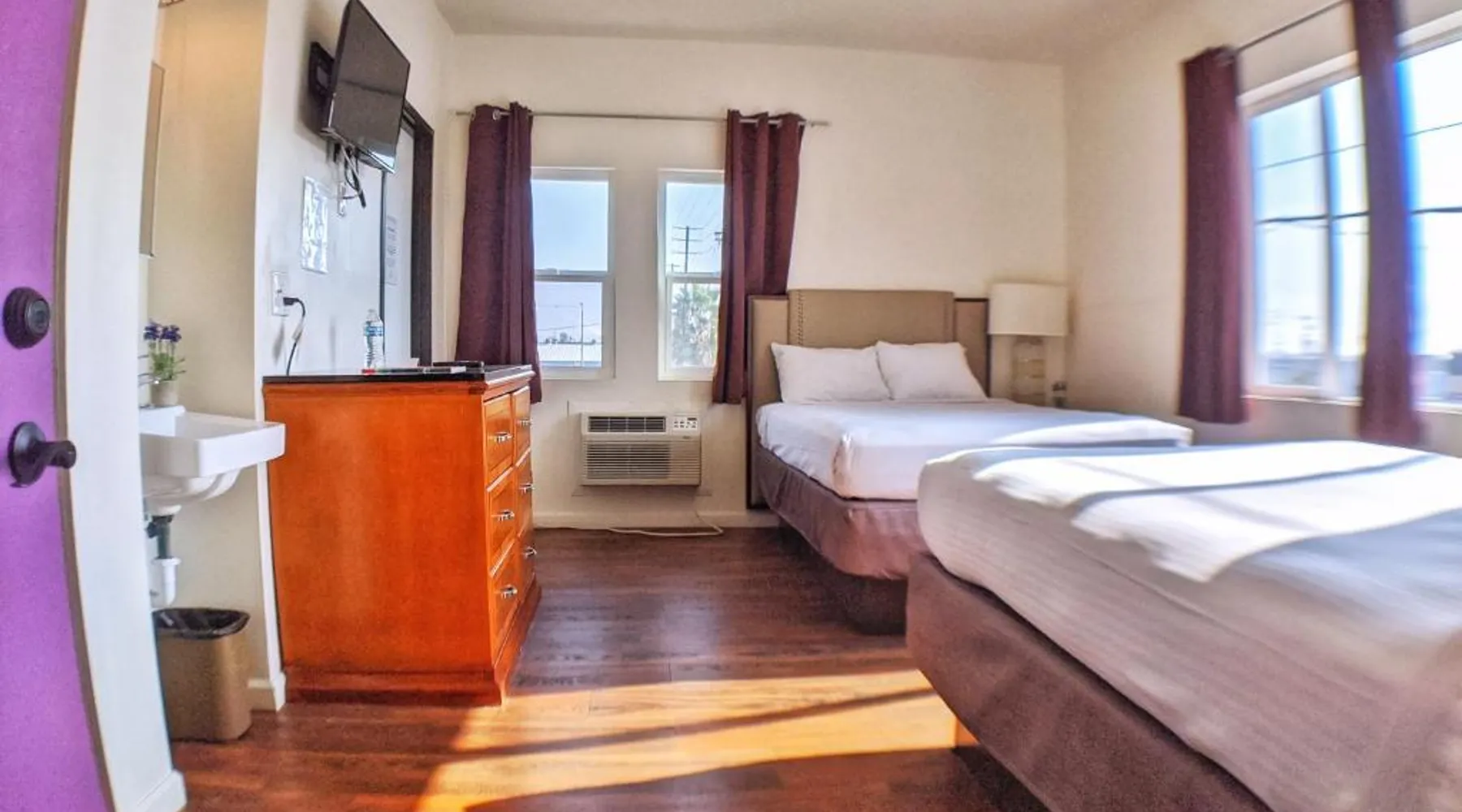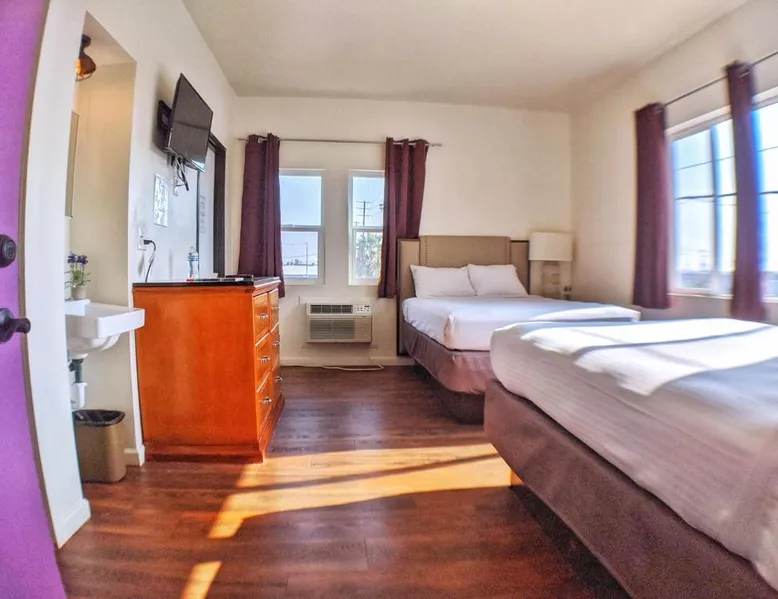Comfortable Accommodations: Anchor Pointe Inn in Los Angeles offers air-conditioned rooms with private bathrooms, free WiFi, and parquet floors. Each room includes a refrigerator, TV, and wardrobe. Convenient Facilities: Guests can enjoy a lounge, outdoor seating area, and express check-in and check-out services. Additional amenities include a washing machine, work desk, and dressing room. Prime Location: Located 8.7 mi from Long Beach Airport, the inn is near attractions such as Battleship Iowa Museum (4.3 mi), Queen Mary (6.2 mi), and Venice Beach Boardwalk (25 mi). Guest Satisfaction: Guests appreciate the attentive staff, room cleanliness, and excellent value for money. This double room features a flat screen TV and air conditioning. Free coffee in morning at front desk.