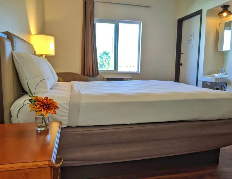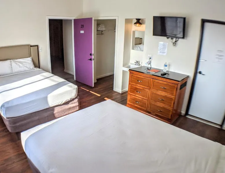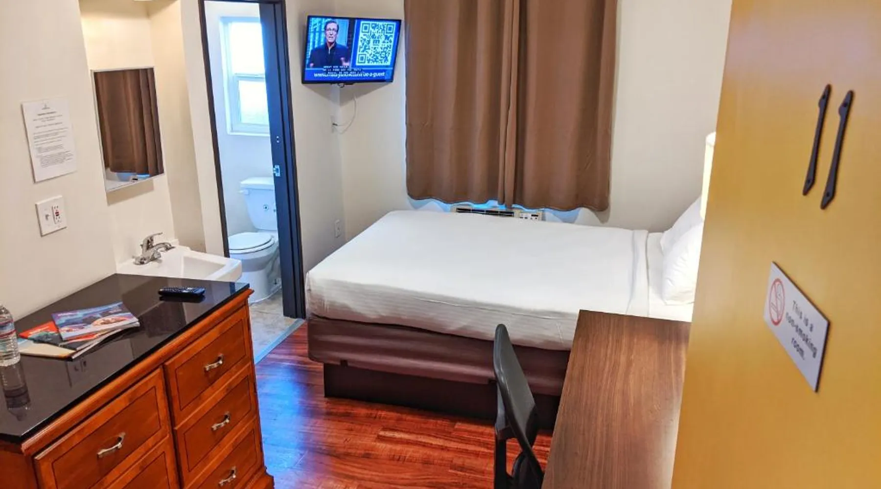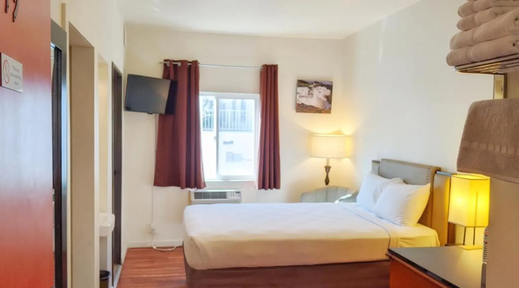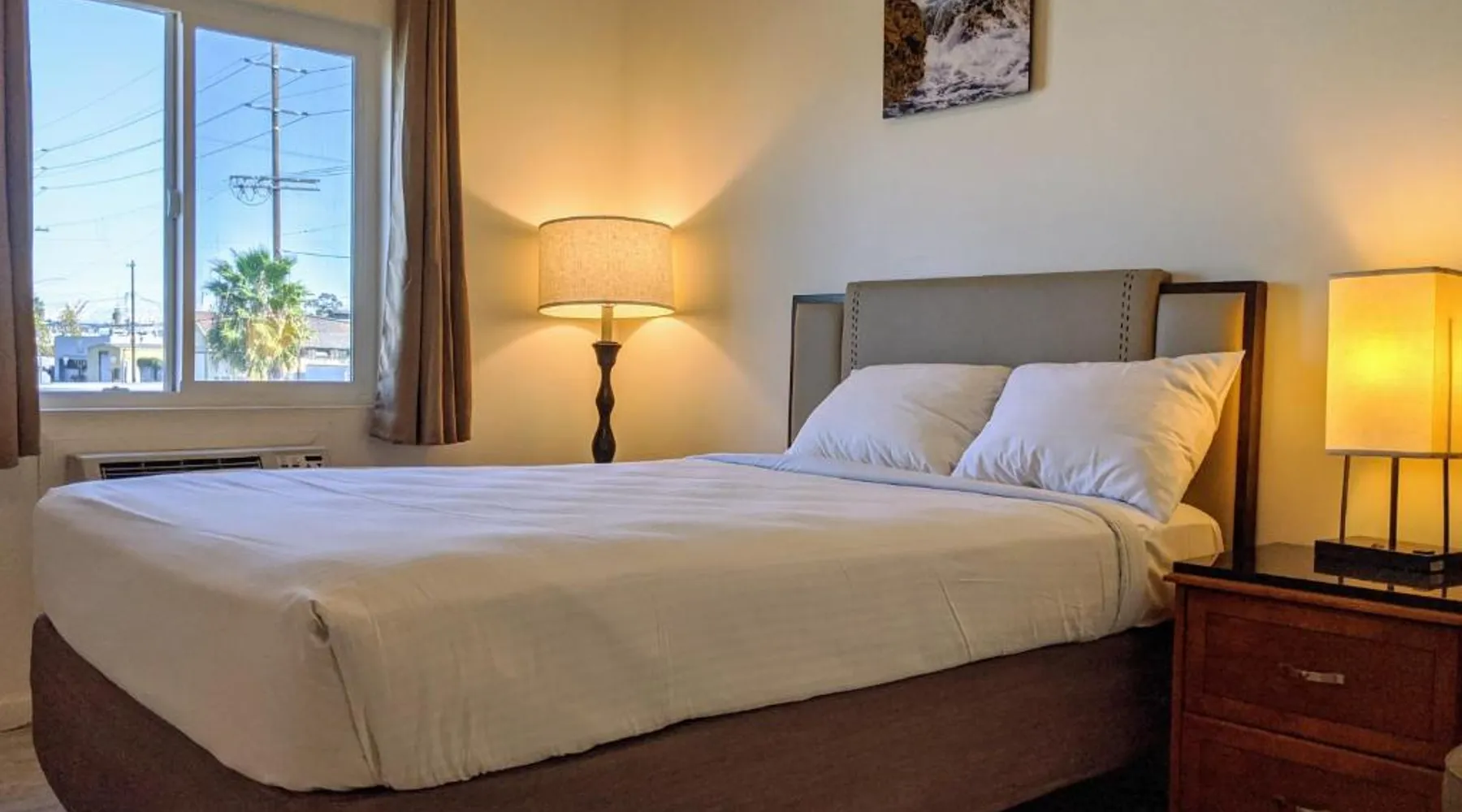 Comfortable Accommodations: Anchor Pointe Inn in Los Angeles offers air-conditioned rooms with private bathrooms, free WiFi, and parquet floors. Each room includes a refrigerator, TV, and wardrobe. Convenient Facilities: Guests can enjoy a lounge, outdoor seating area, and express check-in and check-out services. Additional amenities include a washing machine, work desk, and dressing room. Prime Location: Located 8.7 mi from Long Beach Airport, the inn is near attractions such as Battleship Iowa Museum (4.3 mi), Queen Mary (6.2 mi), and Venice Beach Boardwalk (25 mi). Guest Satisfaction: Guests appreciate the attentive staff, room cleanliness, and excellent value for money. This double room features a flat screen TV and air conditioning. Free coffee in morning at front desk.