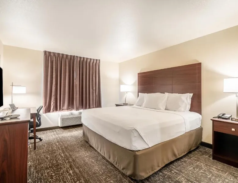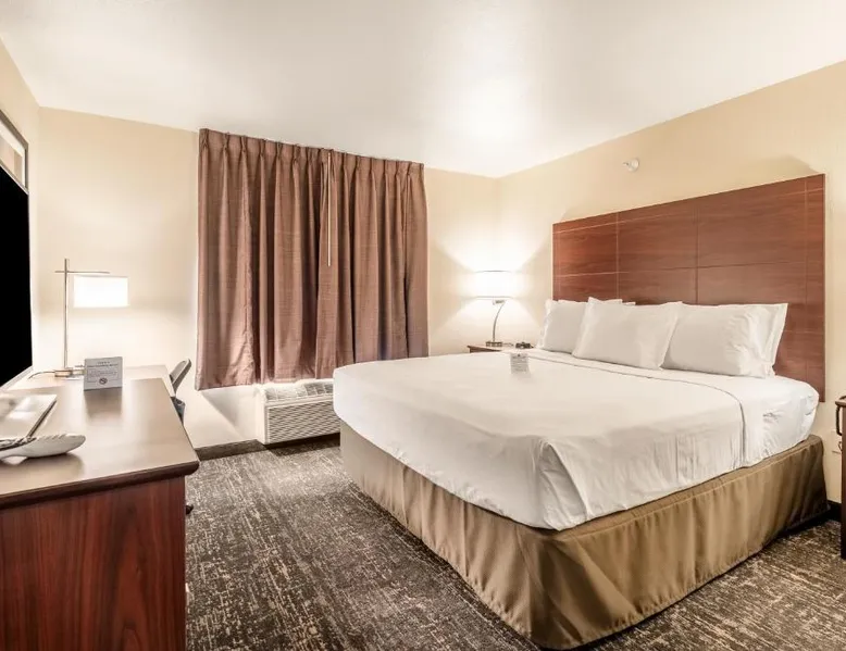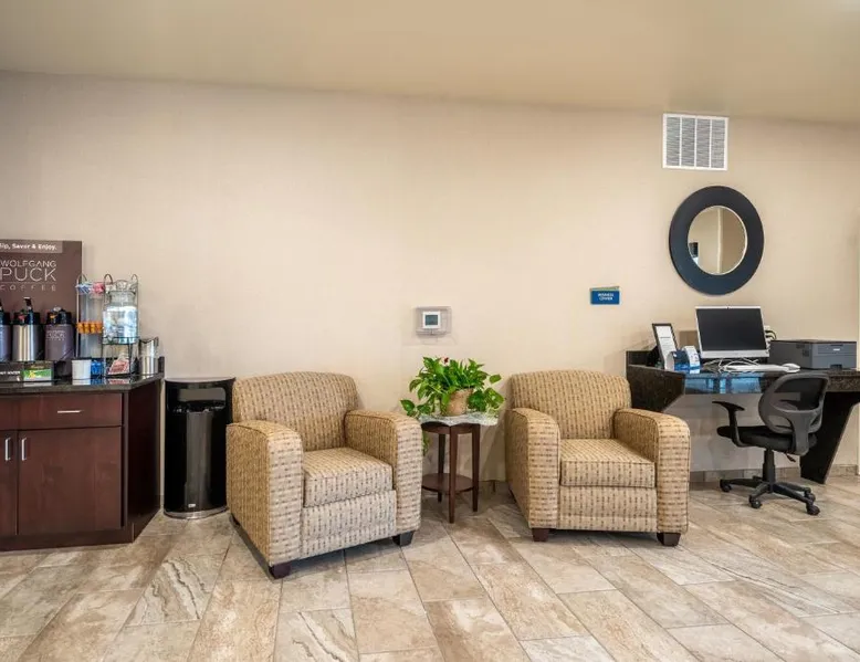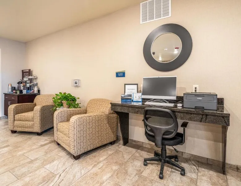 Comfortable Accommodations: Cobblestone Inn & Suites - Kermit in Kermit offers comfortable rooms with air-conditioning, free WiFi, and essential amenities such as a microwave and refrigerator. Facilities and Services: Guests can enjoy a fitness center, lounge, and outdoor seating area. The hotel provides free on-site parking, a 24-hour front desk, and a business area. Dining Options: A continental buffet breakfast is served daily, and a minimarket is available for convenience. Location and Attractions: Located 46 mi from Odessa-Schlemeyer Field, the hotel is highly rated for its attentive staff and excellent service support. The suite provides air conditioning and a coffee machine.