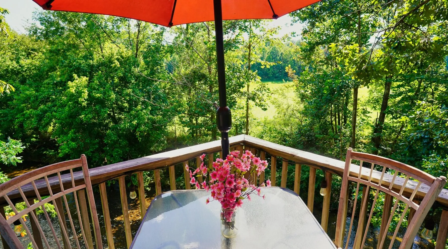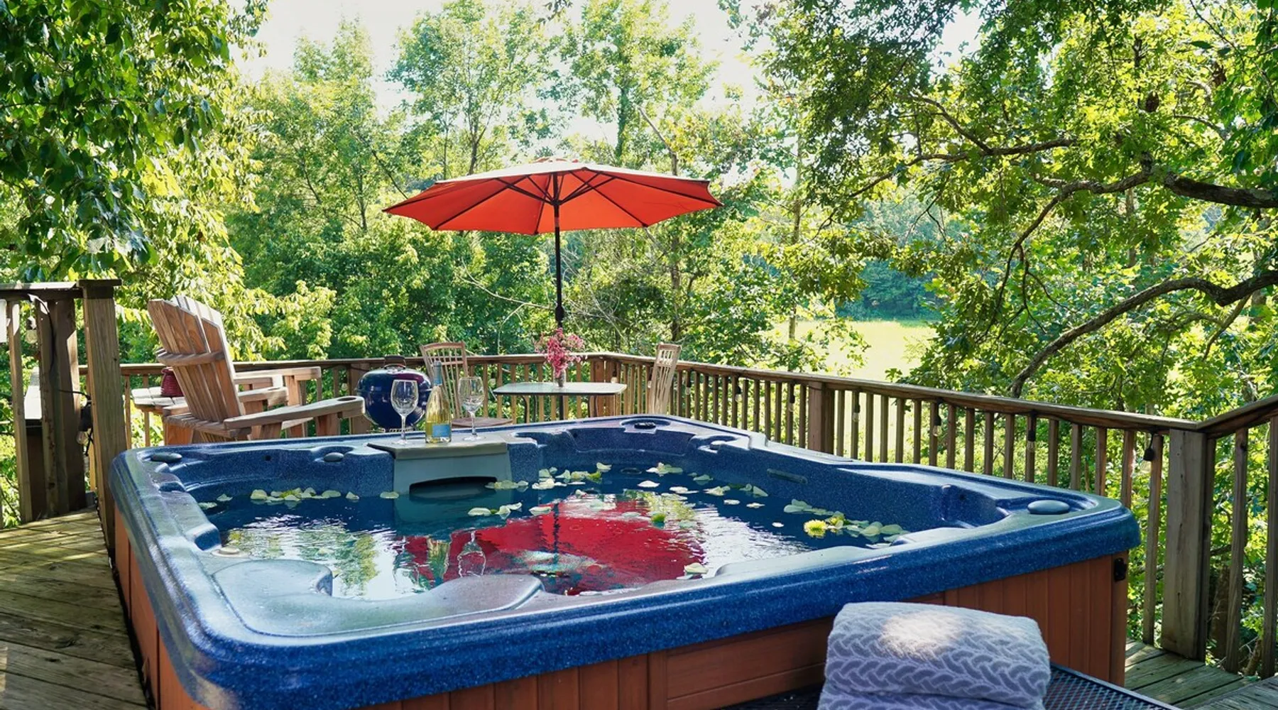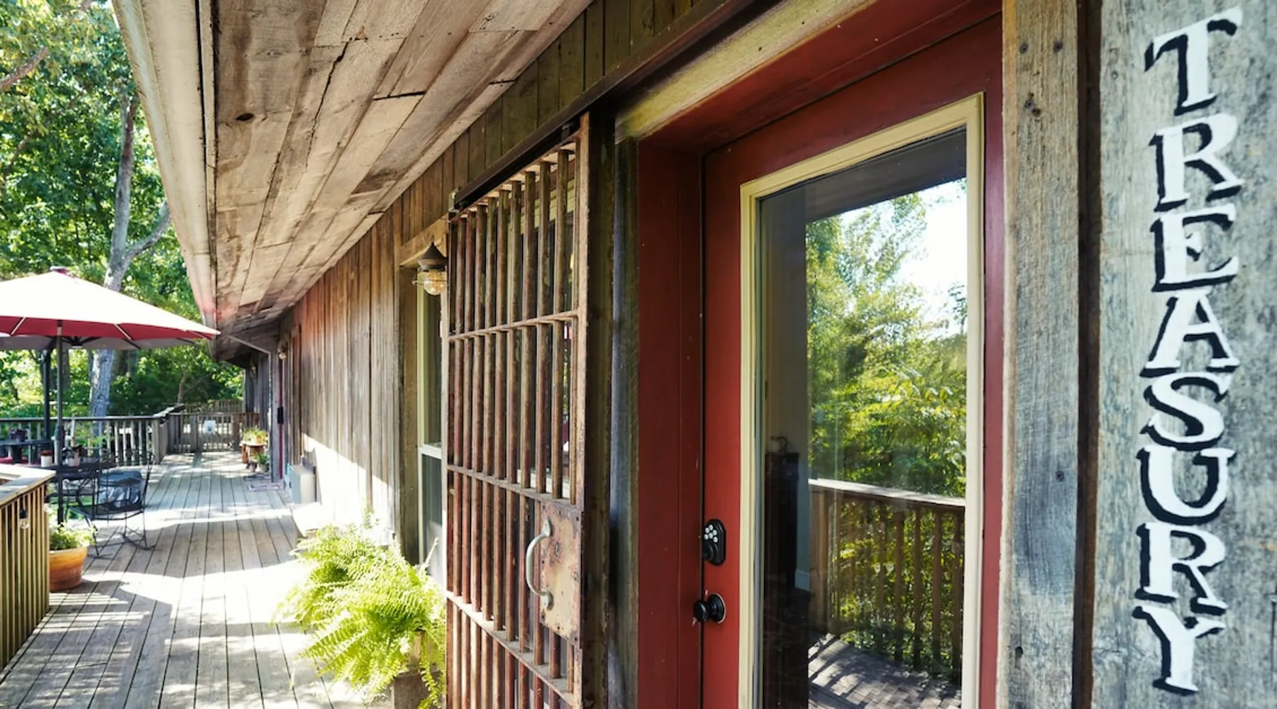 This fabulous room is our newest remodeled room. It has the original springfield Jail bar door on the exterior. We figured you wouldn’t want to spend the night in jail so we call it the treasury. Our guests are treasures. The space Picture of a room with a beautiful deck overlooking the Carr creek. Huge six person hot tub that you can unwind and soak to you’re hearts content. Please note we have seven hot tubs on our property. Five of the properties for rent here have private unshared hot tubs. The treasury hot tub is shared dependingg on occupancy. Look up Kelly’s jubilee to see the list of properties with unshared tubs and inquire on how to receive a discount code. Like to grill, there is a nice Webber to create the perfect meal to complete this experience. Inside you will find a gorgeous space with a king size bed and plush bedding. The room is equipped with A mini fridge, microwave, toaster, brew type coffee maker ( we even provide the fresh ground coffee). Relax, watch movies on a large screen tv stay inside and play games on a rainy day or hike and explore the 55 acre farm. We have around 50 chickens to visit. Some of them are rare breeds and quite lovely. The land is lush with plants trees and flowers. Many animals and birds thrive here at Kelly’s Jubilee. Including a family of river otters ❤️. I’ve seen groundhogs, foxes, Tennessee mink, deer, raccoons, possums, (which are very good animals to have around), wild turkeys, hawks, eagles, Great blue herons, owls, Canadian Honker, and all of the normal song birds including the most cardinals that I have ever seen in one place. Other things to note Please note we require a rental contact to be signed after booking via SignRequest.