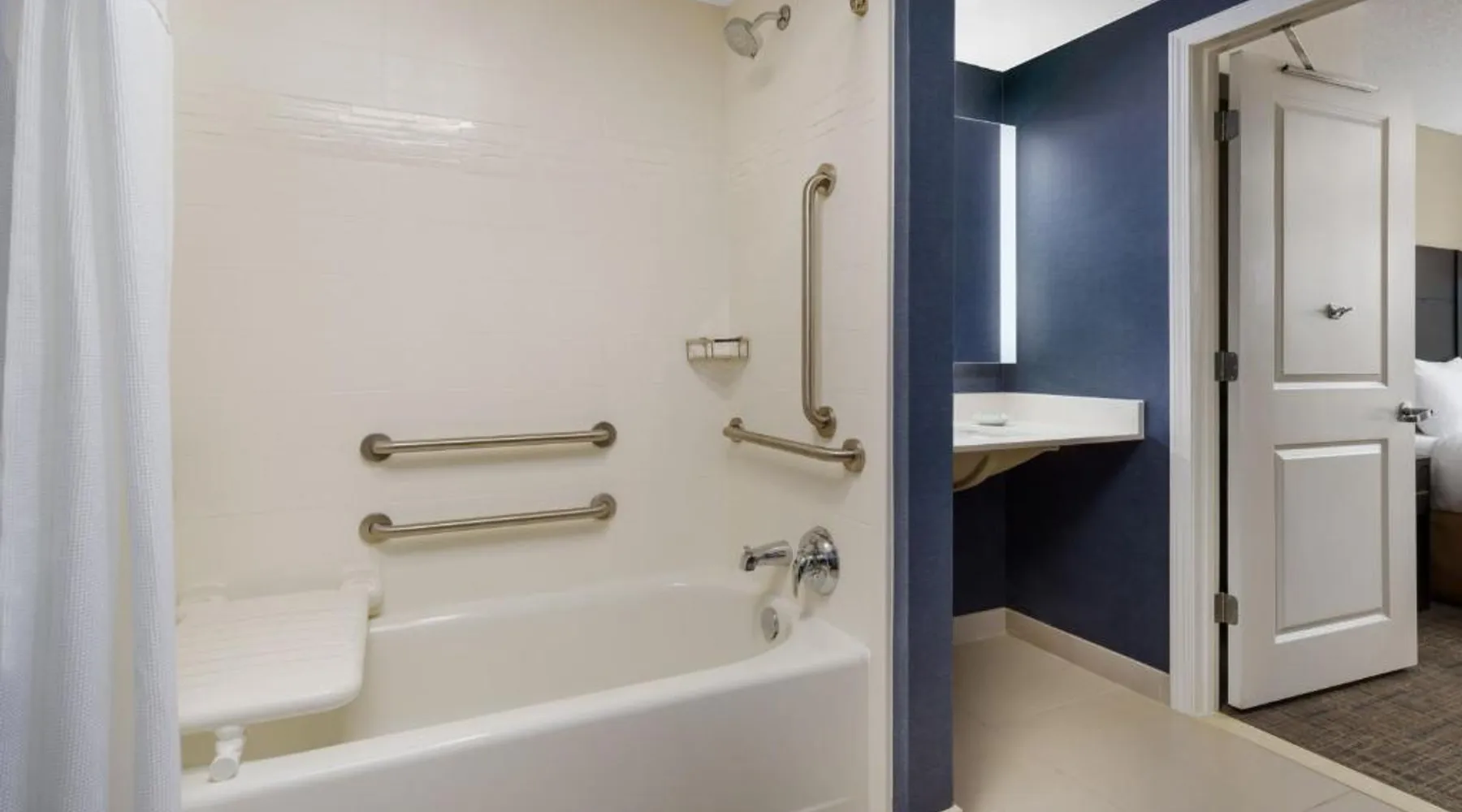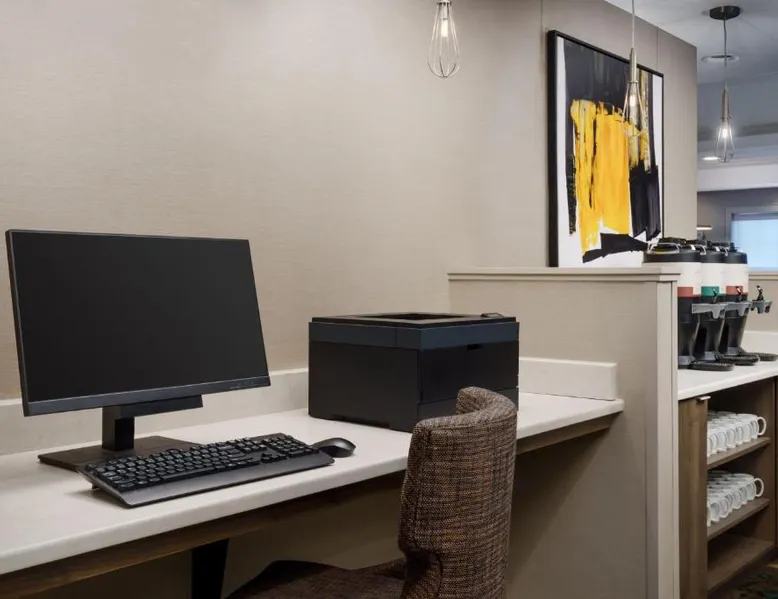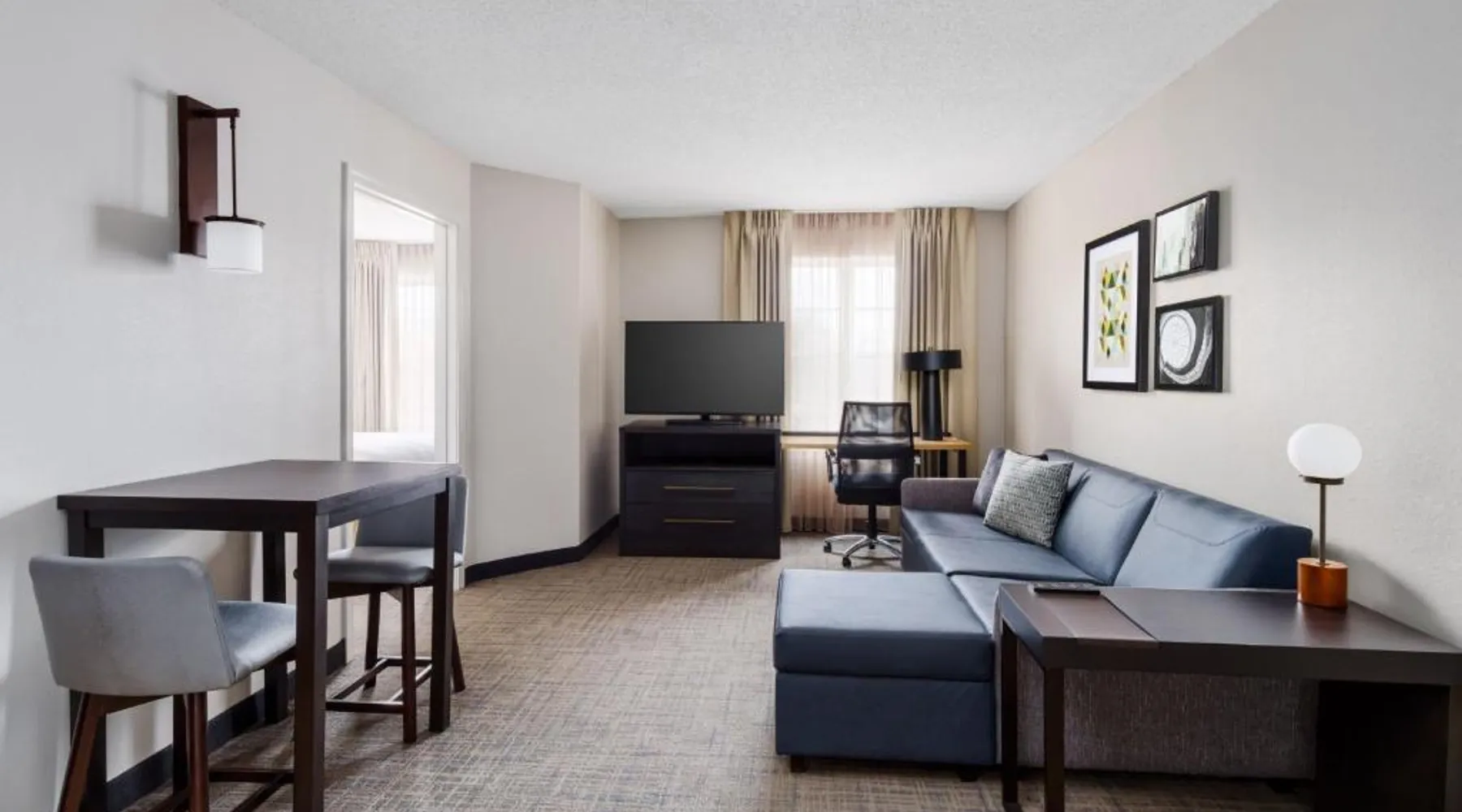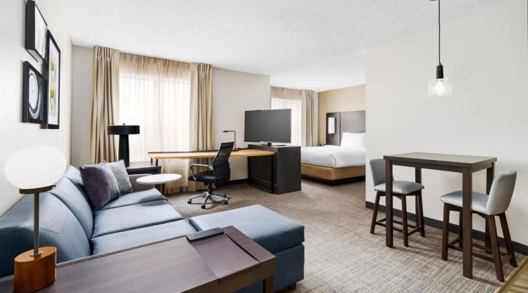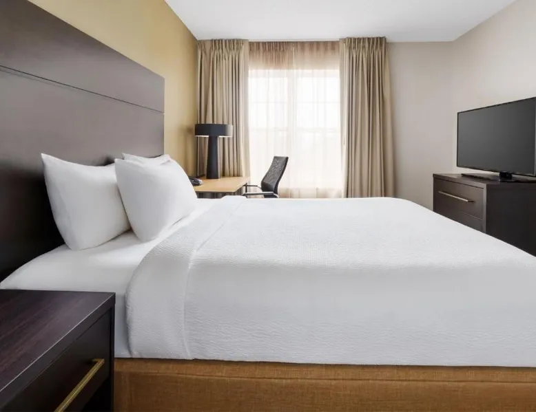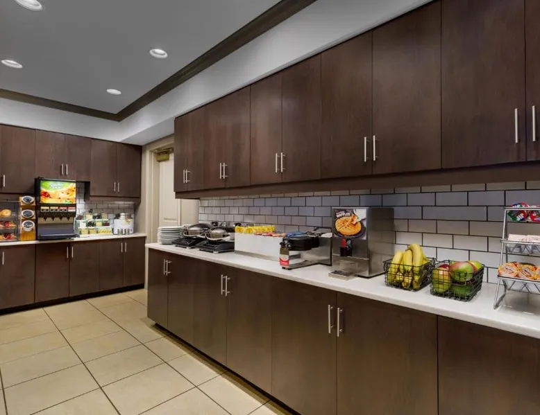 Comfortable Accommodations: Residence Inn Hartford Rocky Hill in Rocky Hill offers family rooms with air-conditioning, private bathrooms, and free WiFi. Each room includes a work desk, seating area, and a kitchenette equipped with a refrigerator, microwave, and dishwasher. Leisure Facilities: Guests can enjoy a fitness center, indoor swimming pool, and outdoor fireplace. Additional amenities include a fitness room, outdoor seating area, and barbecue facilities. Free on-site private parking is available. Dining Options: A complimentary American buffet breakfast is served daily. The hotel also features a business area and outdoor dining space. Location and Attractions: Located 23 mi from Bradley International Airport, the hotel is near Trinity College and Wesleyan University (8.1 mi), Wadsworth Atheneum (9.9 mi), and Mark Twain House (11 mi). Suite offers a fully equipped kitchen, guest bathroom and a fireplace.